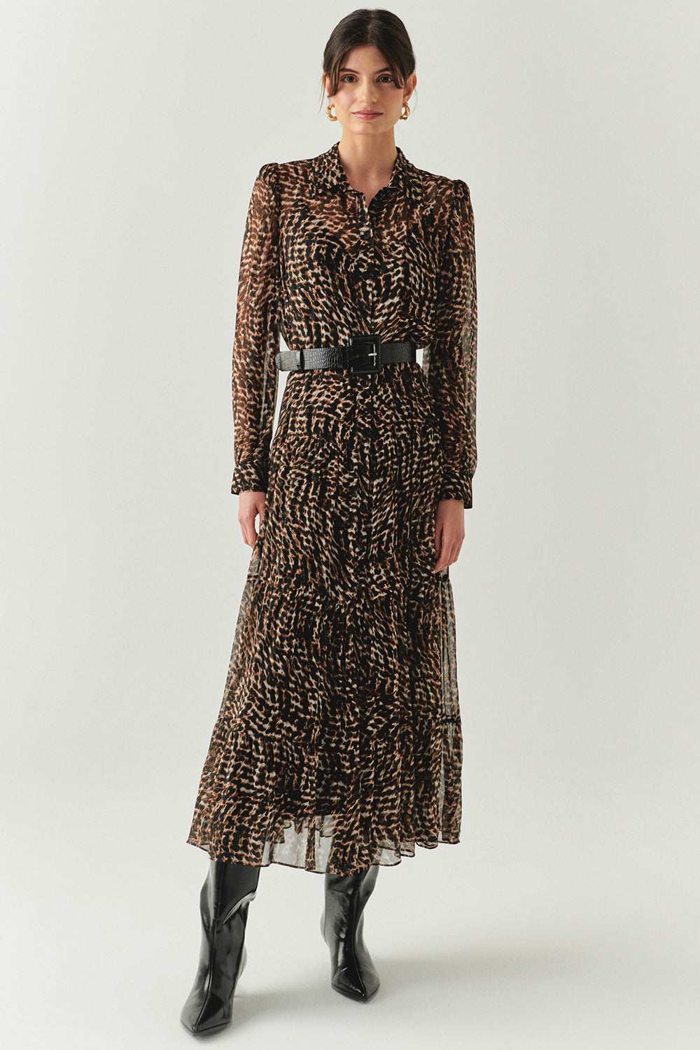 Belden oturtmalı kemer detayıyla feminen bir siluet kazandıran bu elbise, leopar esintili çok renkli deseniyle iddialı bir tarz sunar. Astarlı yapısı sayesinde konforlu bir kullanım sağlarken, hafif transparan uzun kolları tasarıma zarif bir dokunuş katar. Diz altına kadar uzanan midi boyu ve akışkan dokusu ile hem gündüz hem de akşam kombinlerinde modern ve çarpıcı bir görünüm oluşturur.