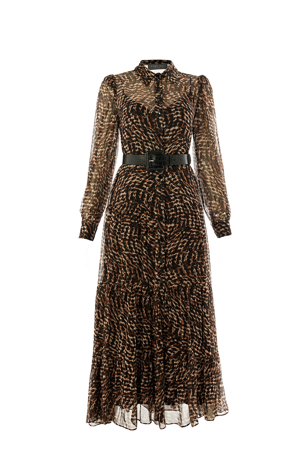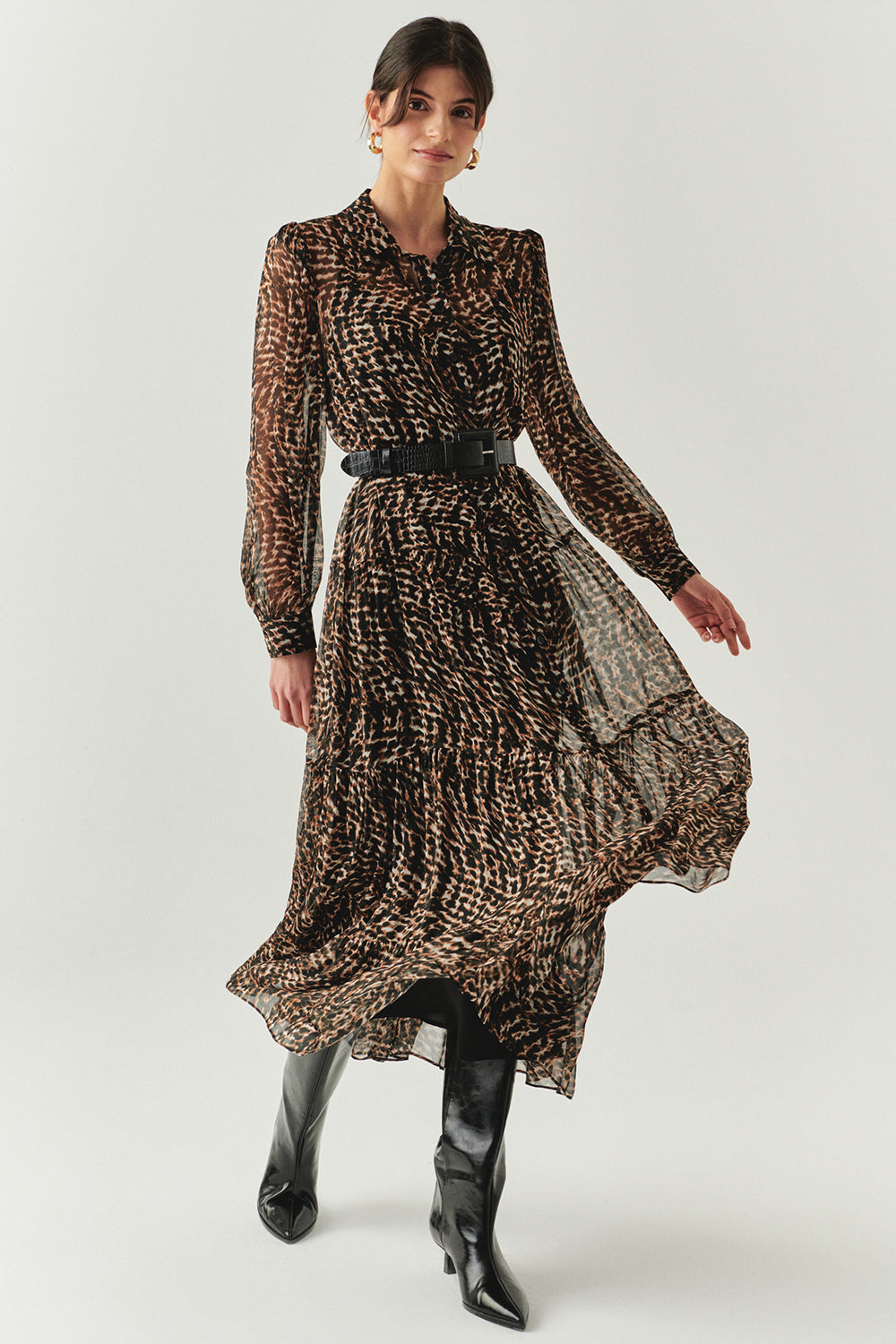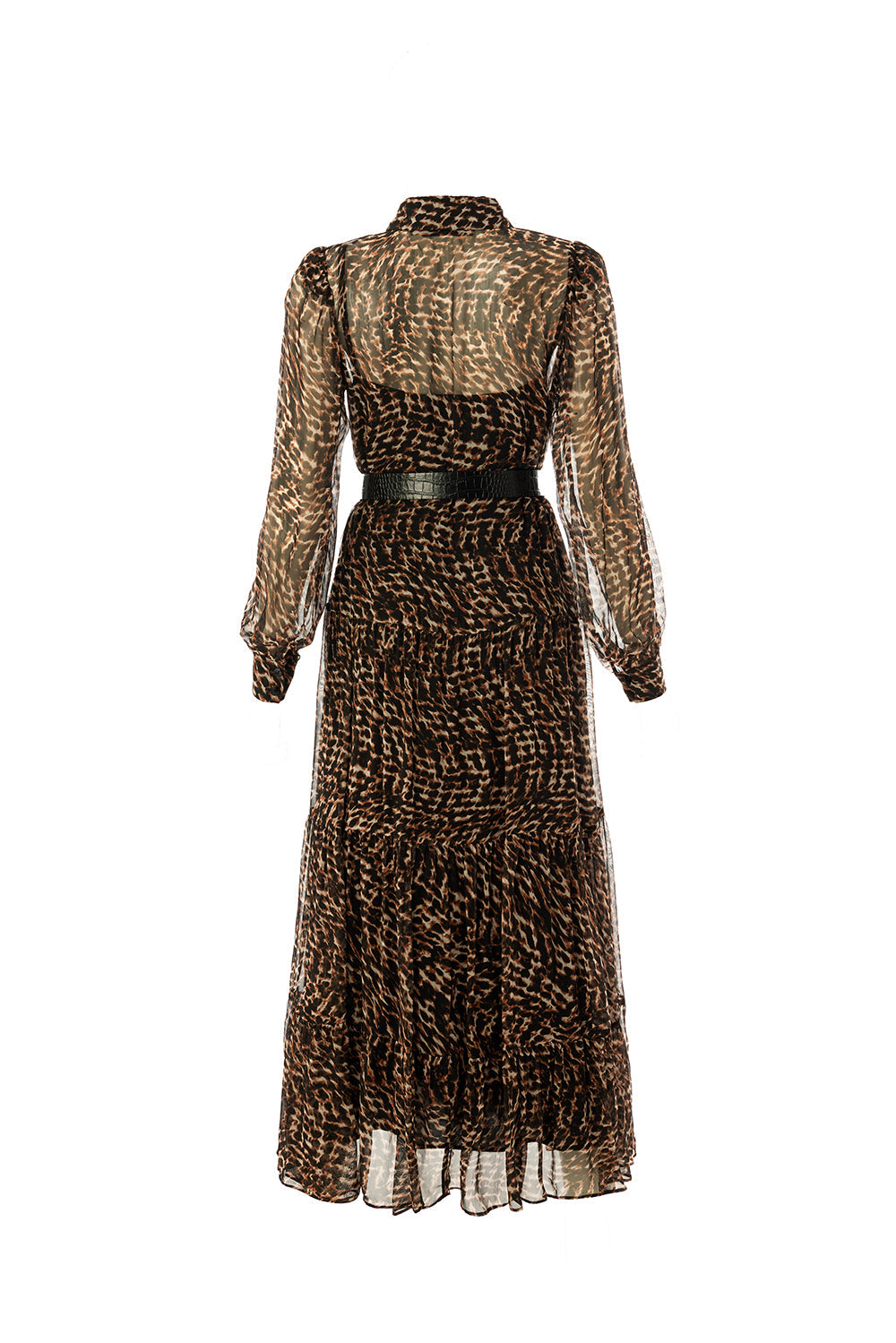 Leopar Desen Uzun Kollu Kemerli Astarlı Regular Midi Elbise