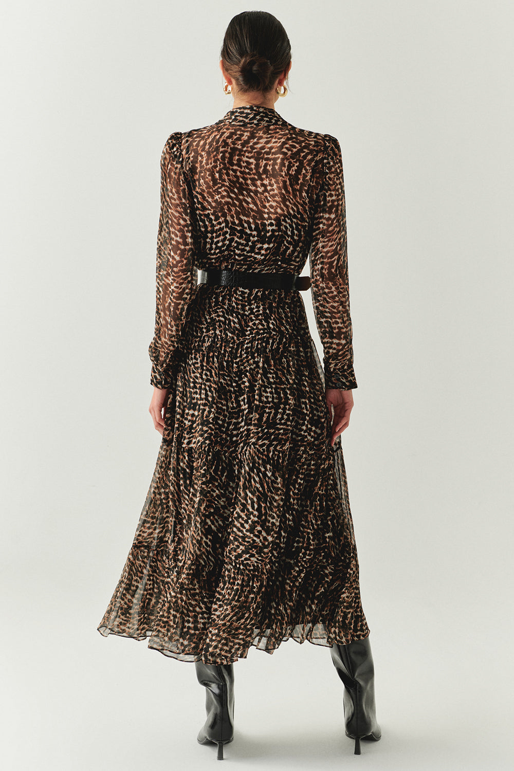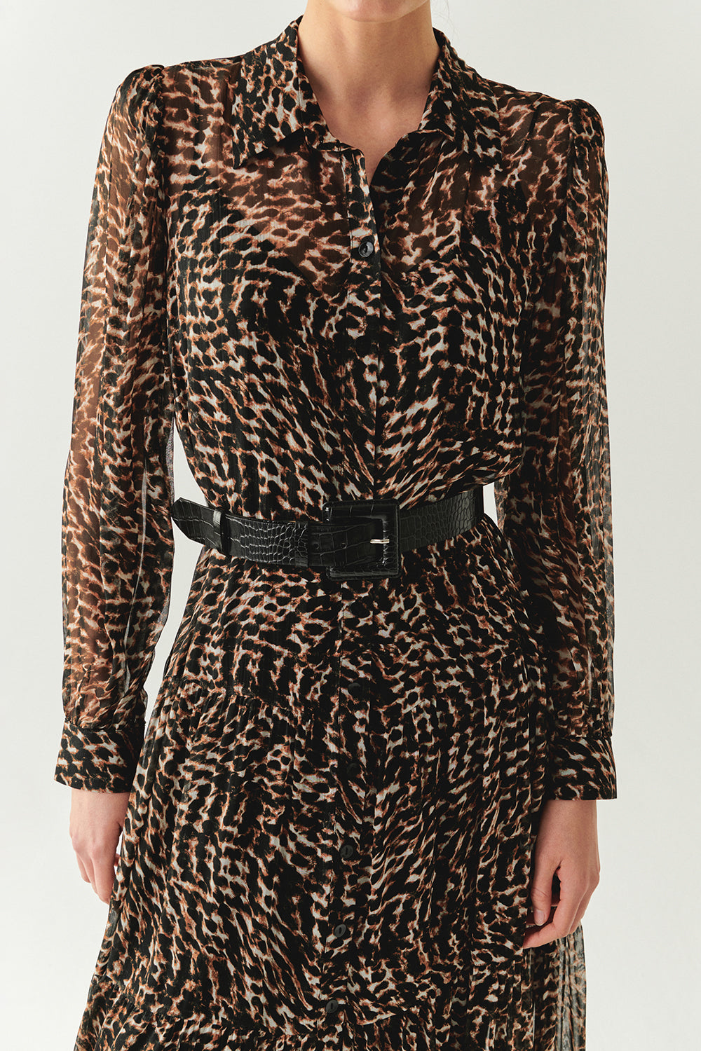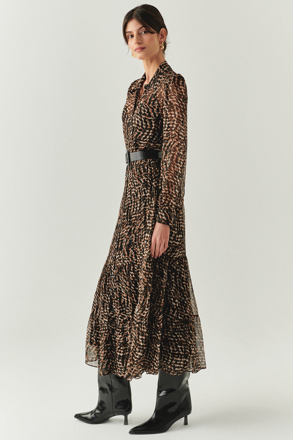 Leopar Desen Uzun Kollu Kemerli Astarlı Regular Midi Elbise