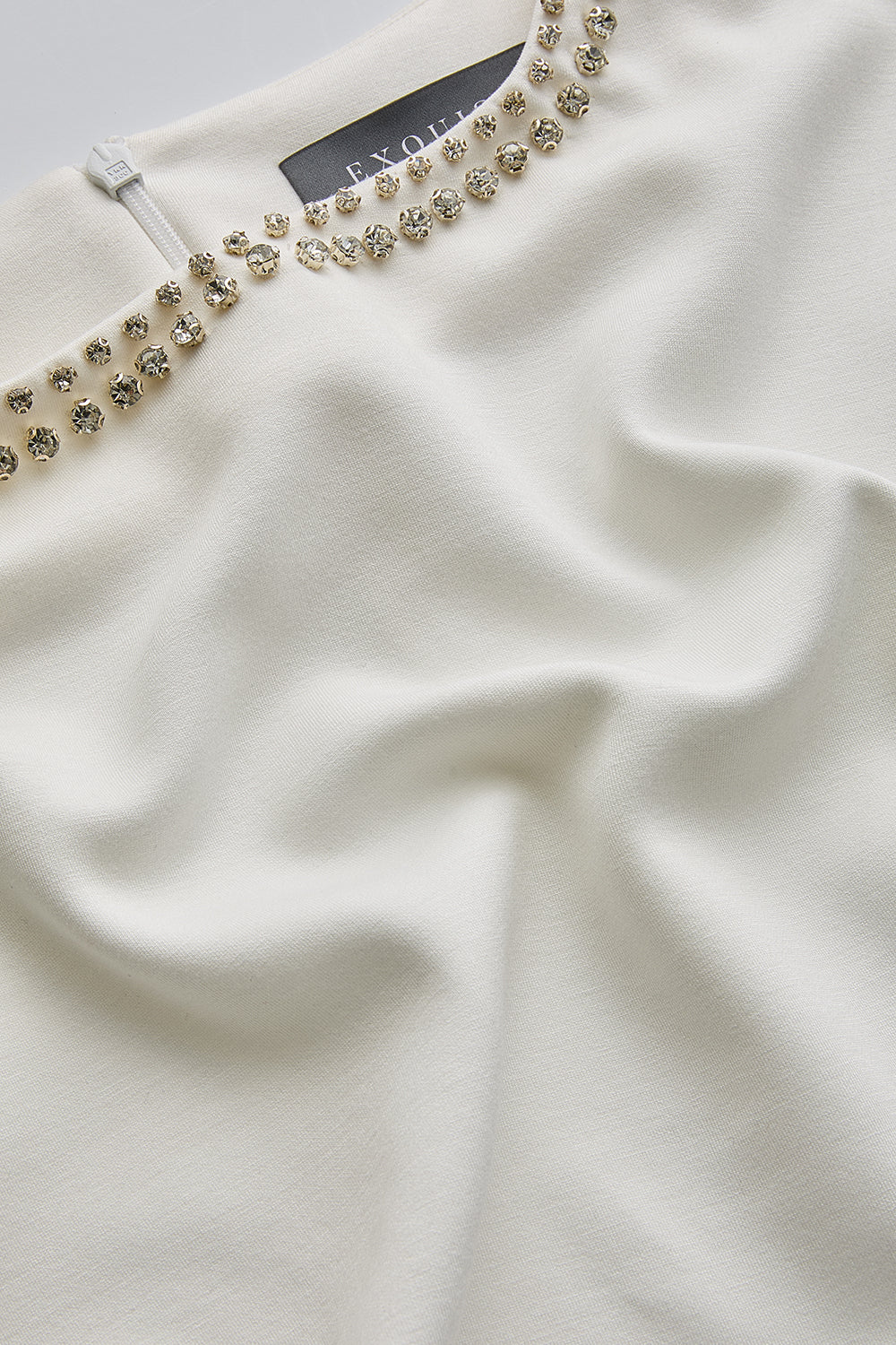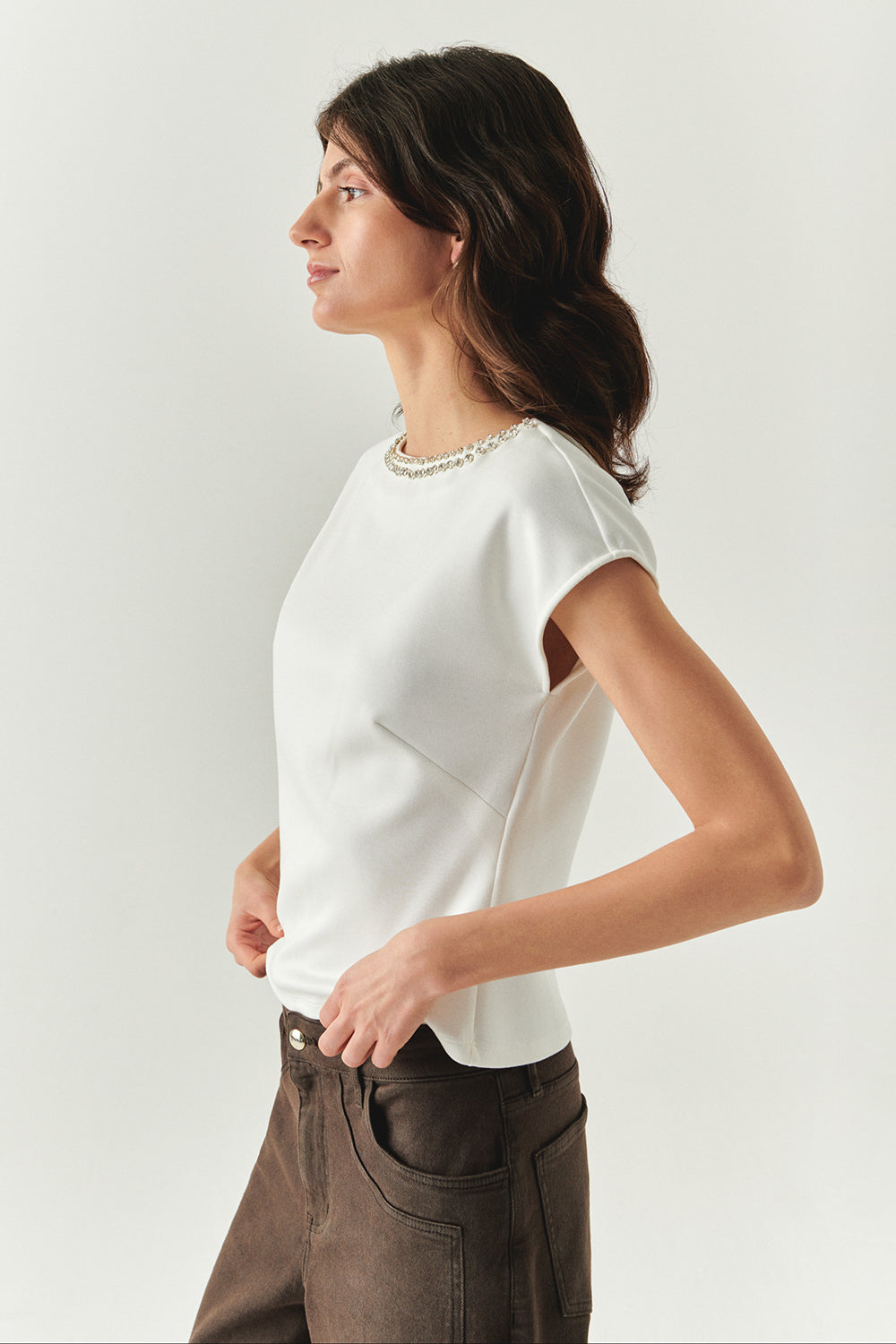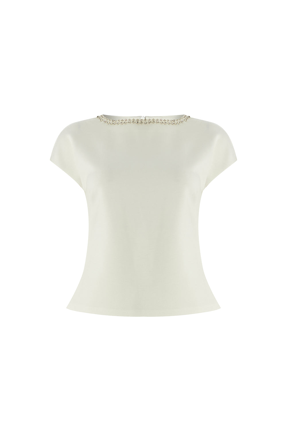 Taş Detaylı Kayık Yaka Kolsuz Regular Kemik Örme Bluz