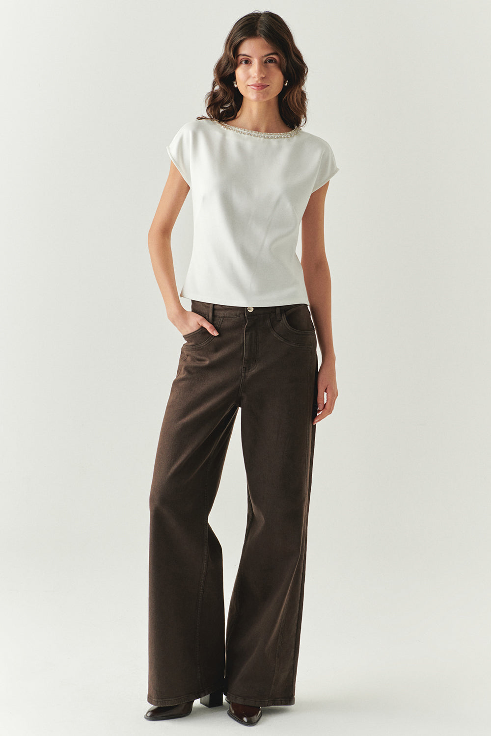 Kayık yakasını çevreleyen zarif taş detaylarıyla ışığı yakalayan bu kolsuz siyah bluz, yumuşak örme dokusu ve regular kesimiyle hem rahat hem de şık bir duruş sunar; metalik pileli bir etekle akşam davetine hazırlanabilir ya da klasik pantolonla gündüzden geceye uzanan kusursuz bir görünüm yakalayabilirsiniz, tıpkı sabah aceleyle seçip gün boyu kendinizi iyi hissettiğiniz o vazgeçilmez parçalar gibi.