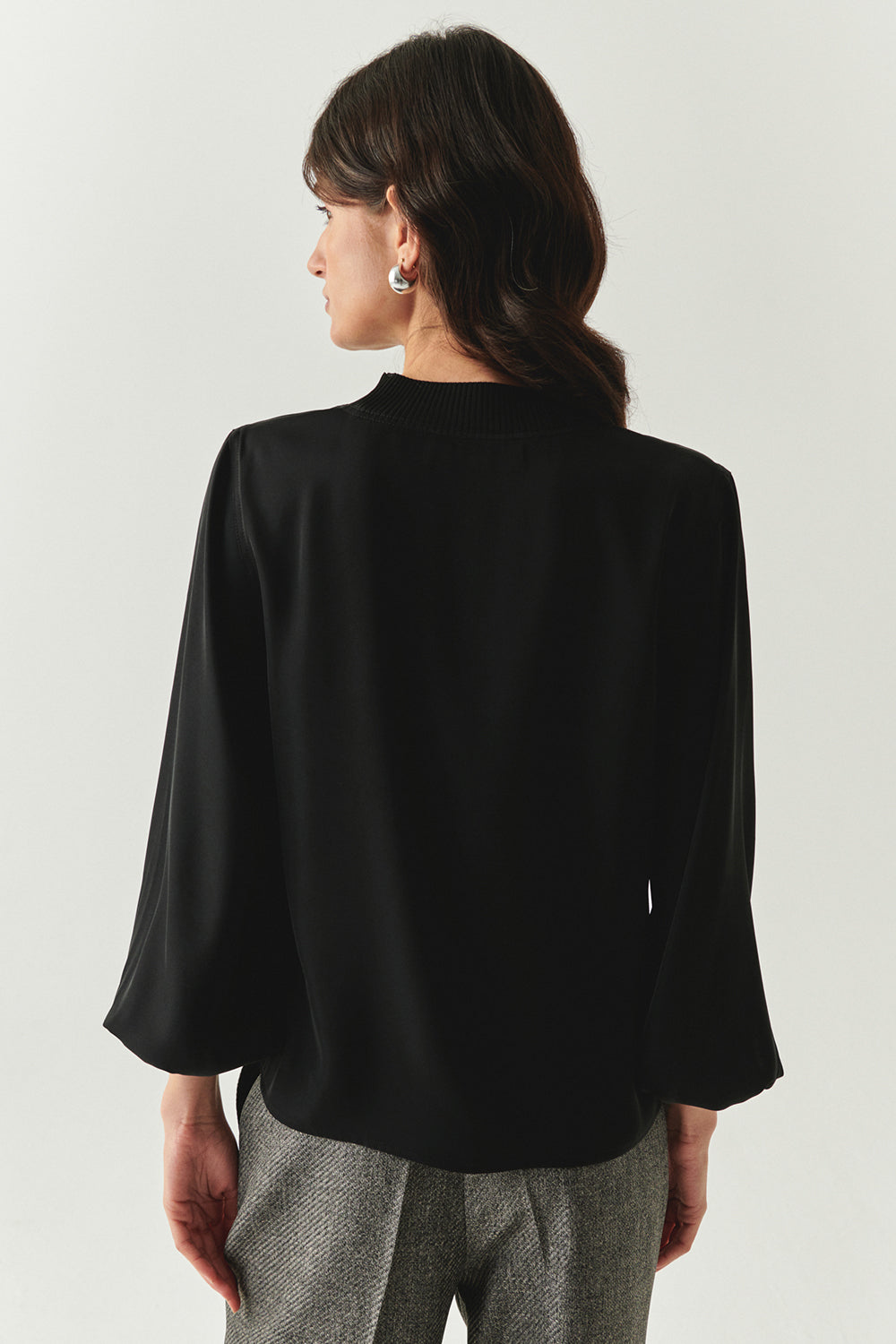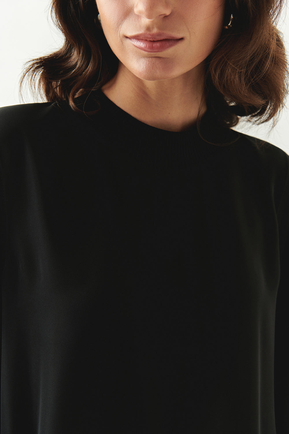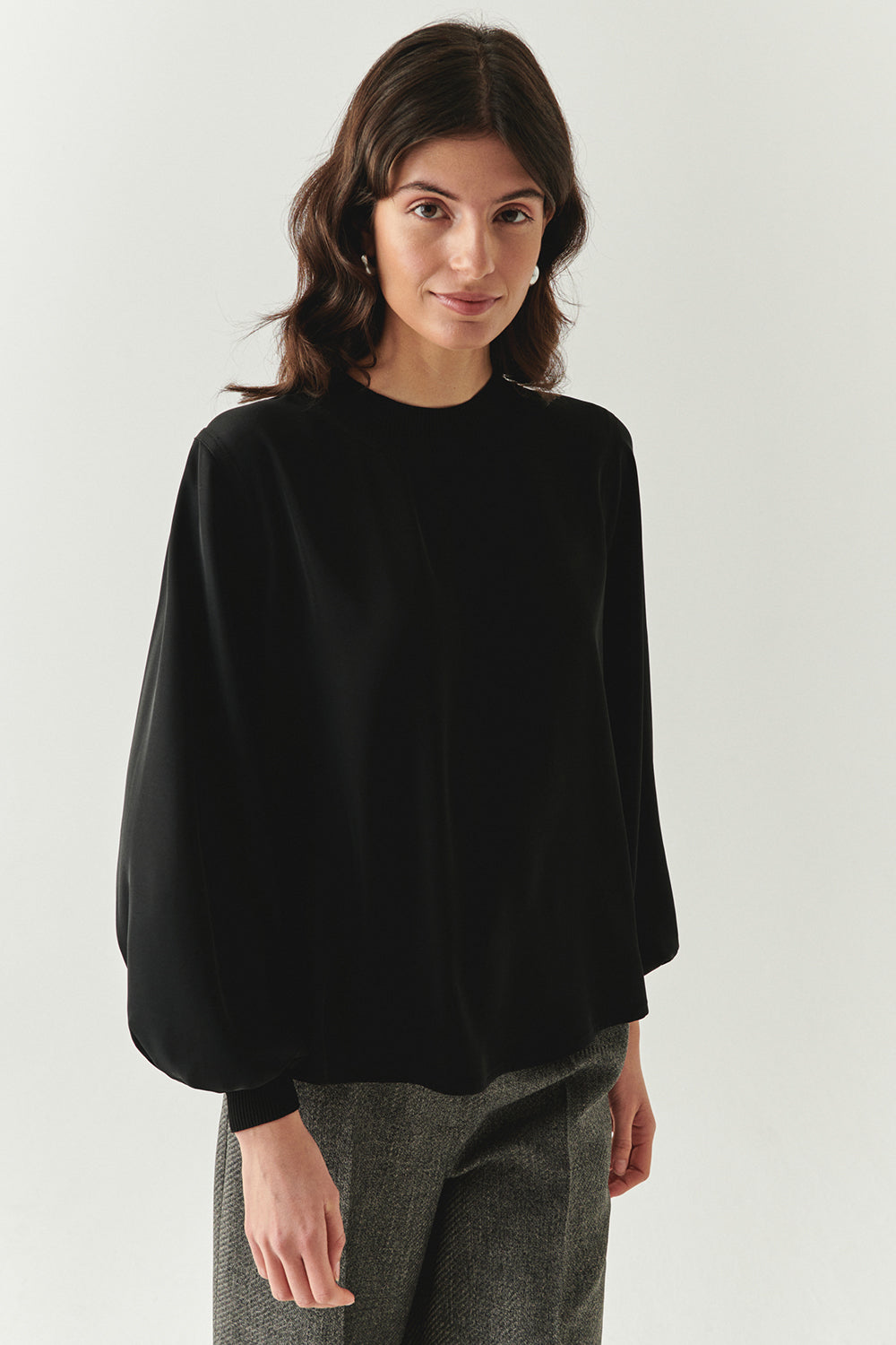 Akıcı dokusu, yuvarlak yaka formu ve bilekte toparlanan uzun kollarıyla zamansız bir şıklık sunan bu siyah bluz, rahat kesimi sayesinde gün boyu konfor sağlar; gri pantolonlarla ofis stilinizi, kot ve loafer’larla ise hafta sonu görünümünüzü tamamlayarak her ortamda sade ama güçlü bir etki yaratır.