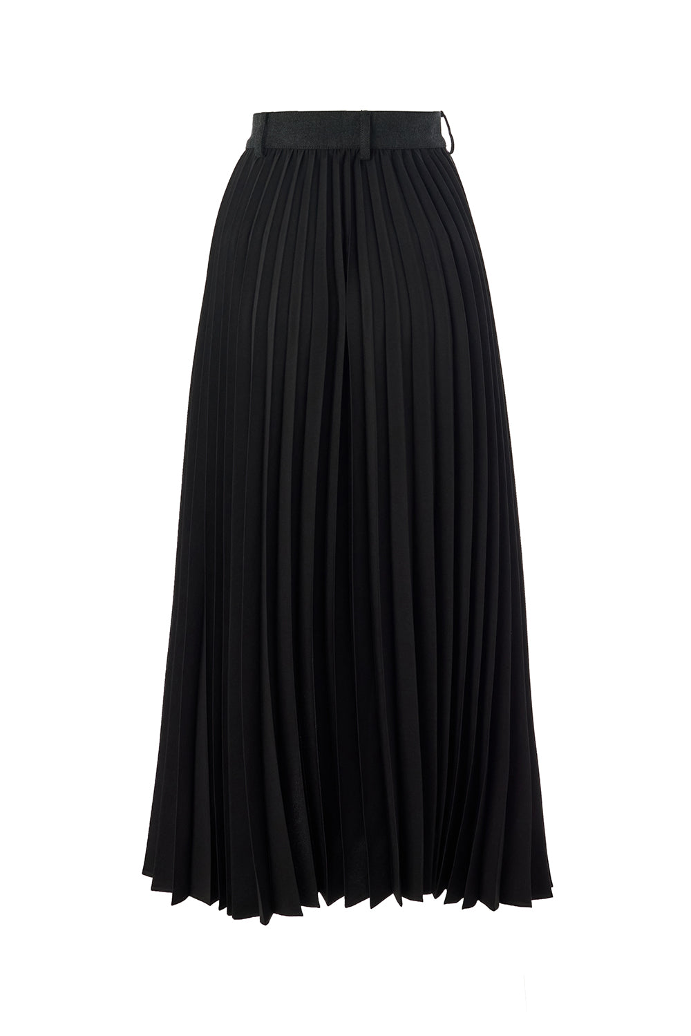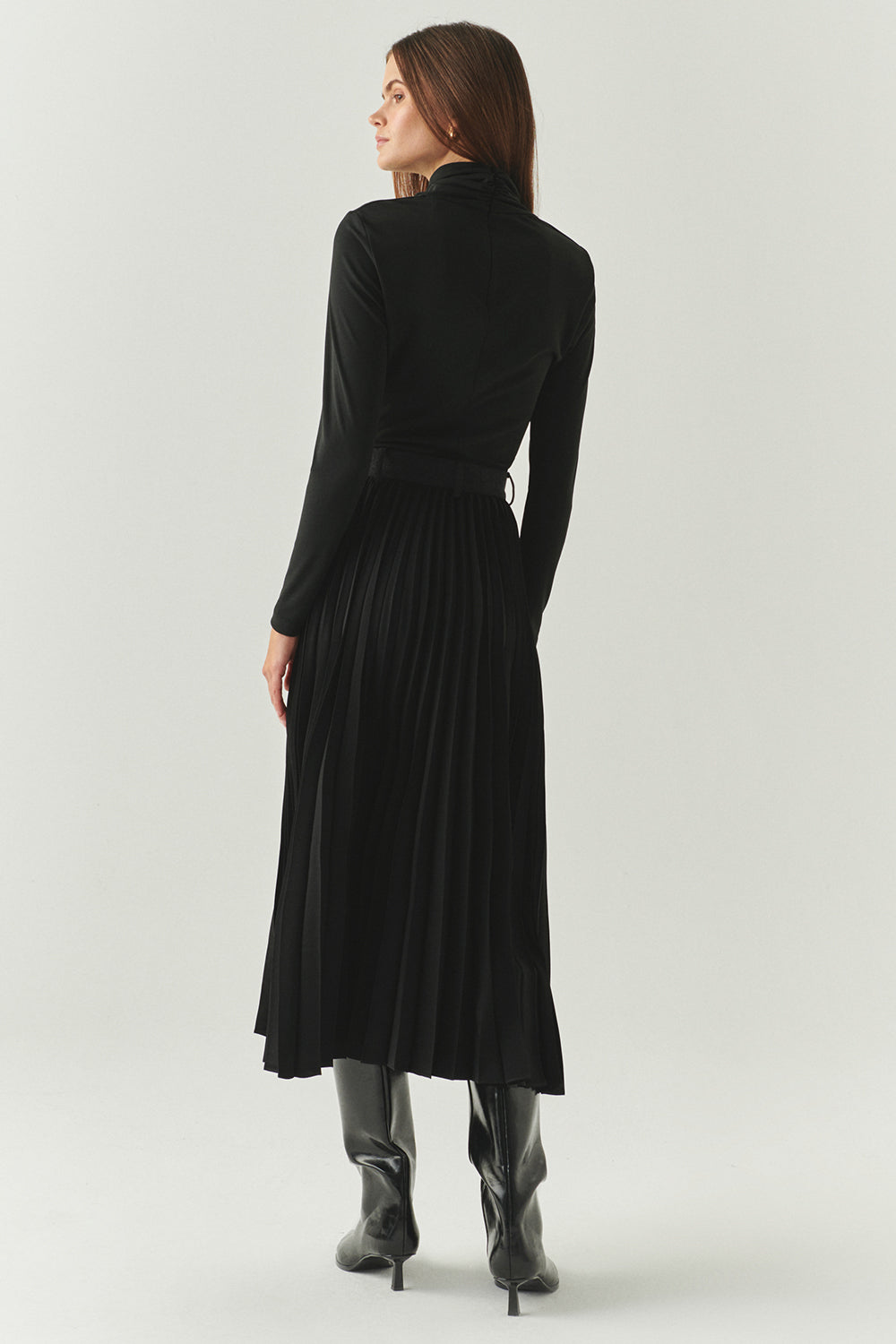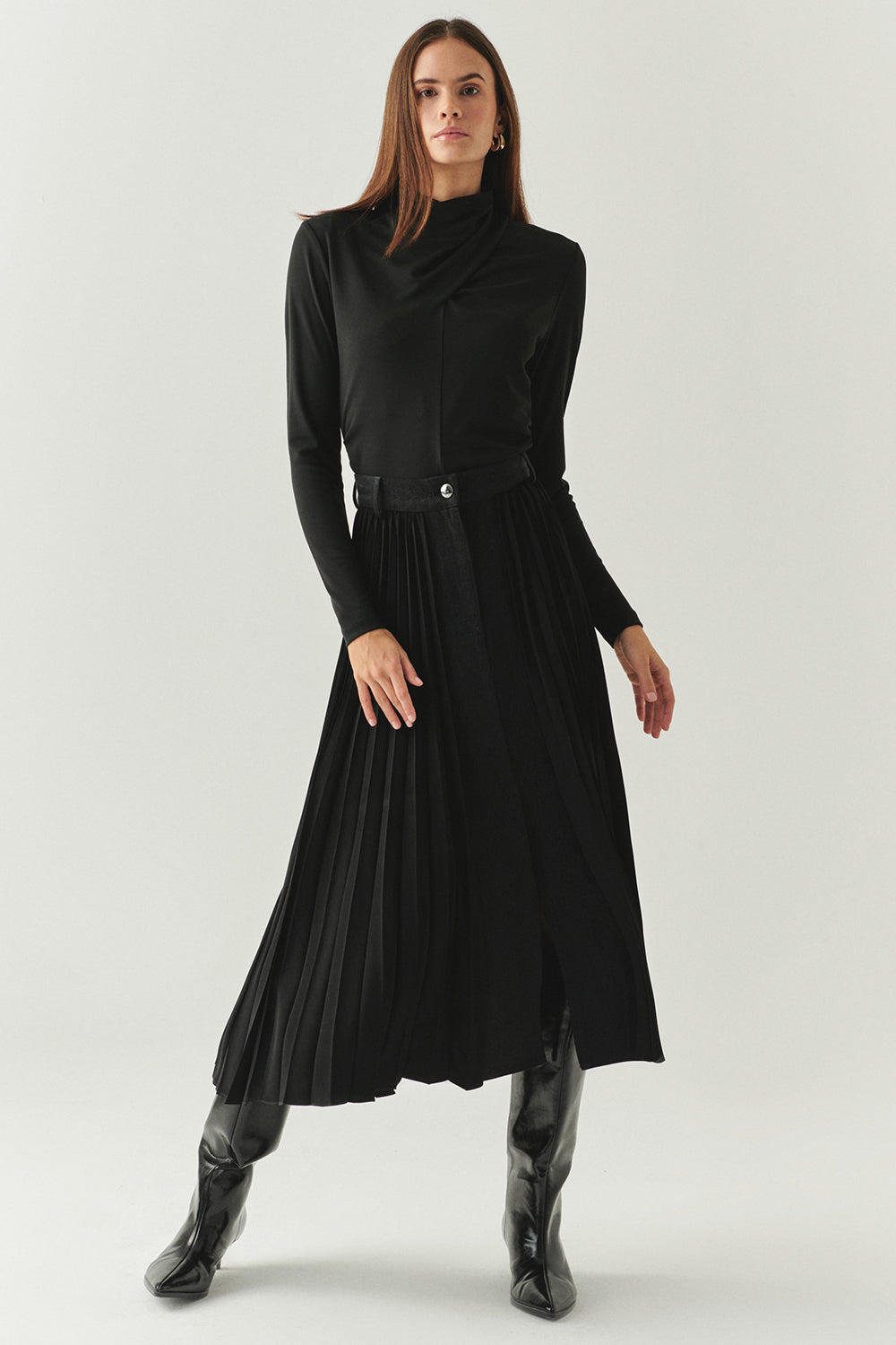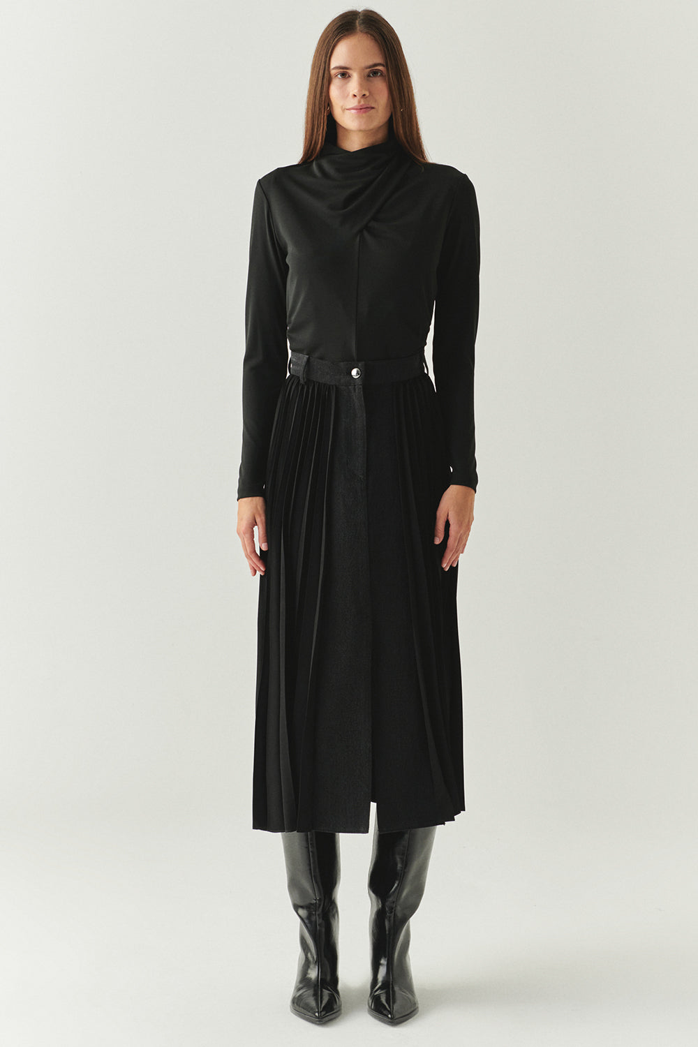 Siyahın zarafetini denim dokunuşla buluşturan bu midi etek, piliseli tasarımı ve yan yırtmacıyla her adımda hafif bir hareket katar; regular kesimi sayesinde sabah çizmelerle şehirde özgürce yürüyebilir, akşam topuklularla davetlerde sofistike bir stile dönüşebilirsiniz.