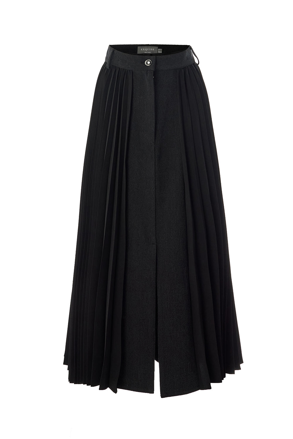 Yırtmaçlı Detaylı Regular Piliseli Denim Garnili Midi Siyah Etek