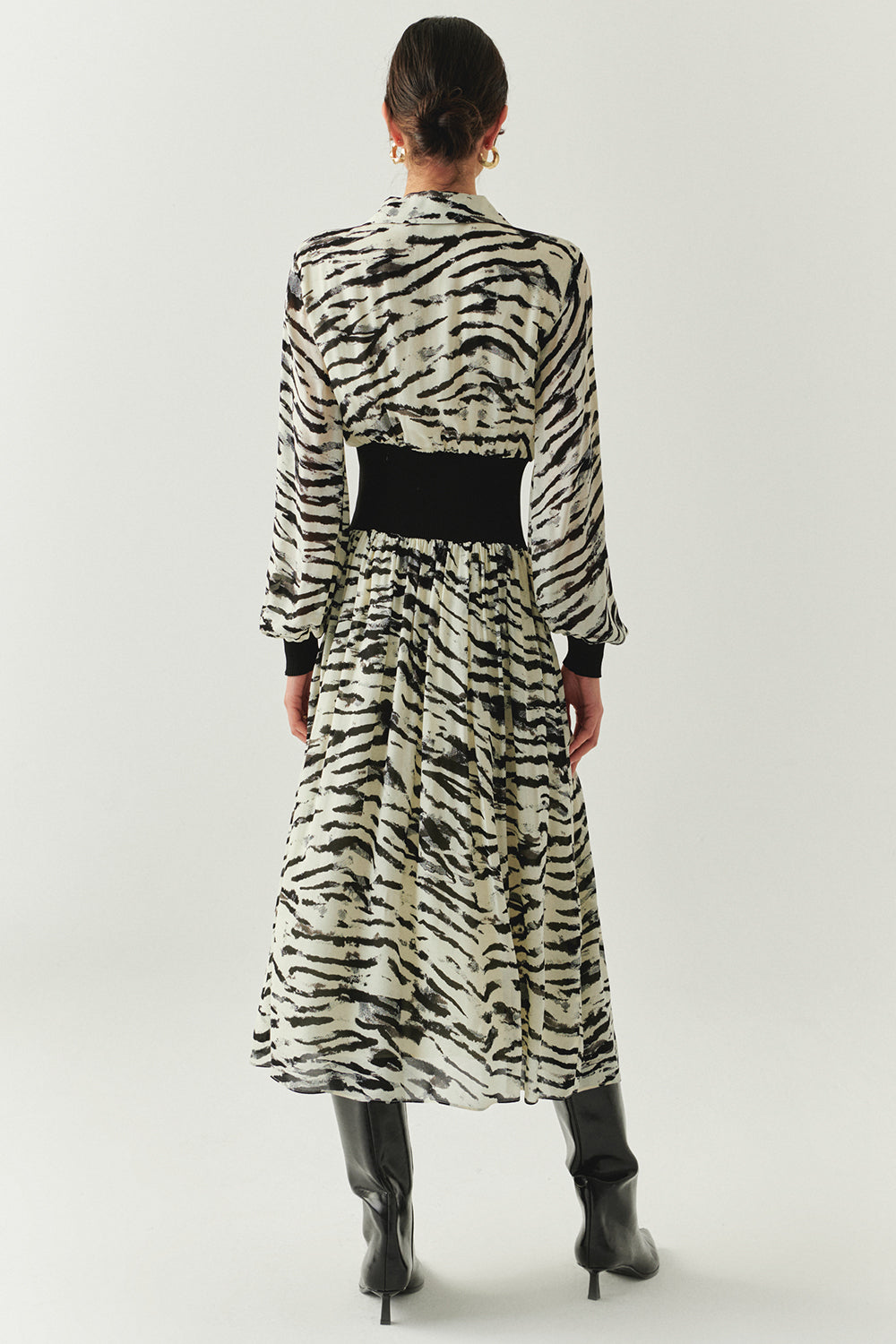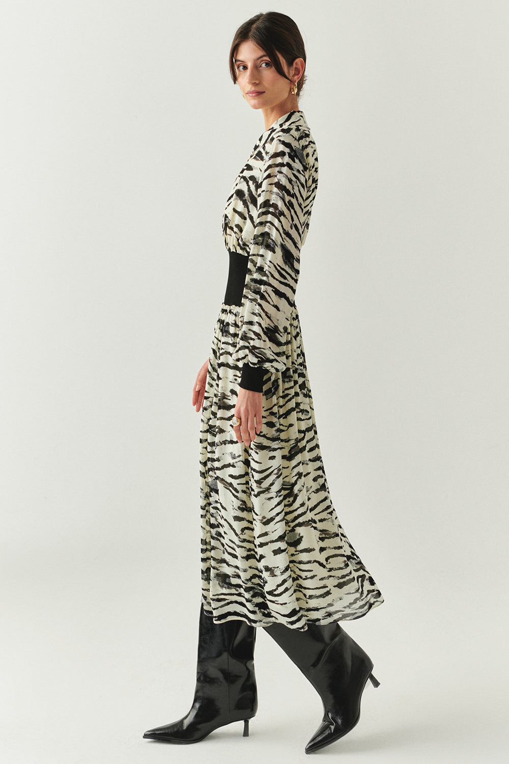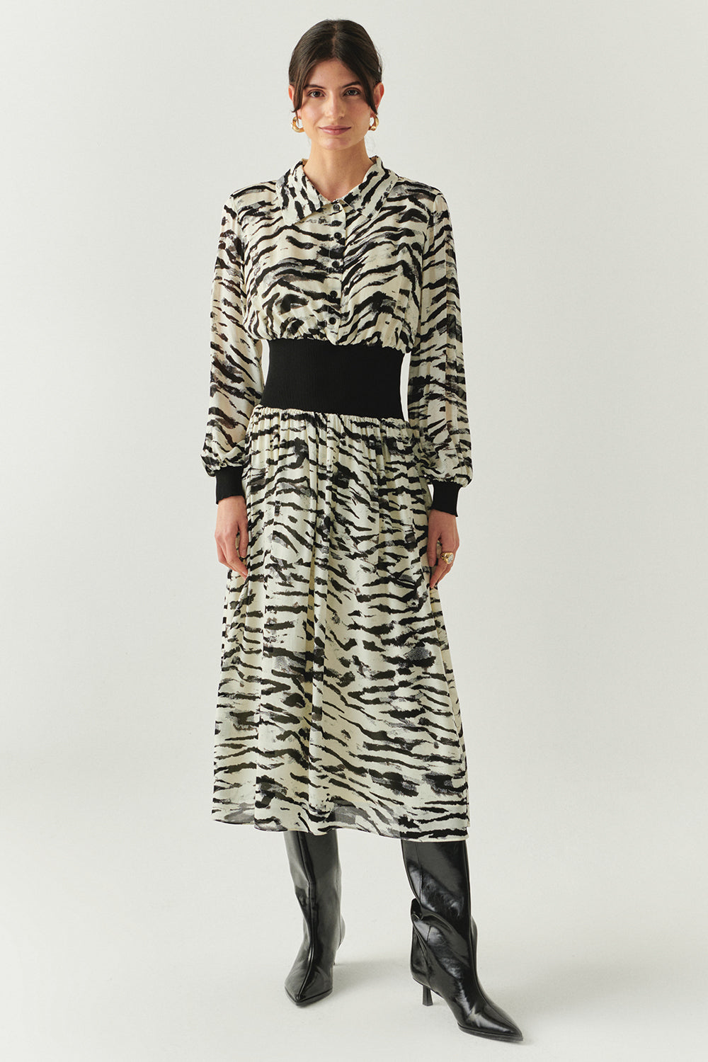 Cesur zebra deseniyle dikkat çeken bu midi elbise, beli saran ribana detayıyla vücudu zarifçe ortaya çıkarır; yumuşak dokusu ve astarıyla rahat bir his verir. Sabah çizmelerle şehirde güçlü bir adım atabilir, akşam topuklularla ışıkların altında feminen bir görünüme dönüşebilirsiniz.