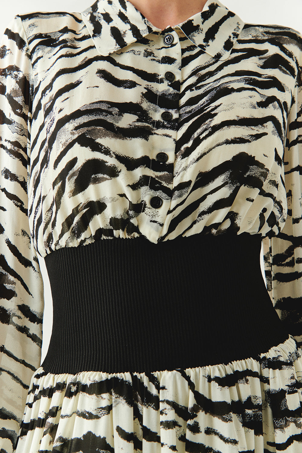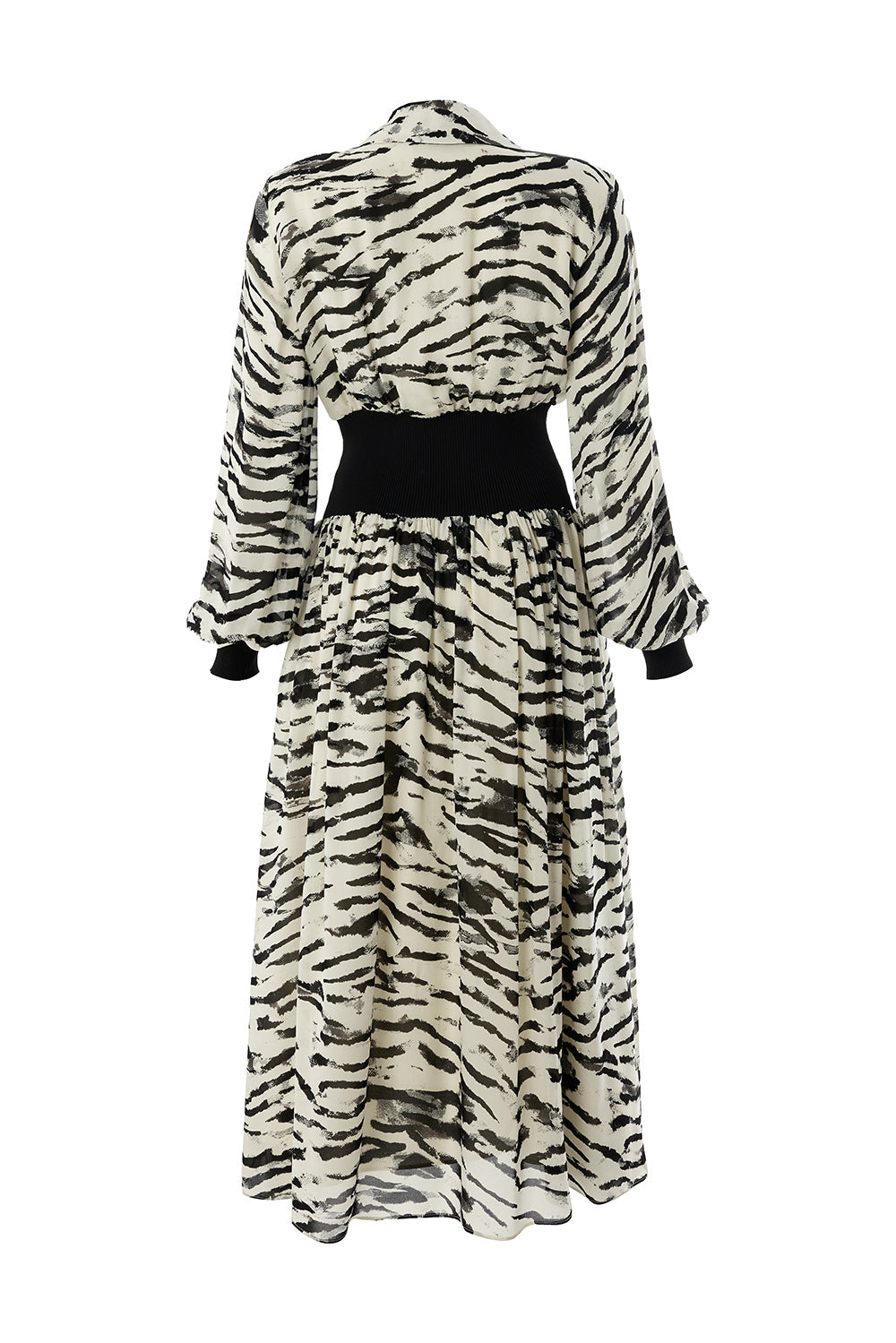 Zebra Desenli Beli Ribanalı Regular Astarlı Midi Siyah Kemik Elbise