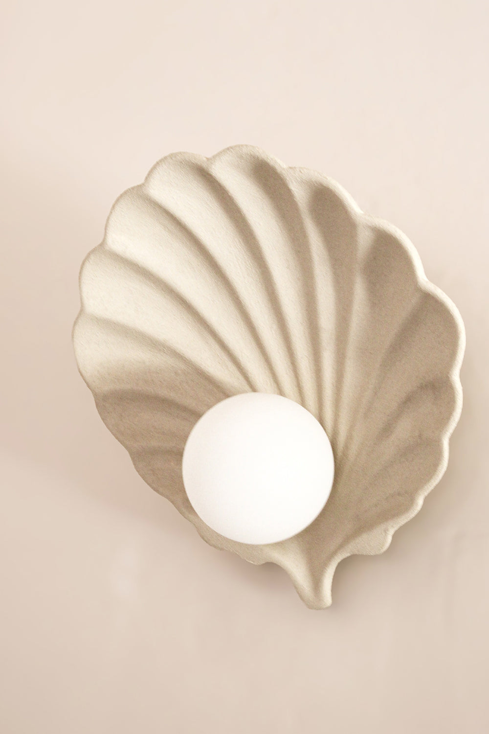 El işçiliğiyle üretilen bu aplik, yumuşak hatlı kabuk formu ve mat seramik yüzeyiyle doğal ve sofistike bir görünüm sunar. Ortasında yer alan yuvarlak cam küre, yumuşak ve sıcak bir ışık yayarak ortamda huzurlu bir atmosfer yaratır.