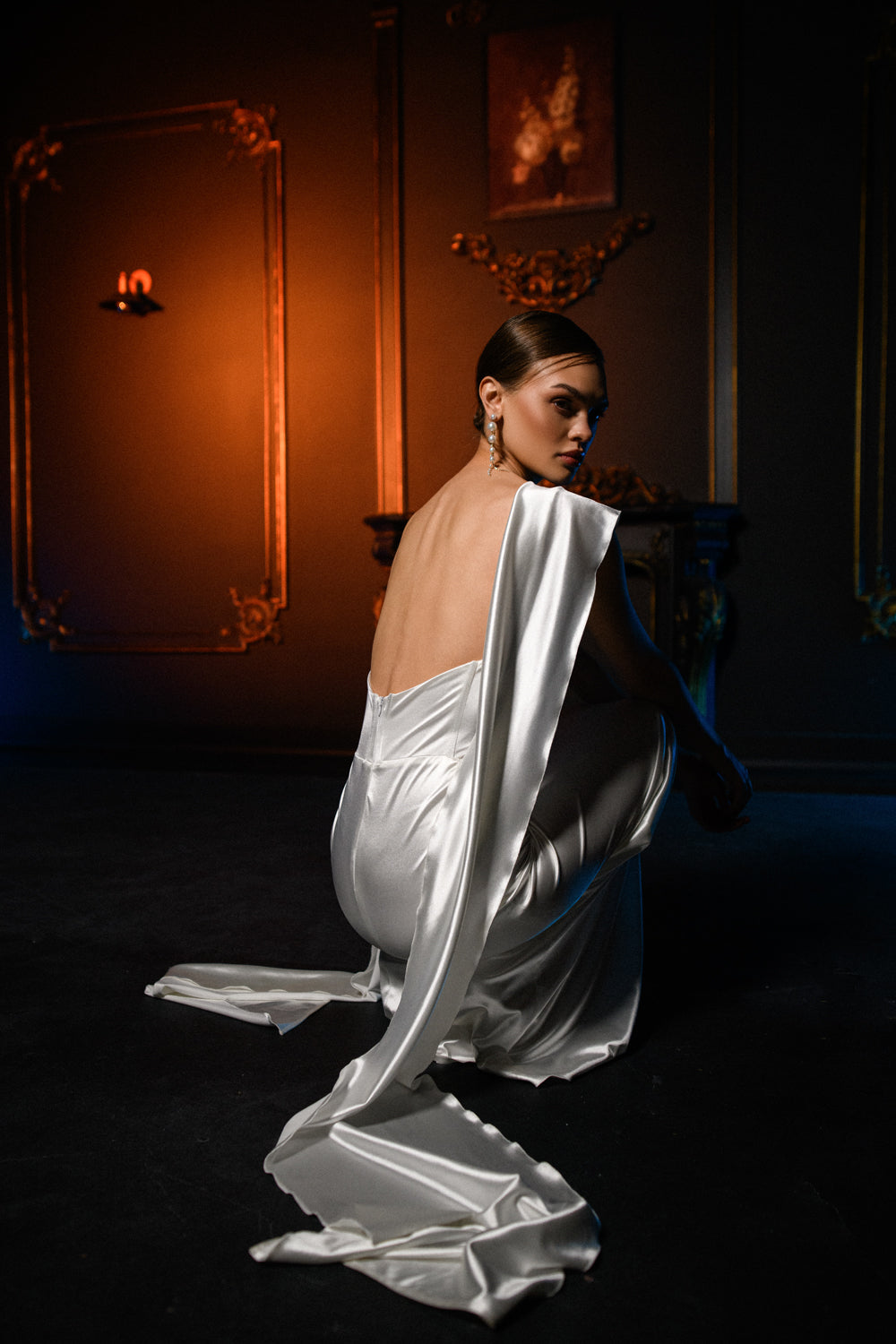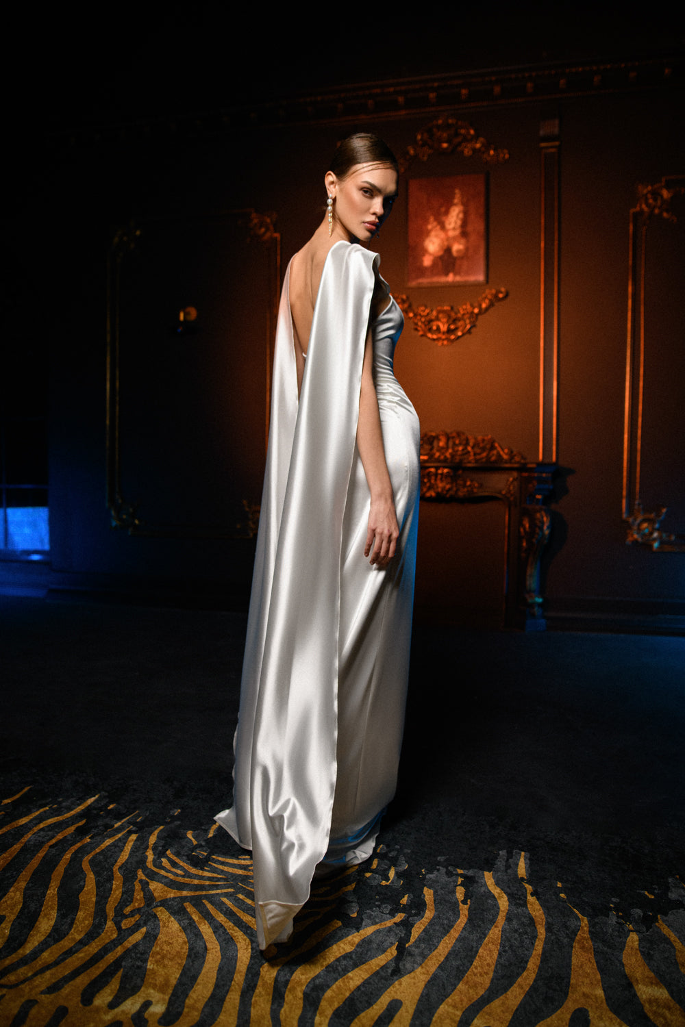 Akıcı saten dokusu ve zarif kalp yaka kesimiyle feminen bir siluet sunar. Omuzdan bağlanan şal detayı elbiseye akışkan bir hareket ve sofistike bir duruş kazandırır. Uzun formu özel davetler, nişan törenleri ve akşam organizasyonlarında etkileyici bir görünüm sağlar. Astarlı yapısı sayesinde iç göstermez ve konforlu bir kullanım sunar.