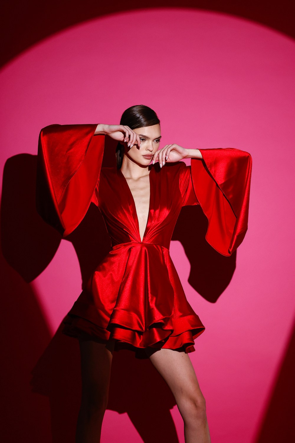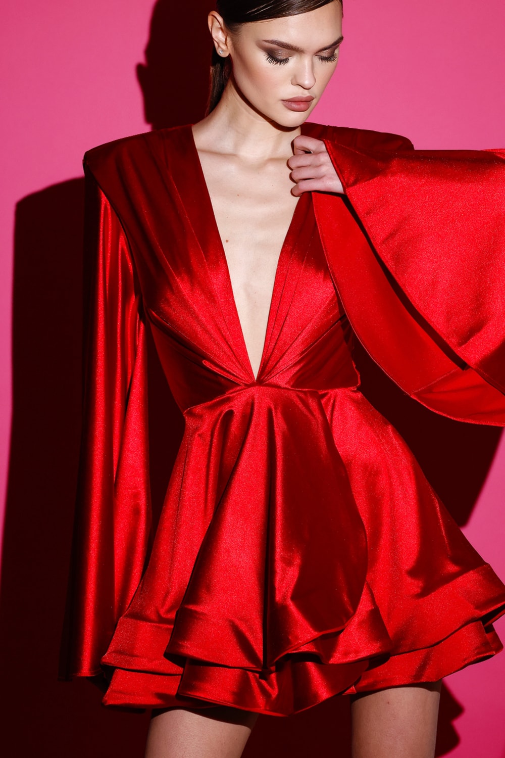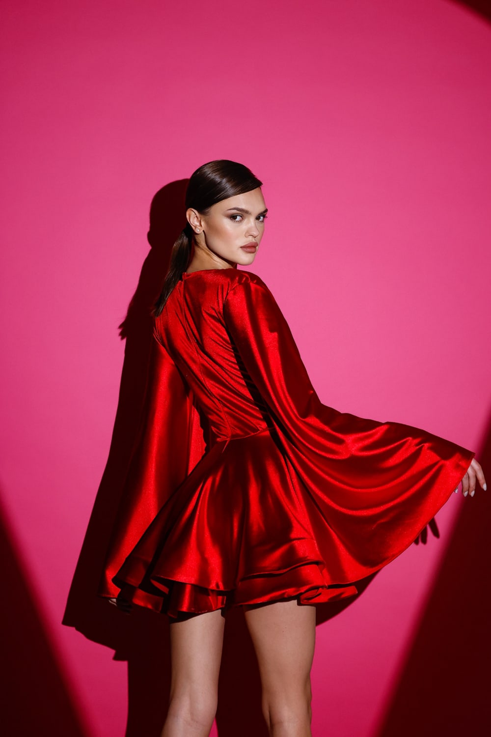 Parlak ve akıcı saten dokusuyla şıklığı zahmetsizce yansıtan bu elbise, glenli kesimi sayesinde vücudu zarifçe sarar. Tam kalıp yapısı ve tam astarı ile iç göstermeden kusursuz bir görünüm sunar. Hem özel davetlerde hem şehir akşamlarında güçlü ve feminen bir siluet yaratır.