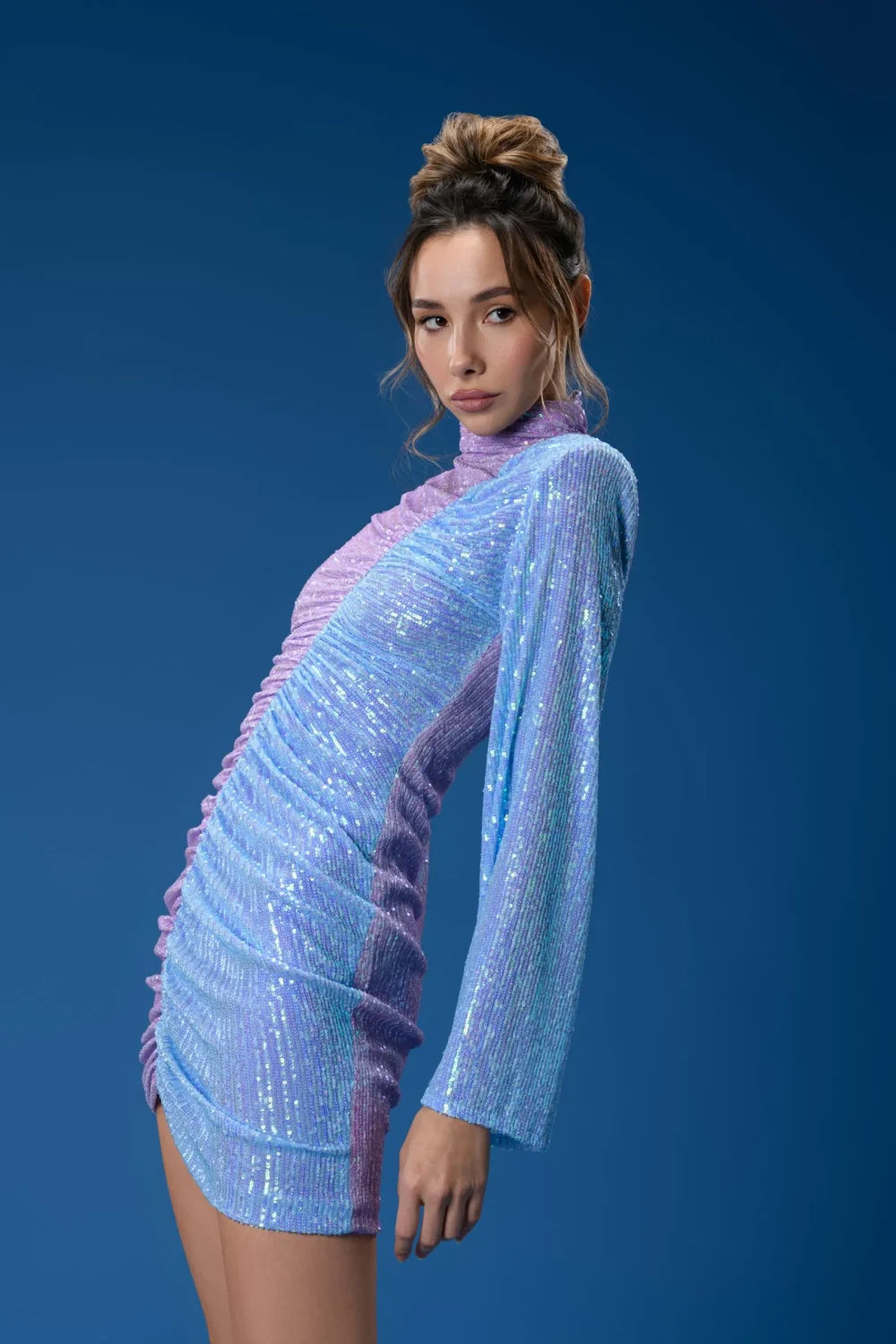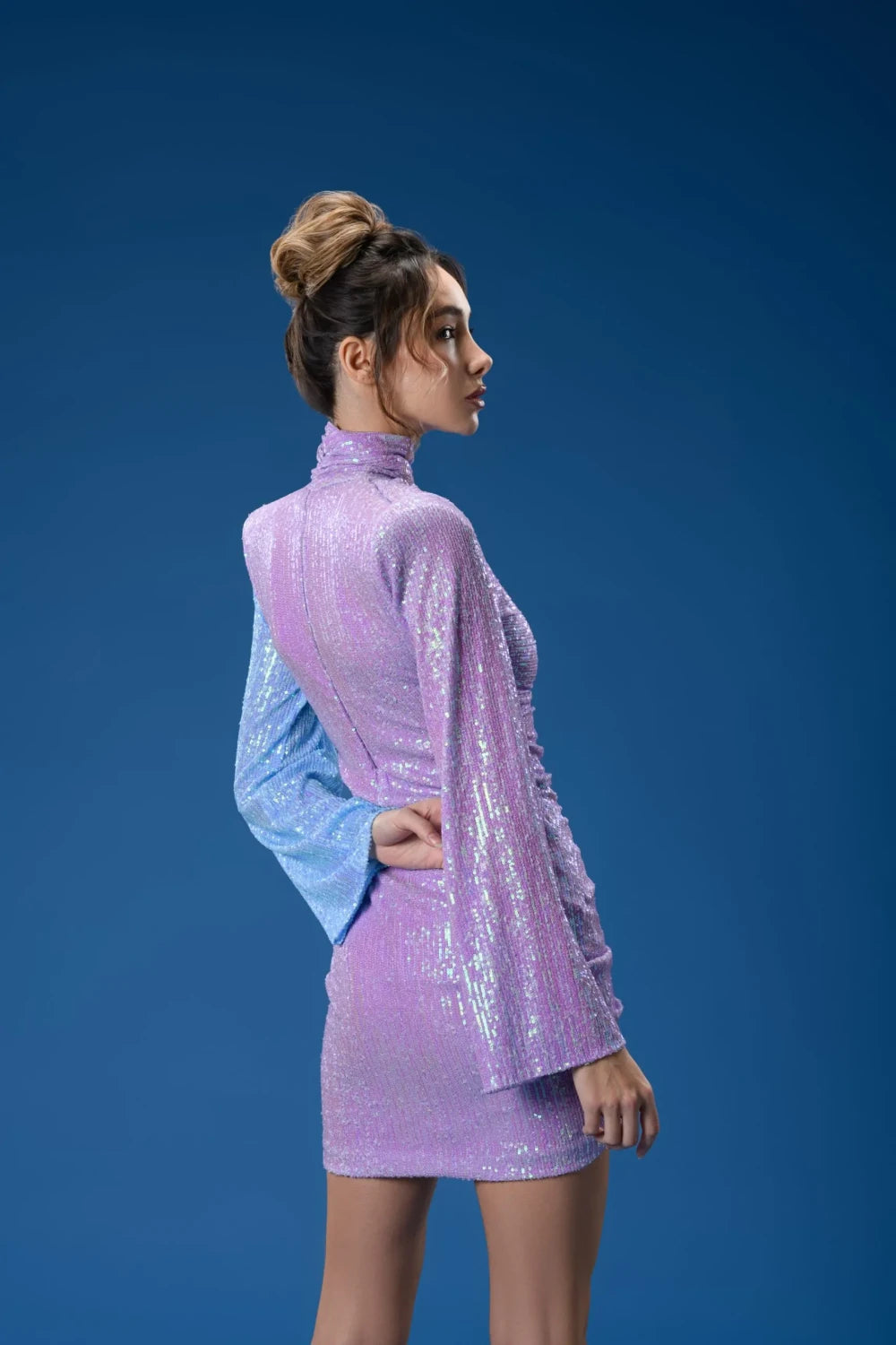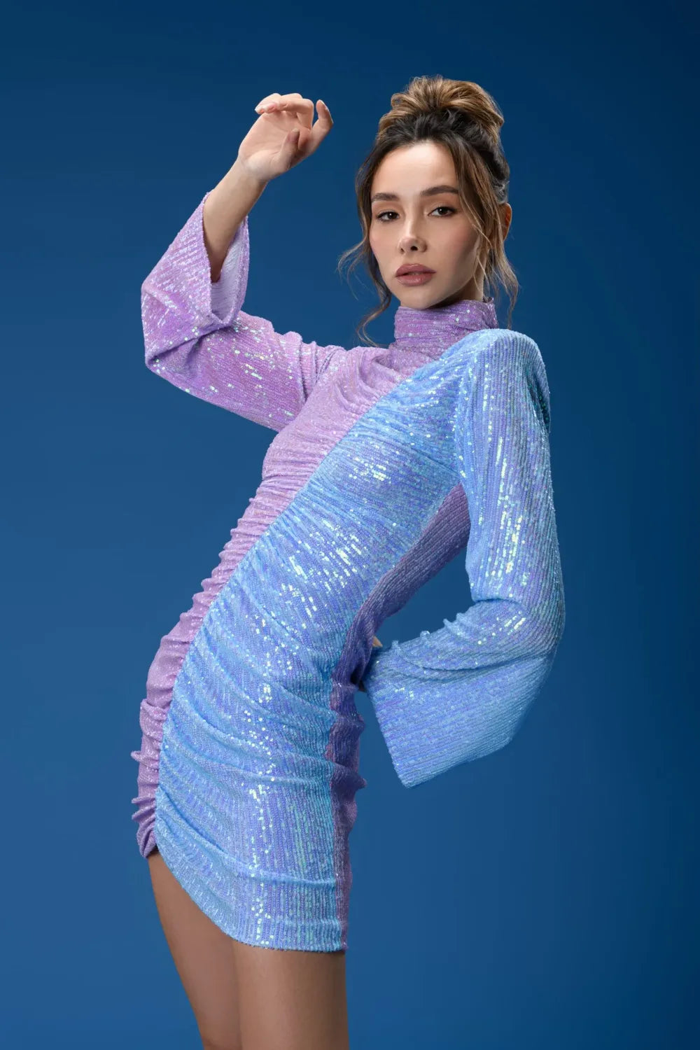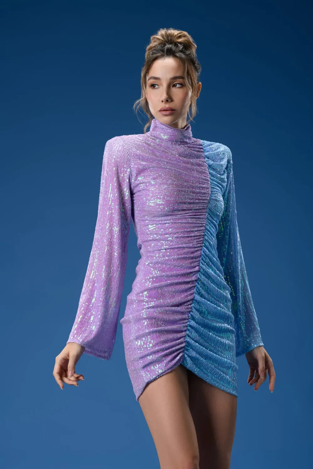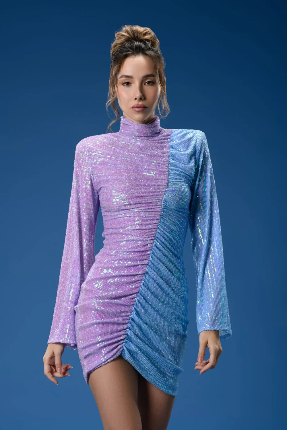 Lila ve mavinin degrade renk geçişiyle tasarlanan bu payetli mini elbise, enerjik ve feminen bir siluet sunar. Işıltılı yüzeyi sahne etkisi yaratırken, vücudu saran form modern ve dikkat çekici bir görünüm sağlar. Parti, kutlama ve özel gecelerde öne çıkmak isteyenler için ideal bir seçimdir.