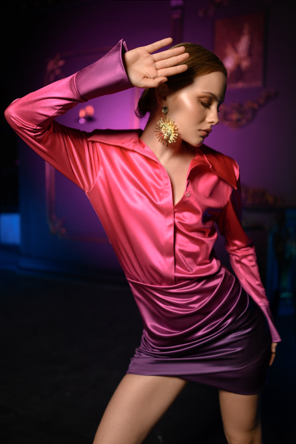 Pembe Mor Degrade Saten Gömlek Elbise