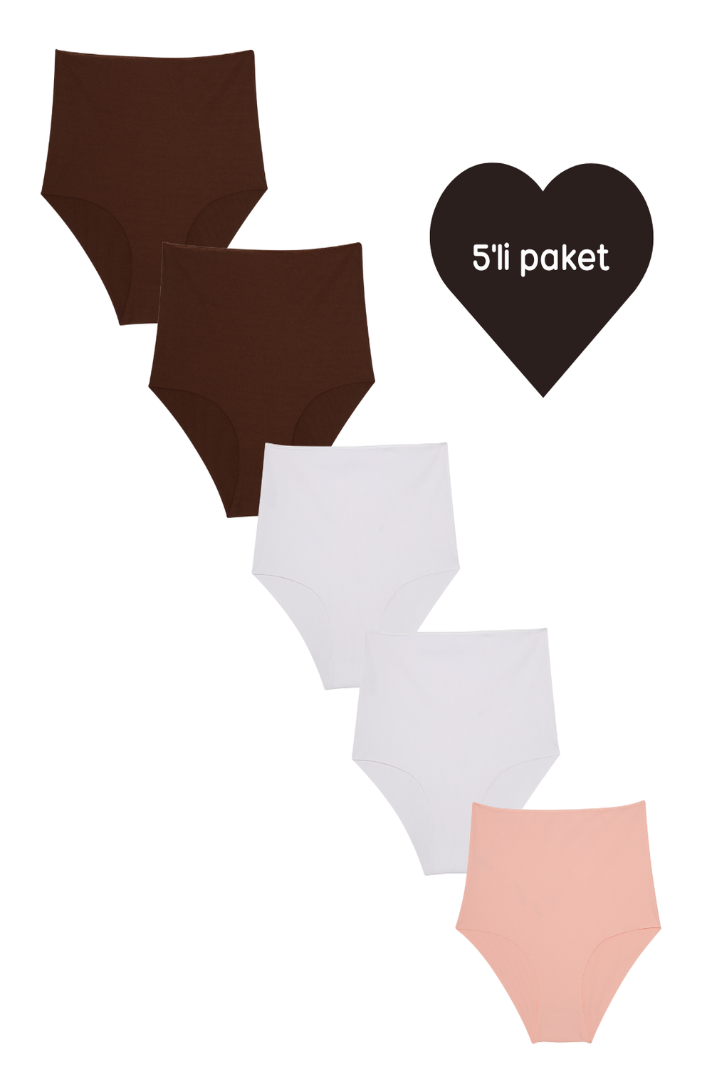 Lazer Kesim Yüksek Bel Cheeky Külot - 5'li Paket - Kahverengi, Beyaz, Pembe