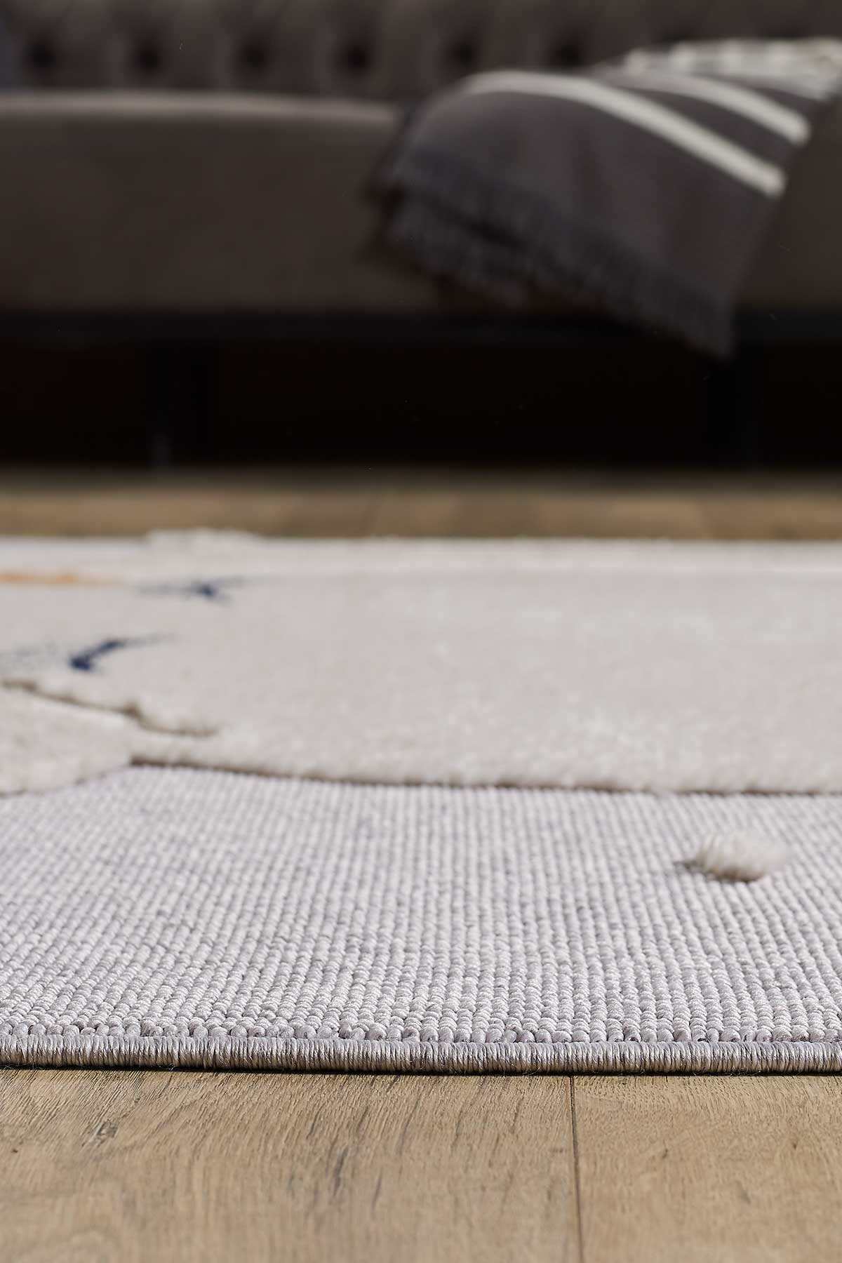 İpliği polyesterdir, taban malzemesi %100 pamuktur. Saçaklıdır. Yıldız figür deseni ile halı modası evinize gelir. Çocuk odası kullanımına uygundur. Yerden ısıtmalı alanlarda kullanılabilir. Taban yalıtımına katkı sağlar.