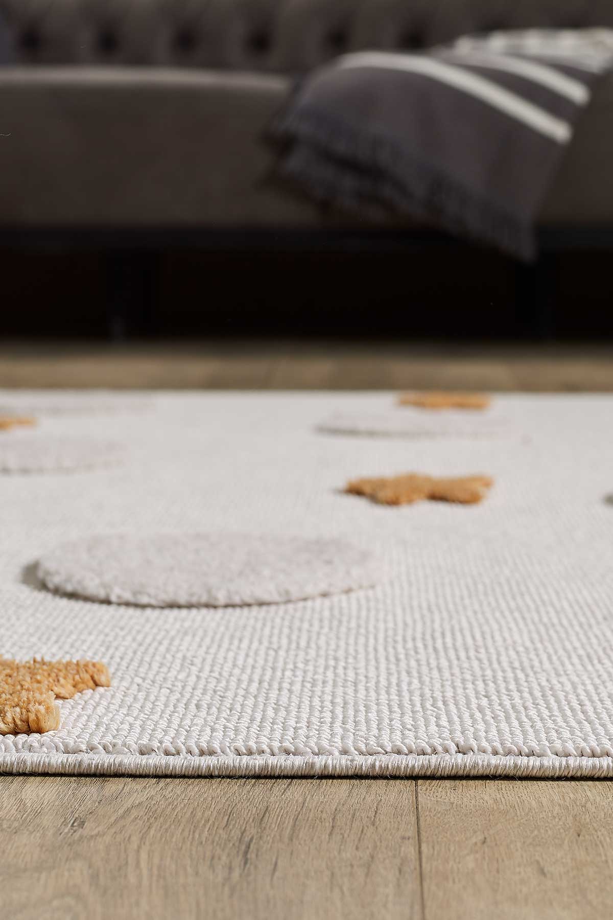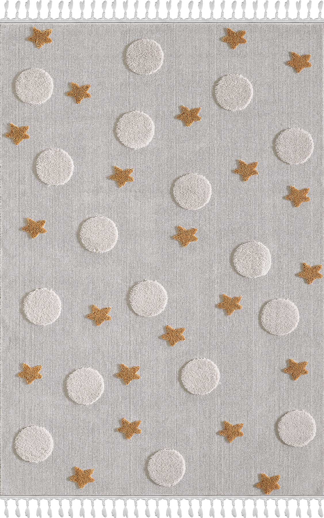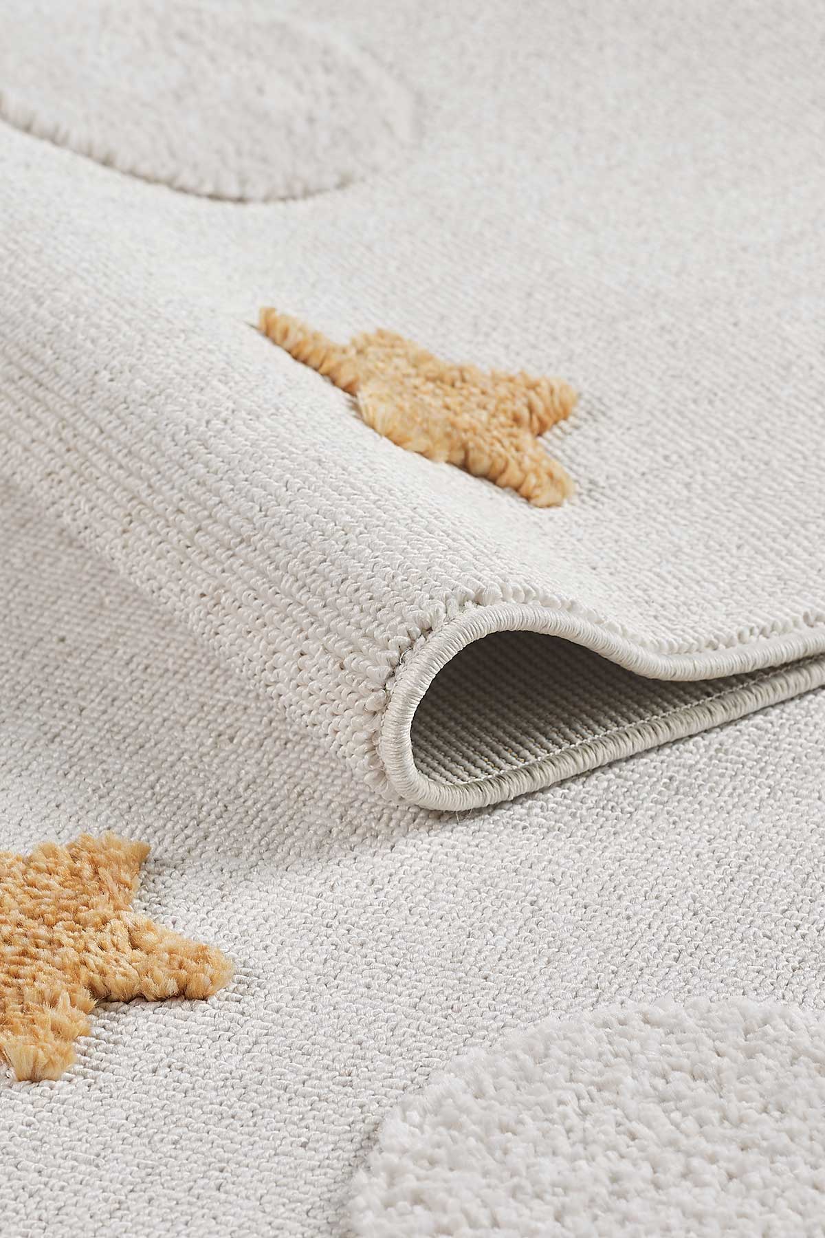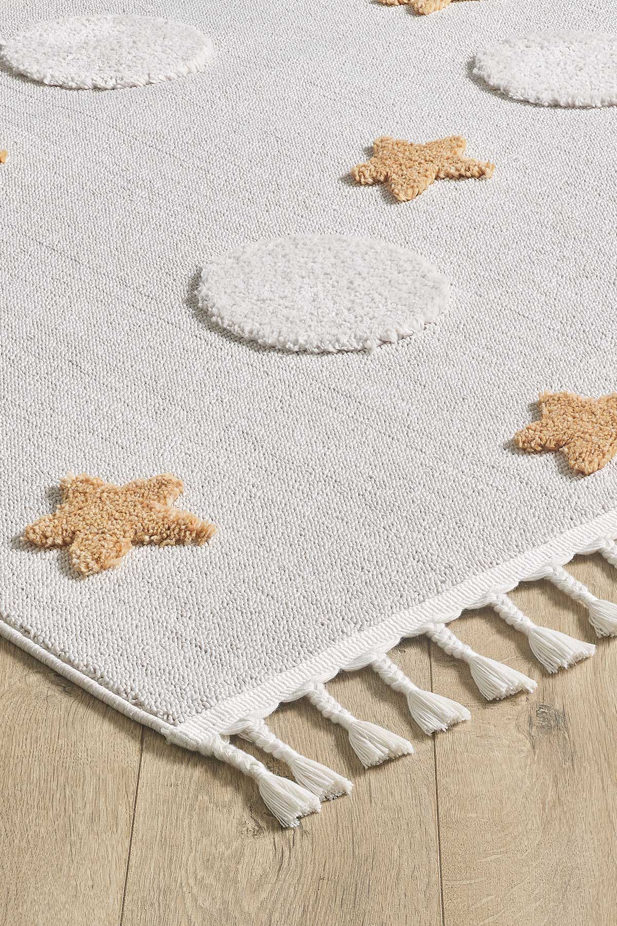 İpliği polyesterdir, taban malzemesi %100 pamuktur. Saçaklıdır. Yıldız figür deseni ile halı modası evinize gelir. Çocuk odası kullanımına uygundur. Yerden ısıtmalı alanlarda kullanılabilir. Taban yalıtımına katkı sağlar.