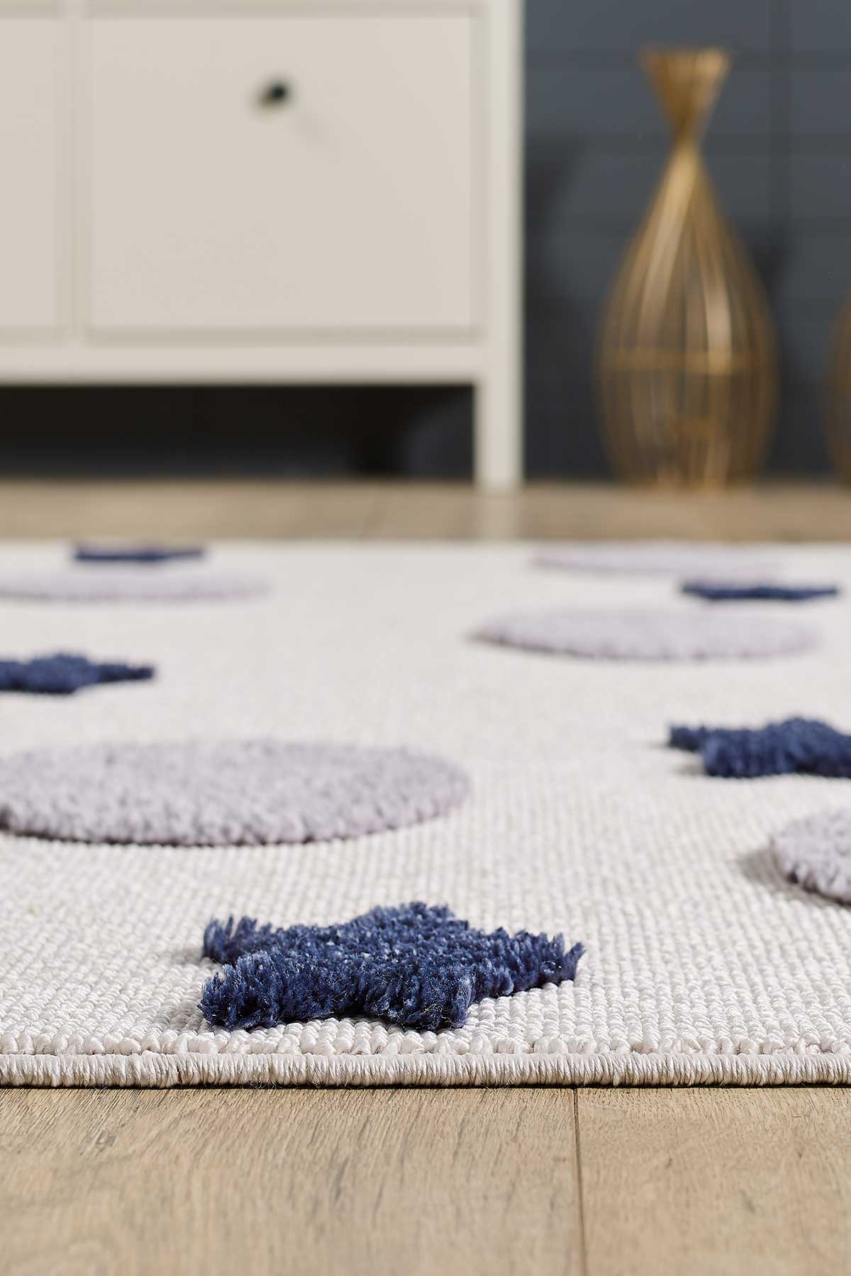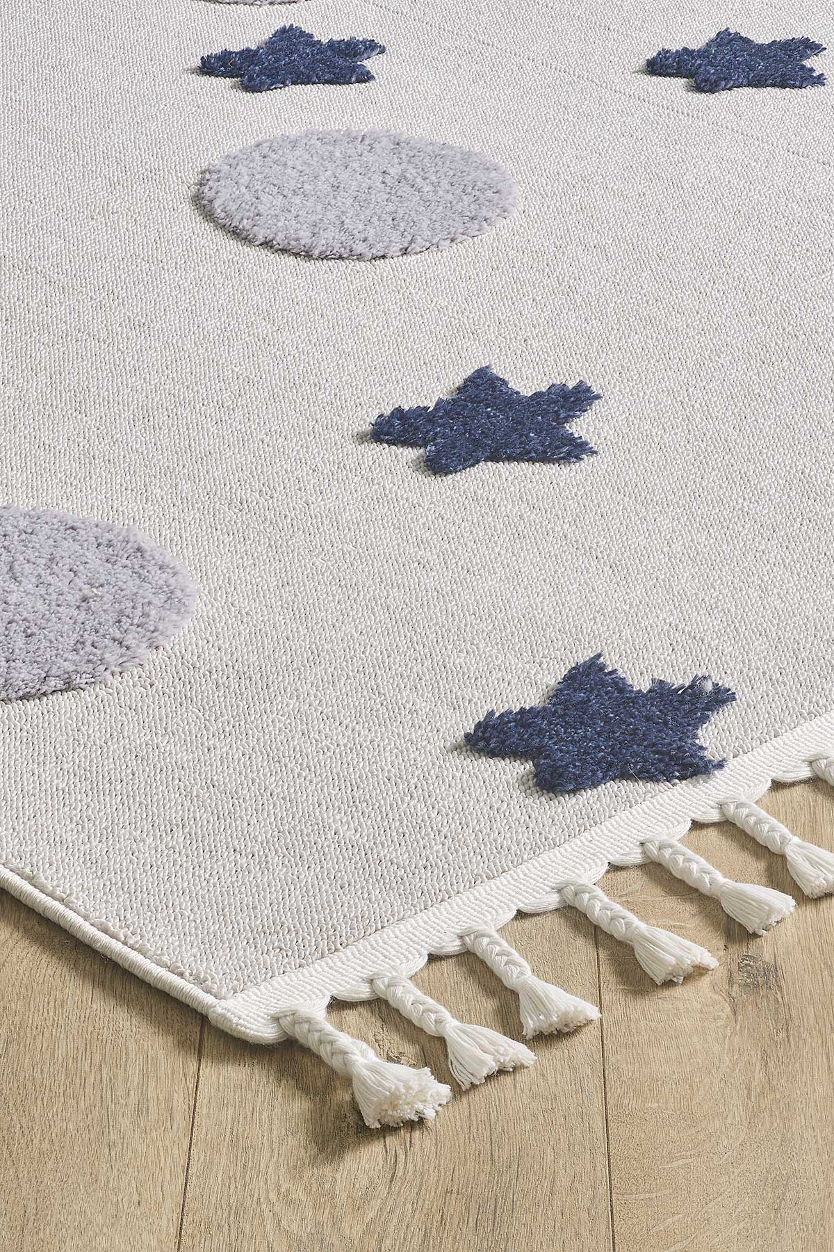 İpliği polyesterdir, taban malzemesi %100 pamuktur. Saçaklıdır. Yıldız figür deseni ile halı modası evinize gelir. Çocuk odası kullanımına uygundur. Yerden ısıtmalı alanlarda kullanılabilir. Taban yalıtımına katkı sağlar.