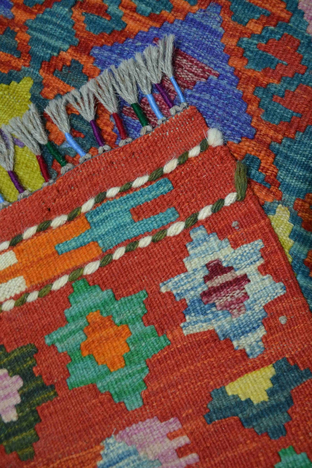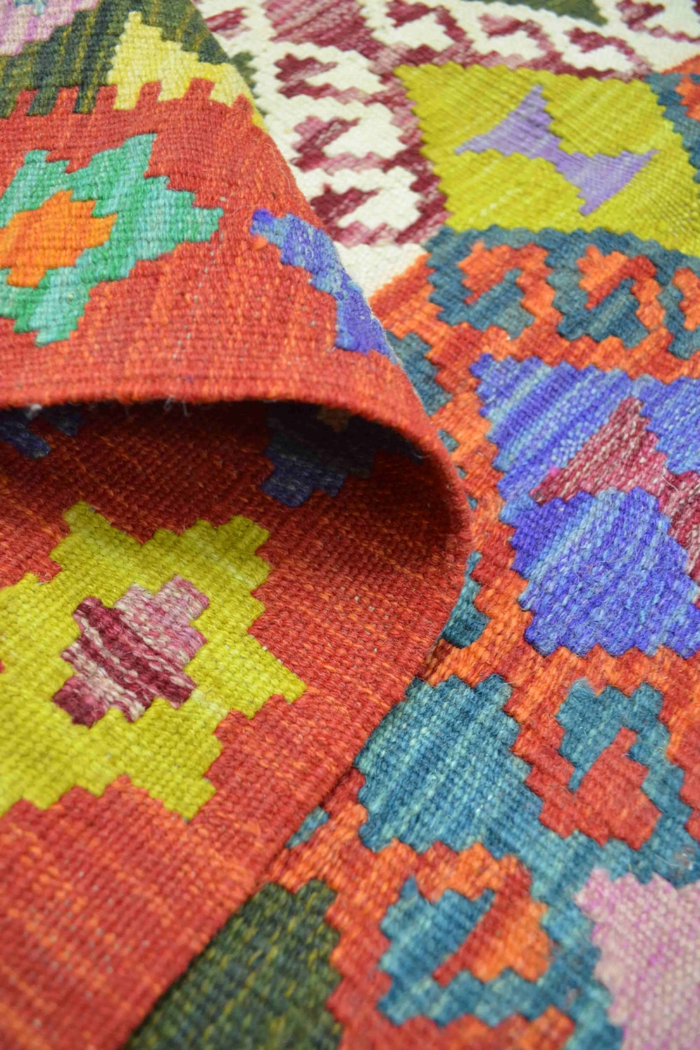 Afgan Kilimi, yün saçak üzerine yün iplikten, geleneksel el dokuma tekniğiyle dokunmuş özel bir kilimdir. Kırmızı tonları ve geometrik desenleriyle dikkat çeker, otantik tarzıyla farklı dekorasyonlara uyum sağlar.