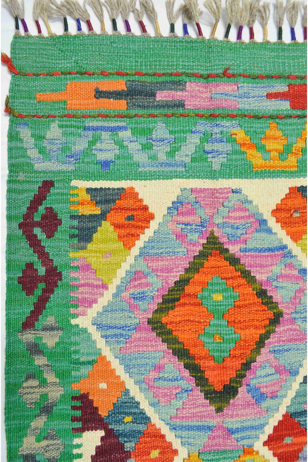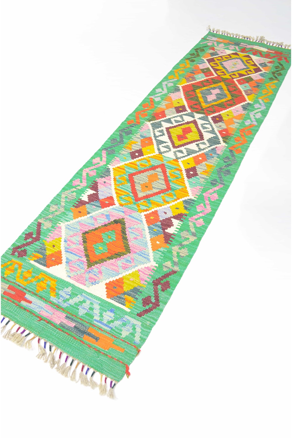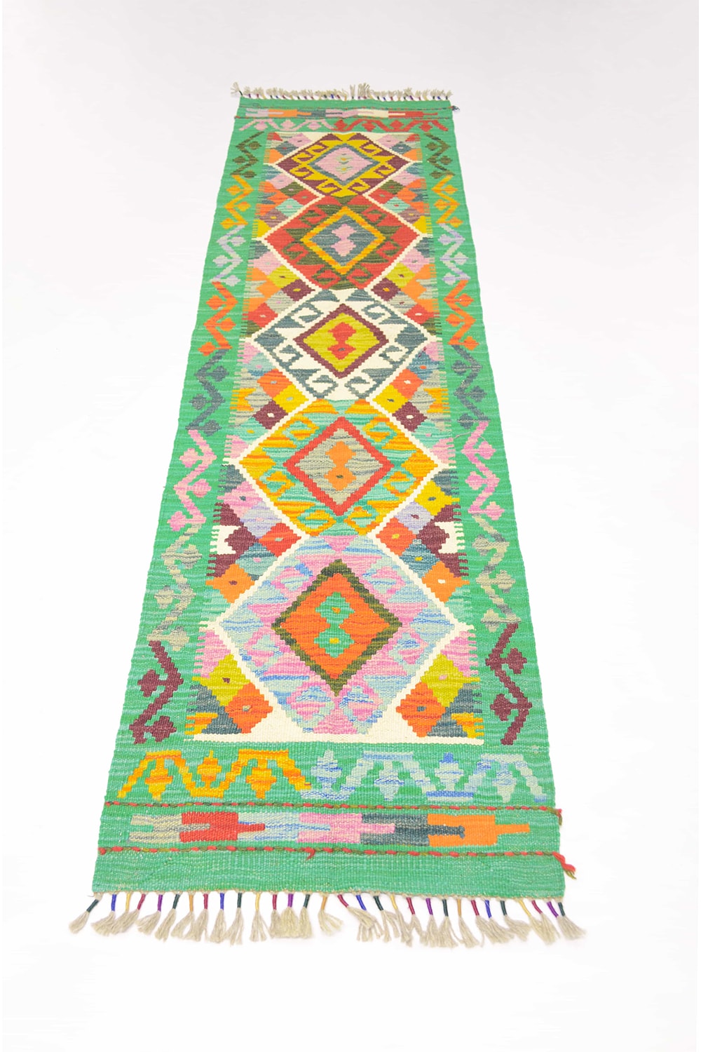 Yün İplikten El Dokuma Yeşil Afgan Kilim Yolluk 56x200 Cm