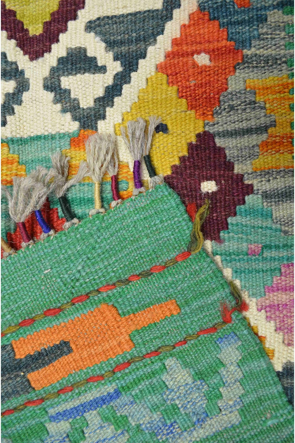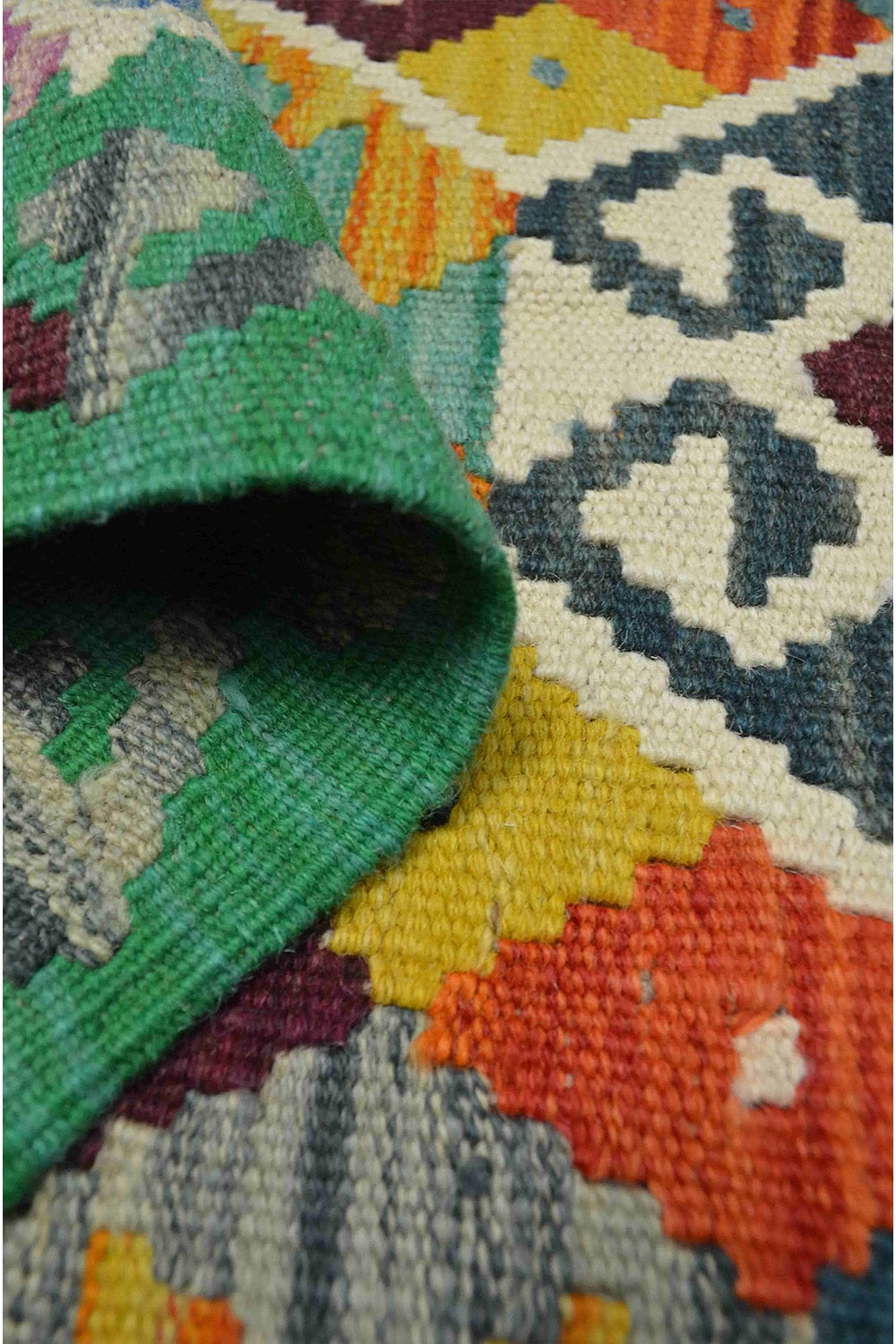 Afgan Kilimi, yün saçak üzerine yün iplikten, geleneksel el dokuma tekniğiyle hazırlanmış özel bir kilimdir. Yeşil tonları ve geometrik desenleriyle dikkat çeker, otantik görünümüyle dar ve uzun alanlara doğal bir dokunuş katar.