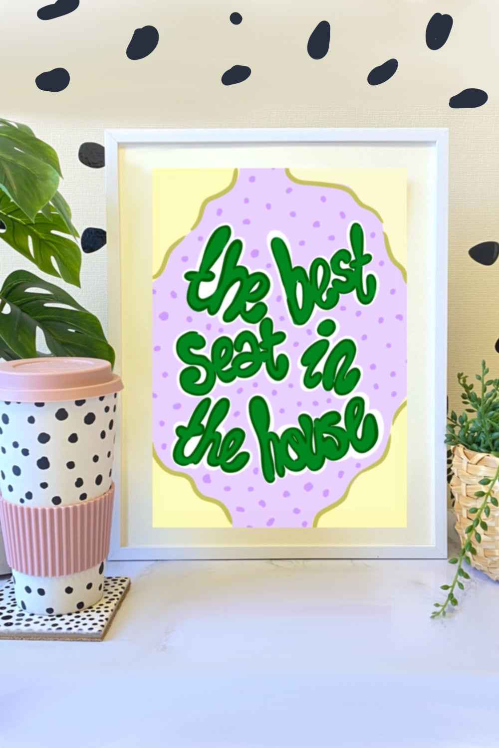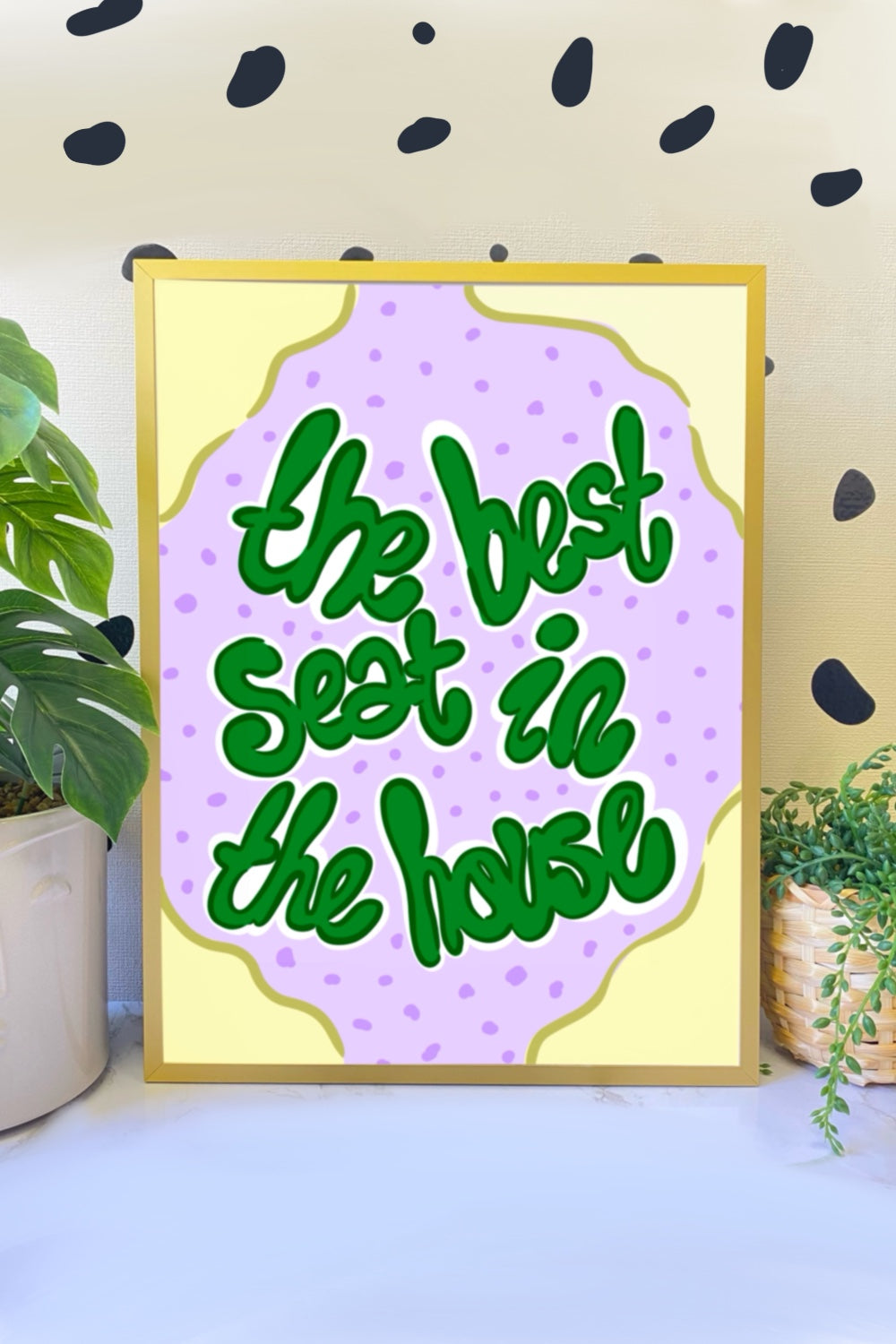 "The Best Seat" adını verdiğiniz bu baskı, banyo koleksiyonunuz için özel olarak tasarlanmıştır. Üzerindeki özel tipografiyle "The Best Seat in the House" ifadesi, banyonuzdaki tuvaletinizi eşsiz ve özel bir konuma yükseltirken aynı zamanda komik ve keyifli bir detay sunar.