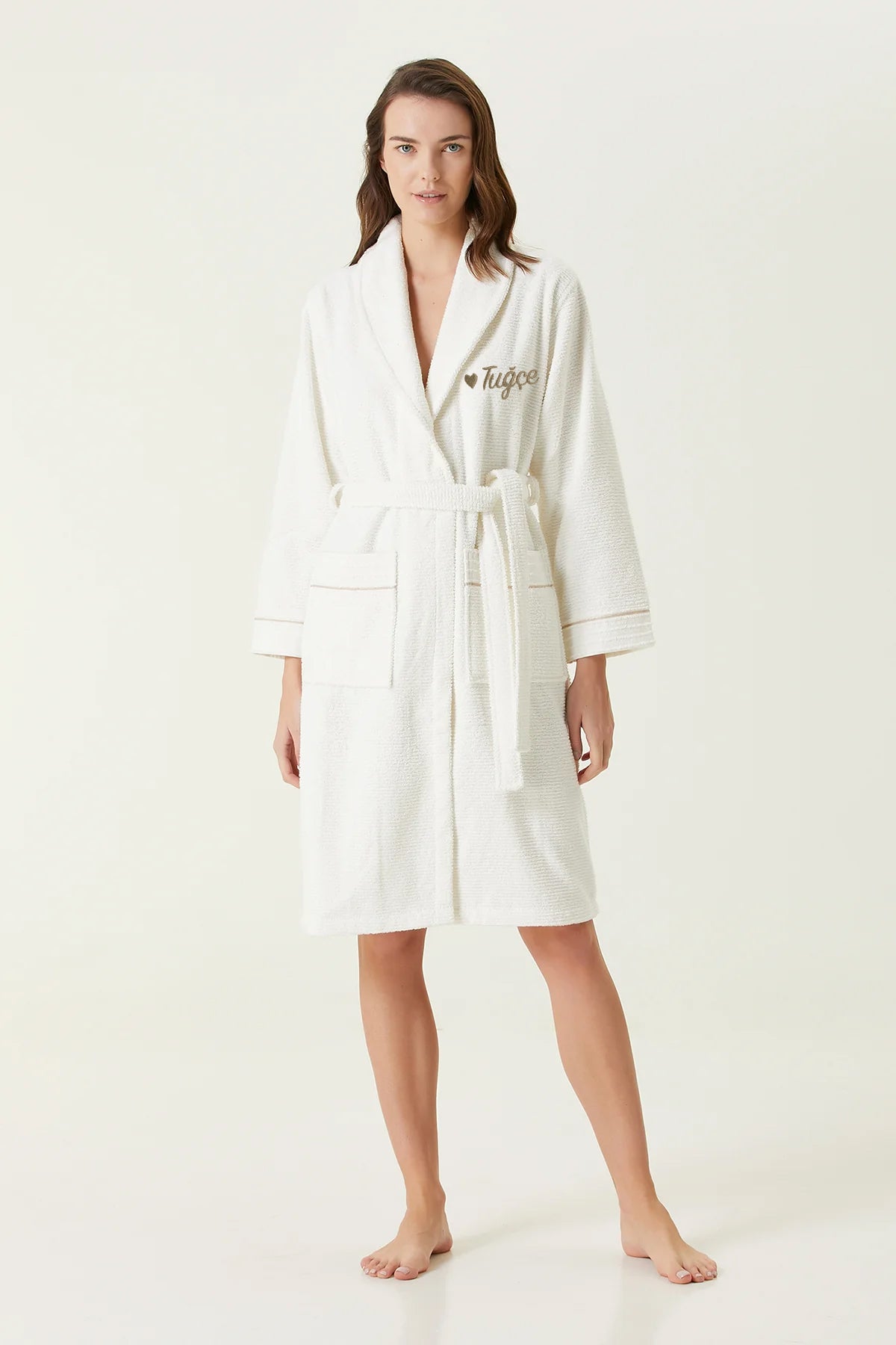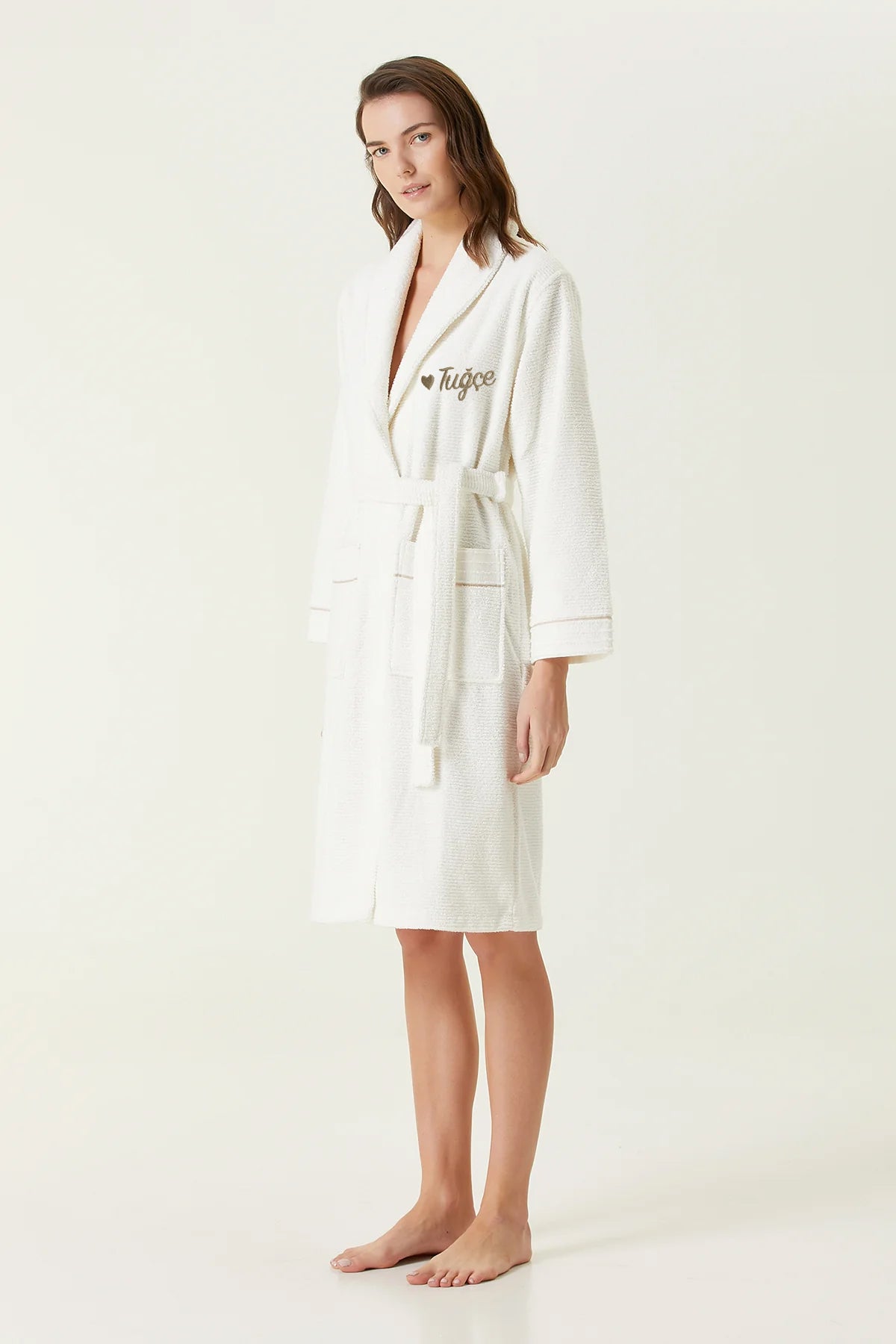 Roya Kişiselleştirilmiş Nakışlı Kadın Bornoz Ekru