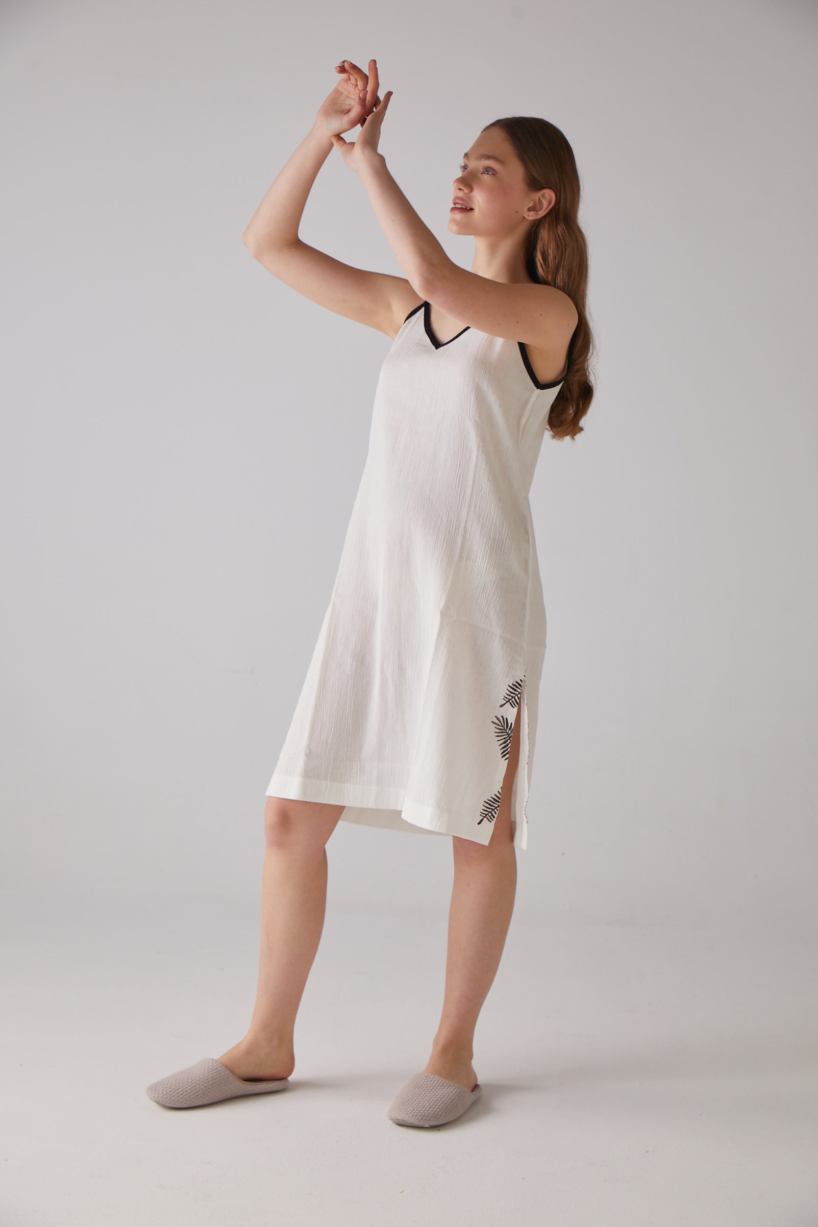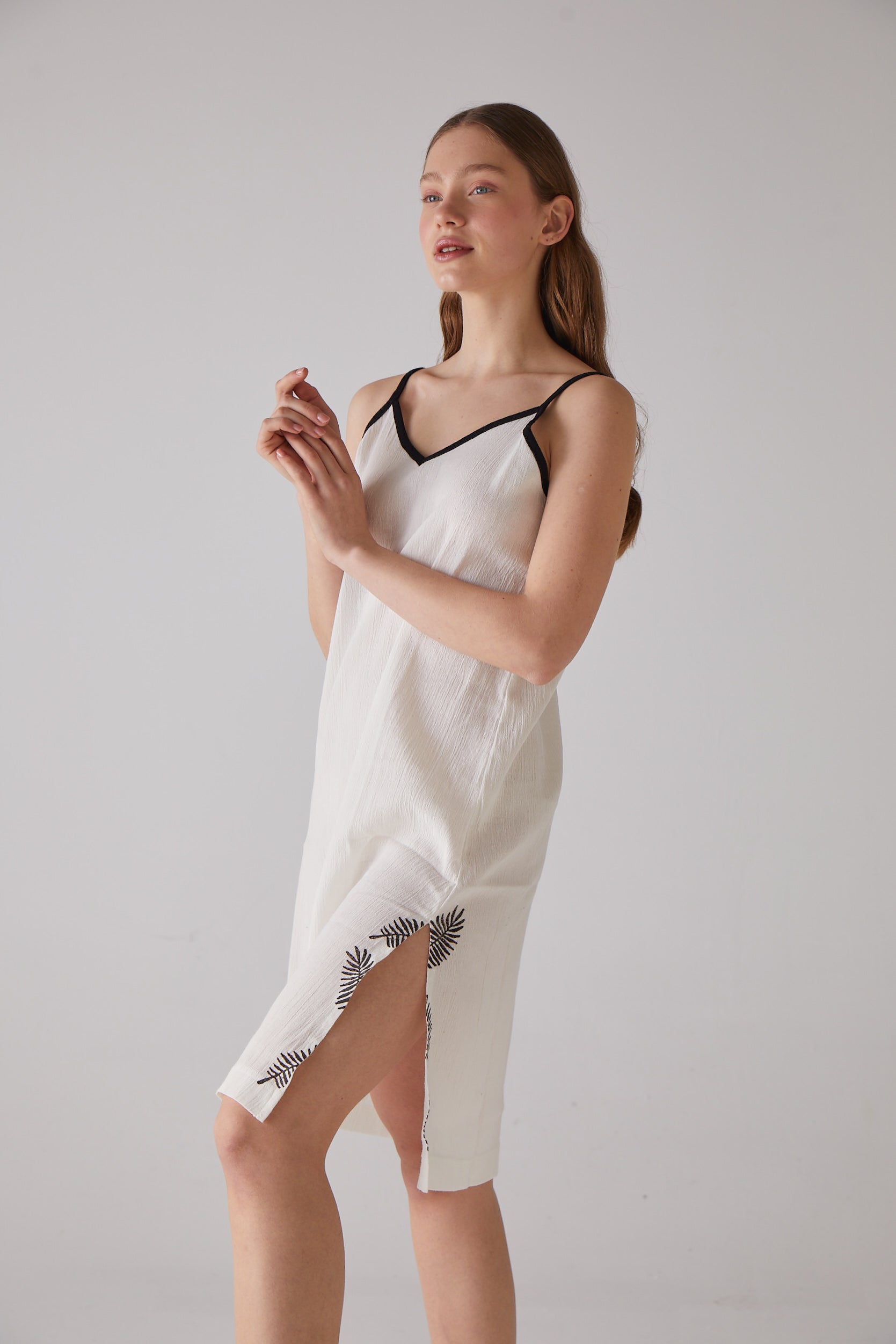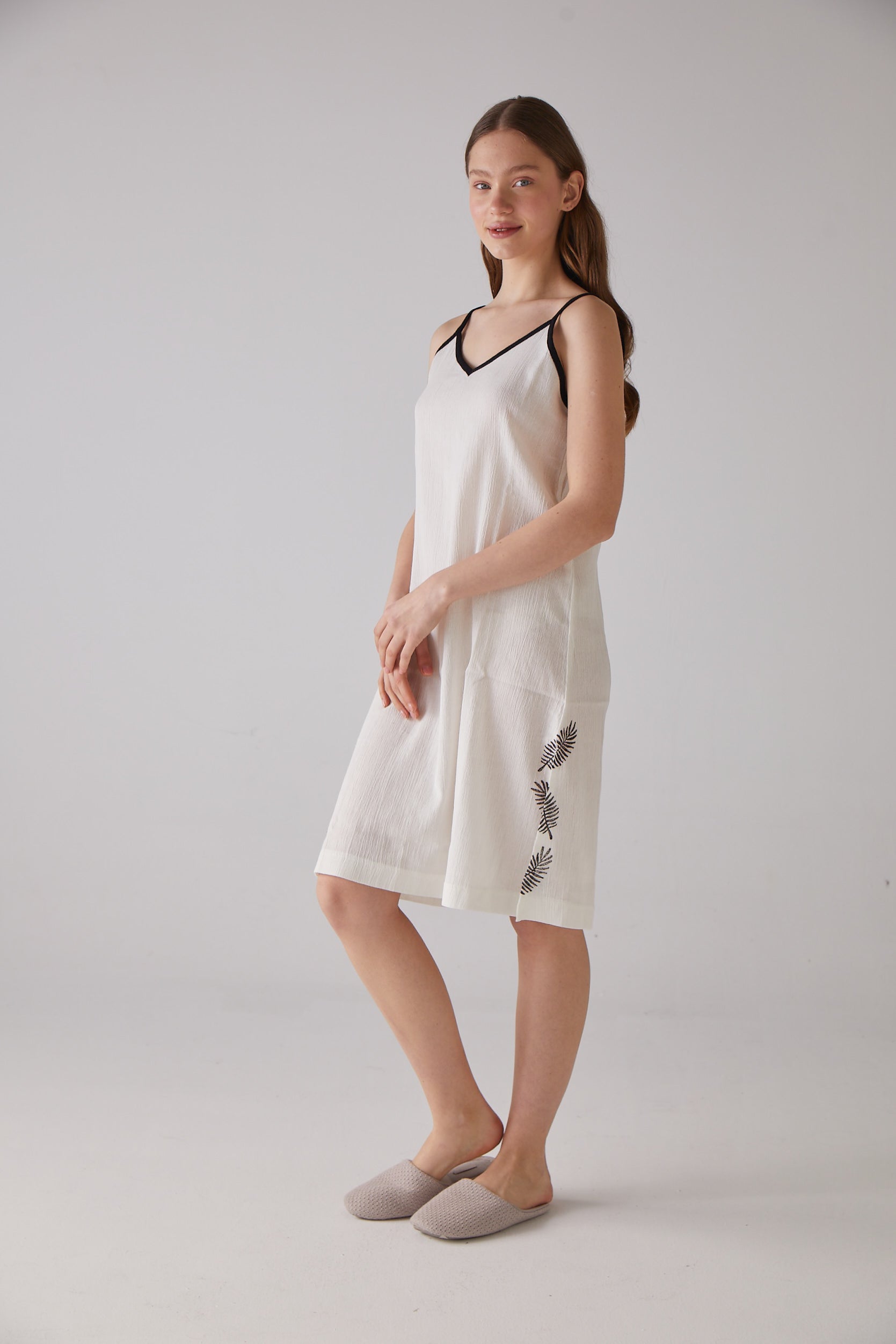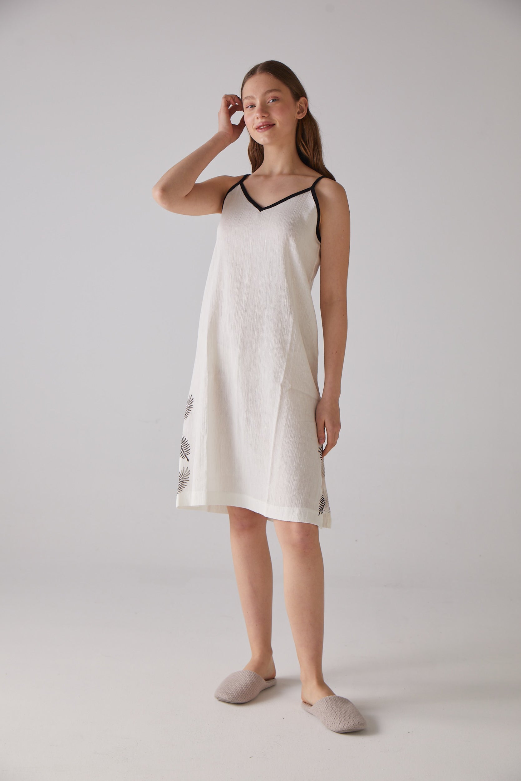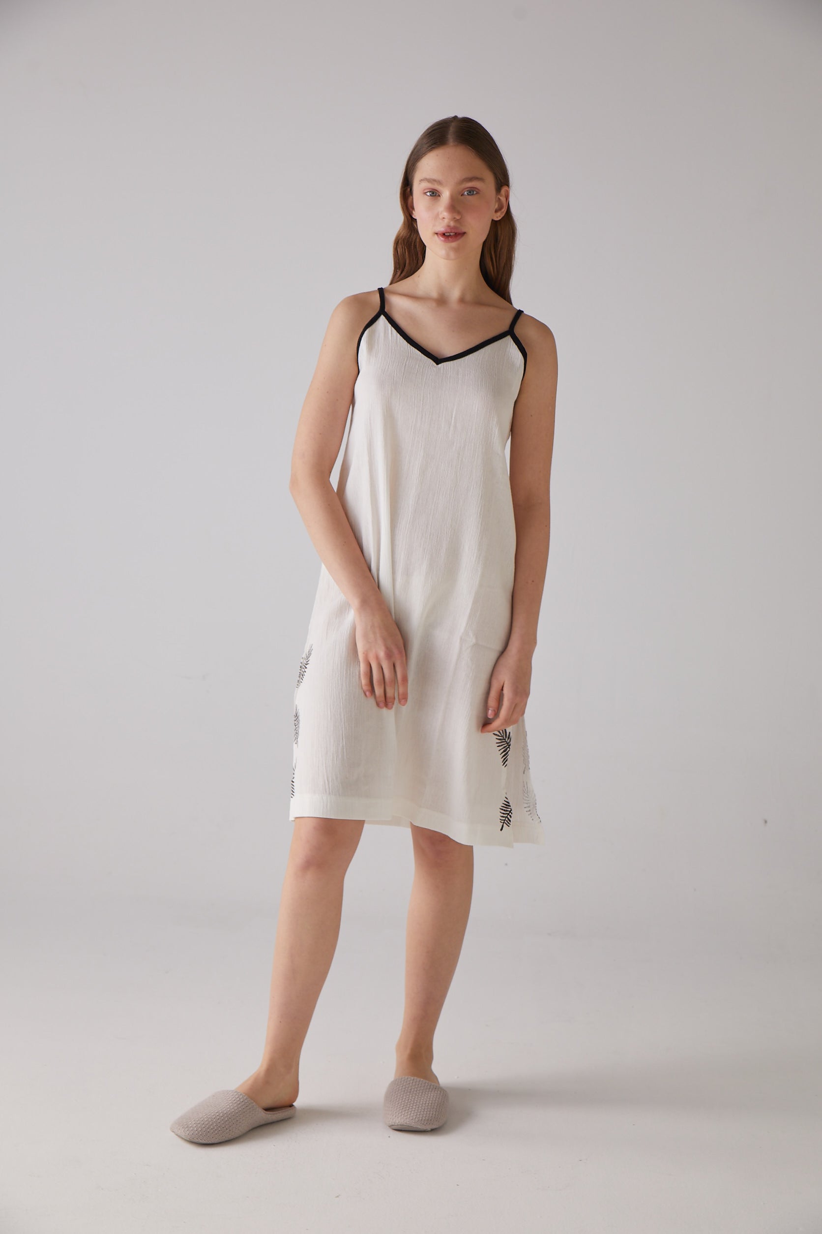 Yaprak Desen Askılı Beyaz Gecelik
