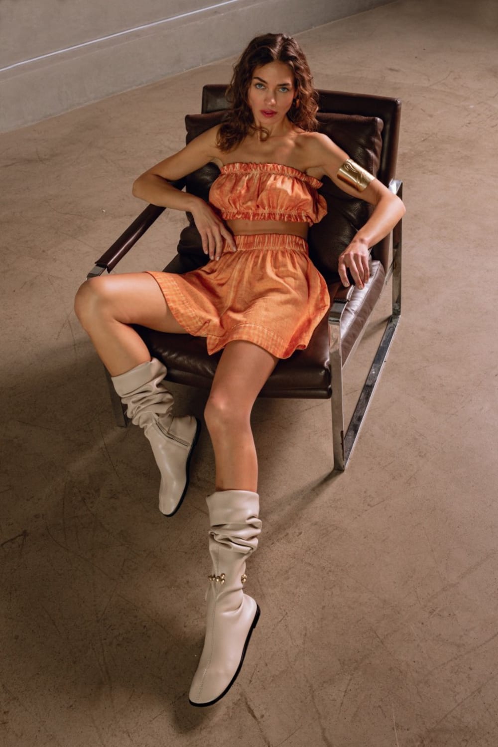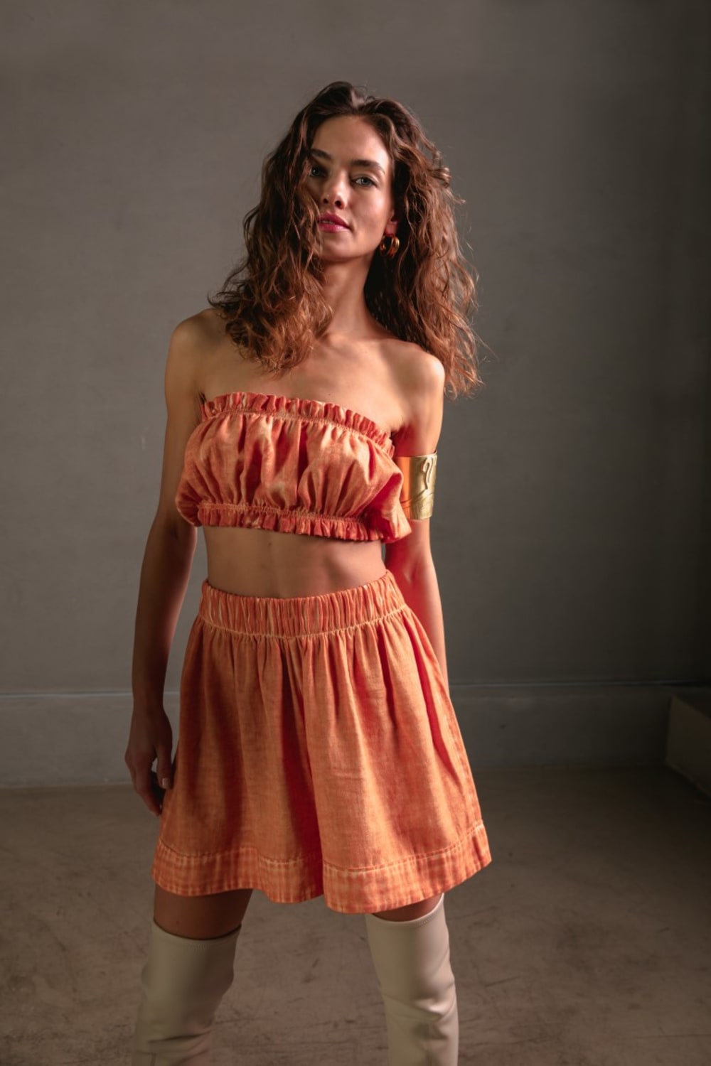 Doğal keten ve pamuk lifleriyle harmanlanarak yavaş yavaş dokunan bu rahat kesim şort, her bedene uyum sağlayan bir yapıya sahiptir.