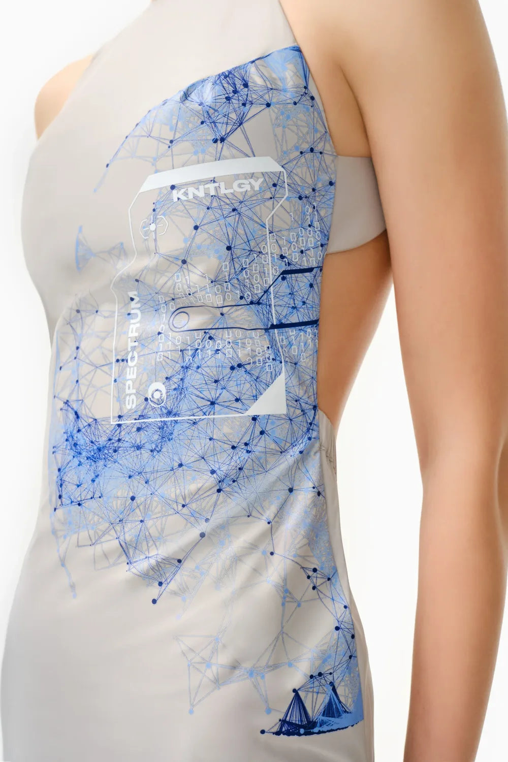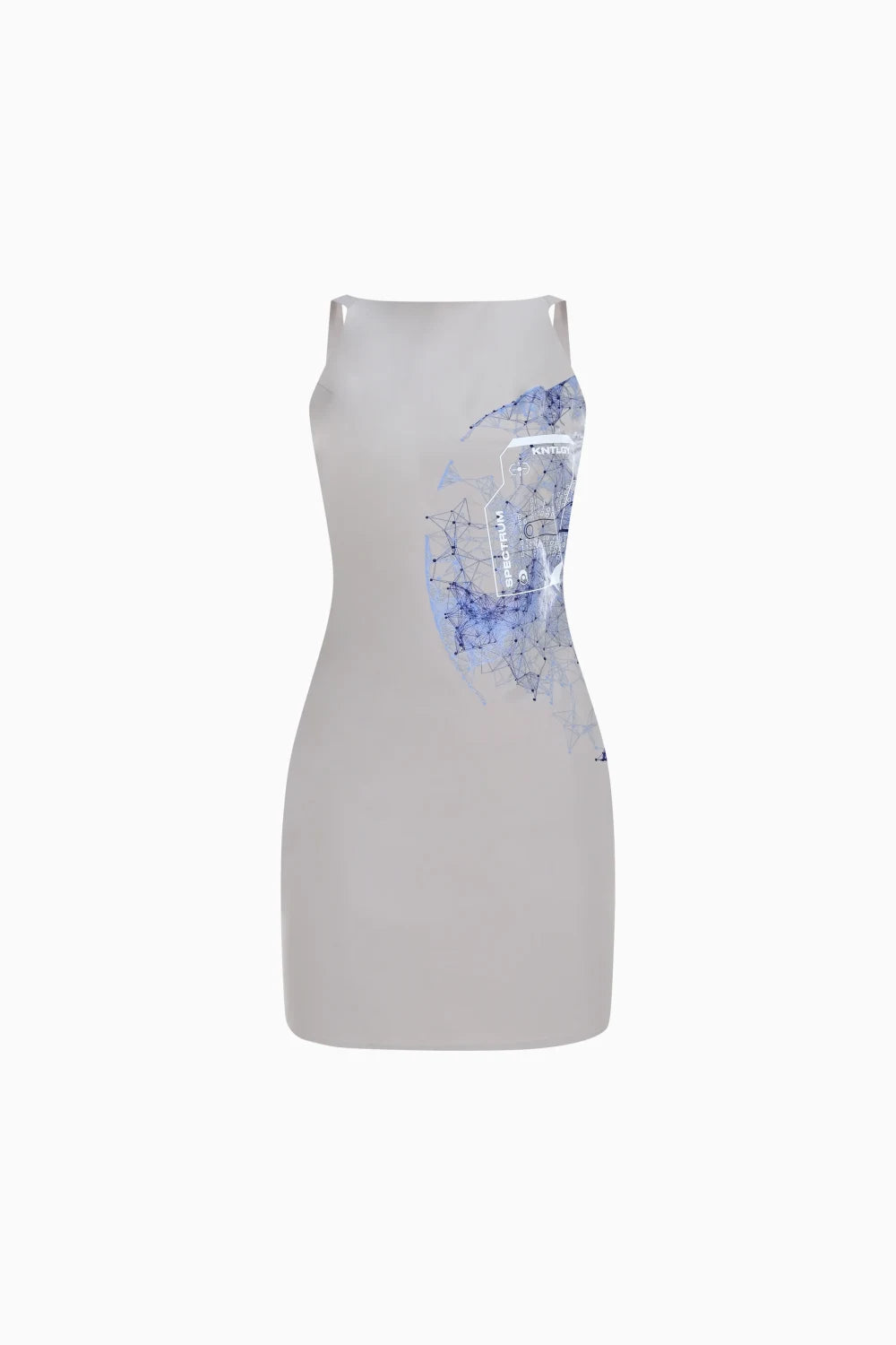Baskılı, kolsuz, sırtı capraz bant detaylı, beli lastikli, gri paraşüt kumaş mini elbise.