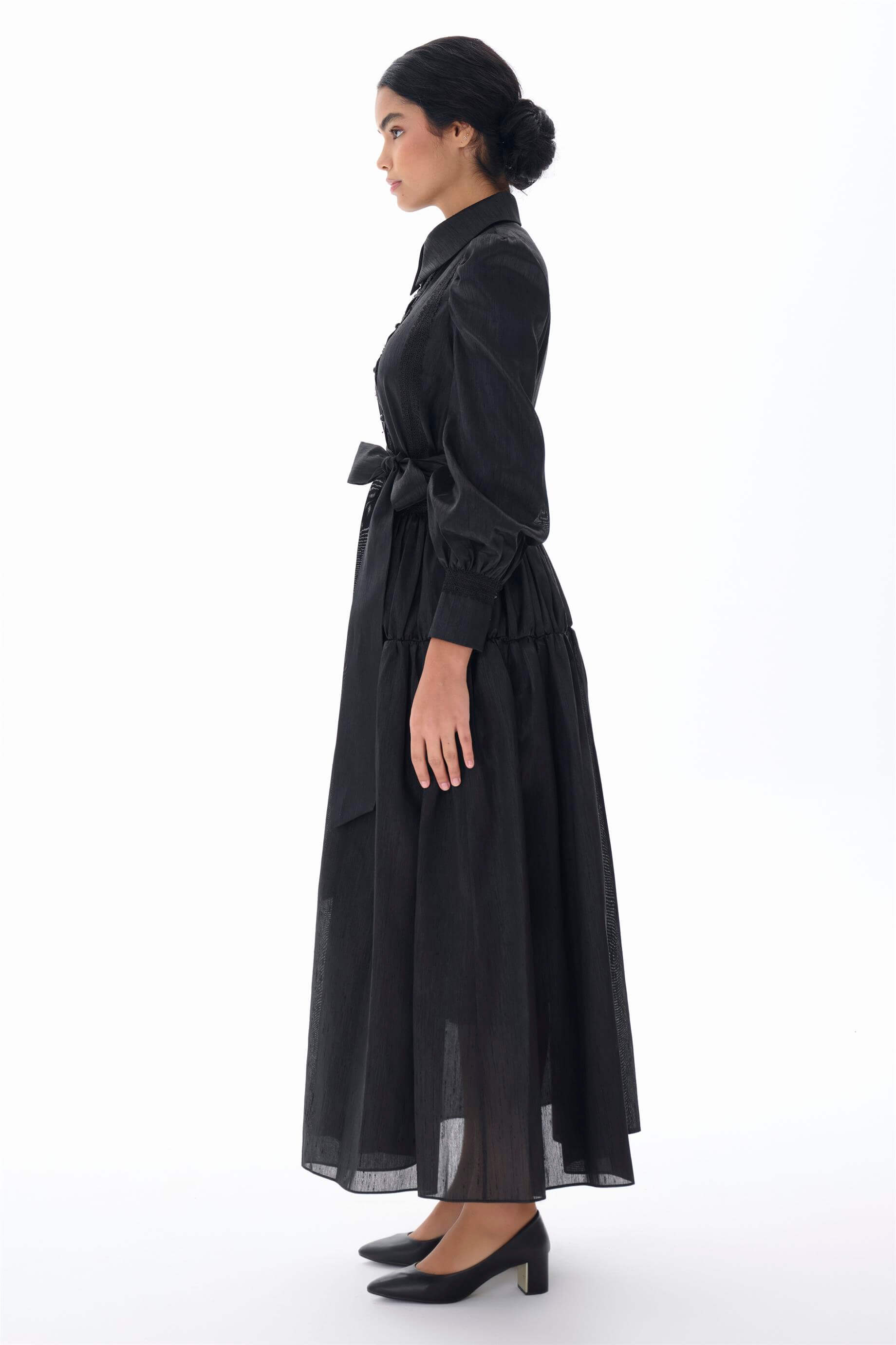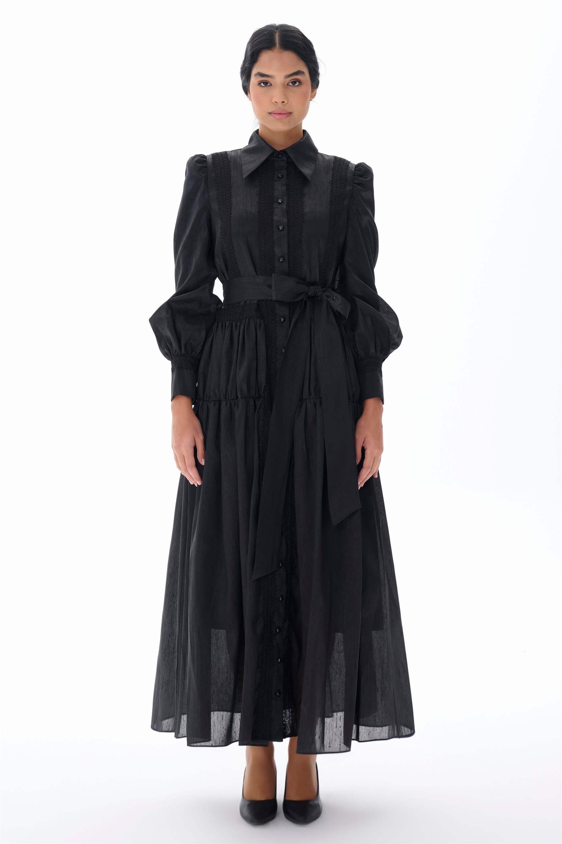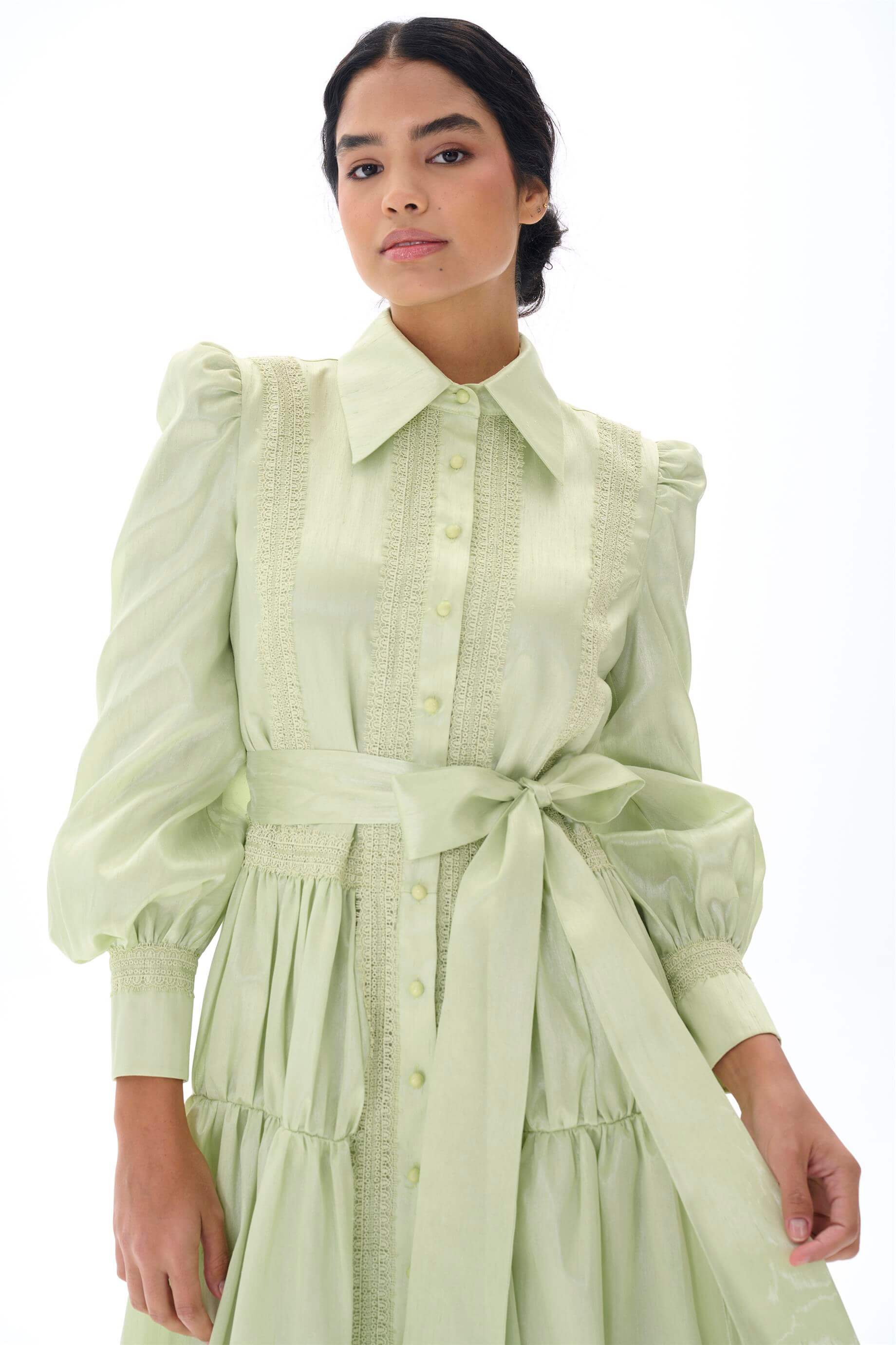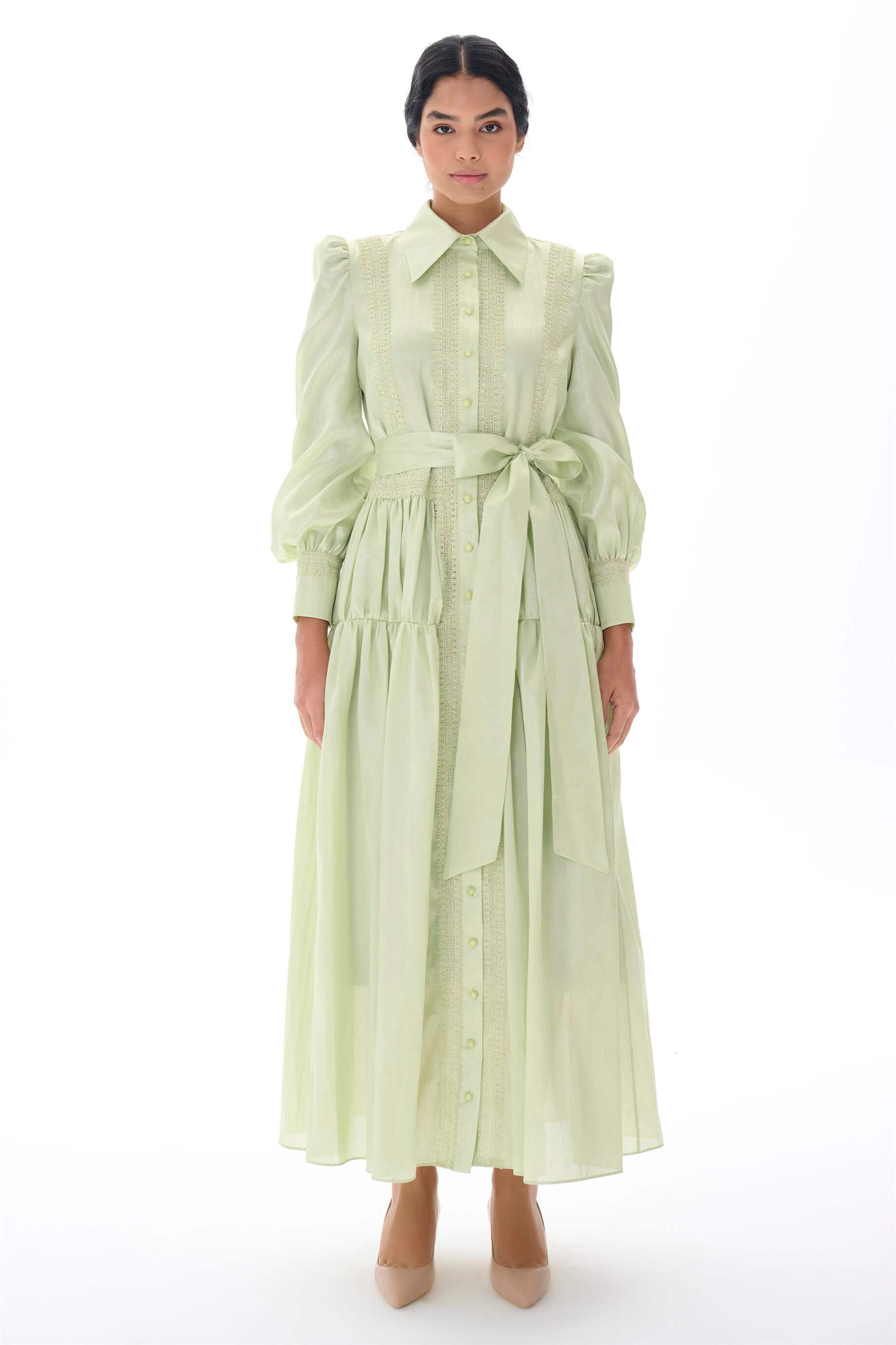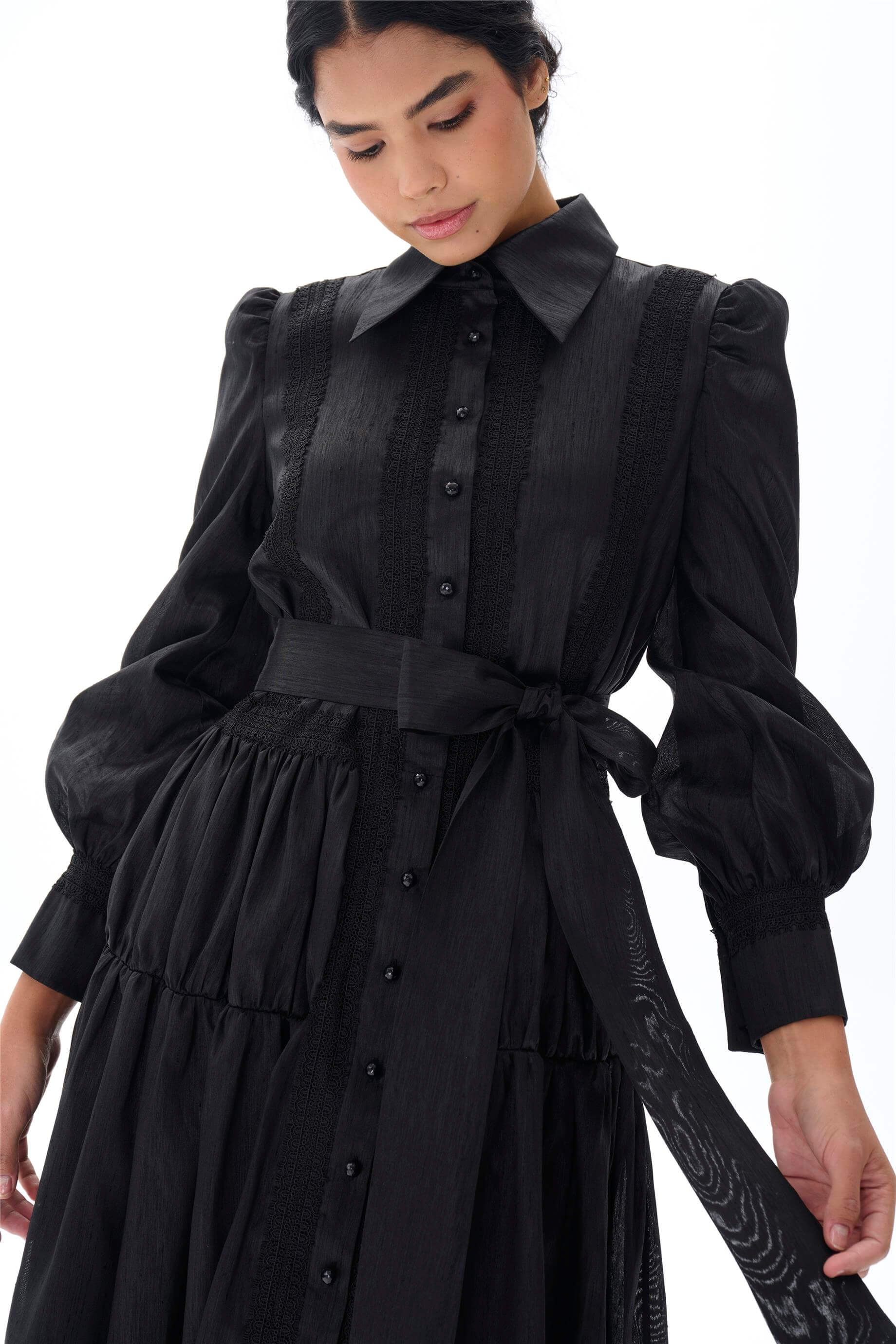 - Ürün Açıklaması: Bu etkileyici elbise gardırobunuzun vazgeçilmez parçalarından biri olmaya aday.Önü düğmeli gömlek yaka detaylı bu elbisenin ön bedeni ve manşet ağzı dantel işlemelerle süslenmiş,geniş etek kesimi ve belinde bulunan kuşak detayı ile tafta kumaşın göz alıcı dokusu ve bütünleşerek size zamansız bir şıklık sunacak.