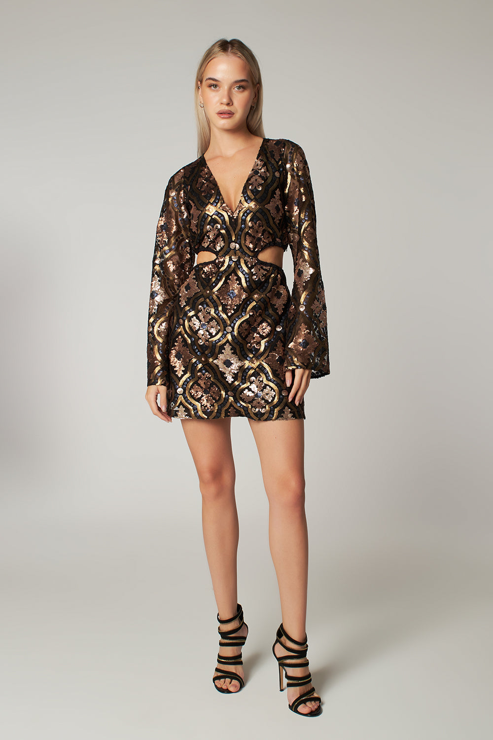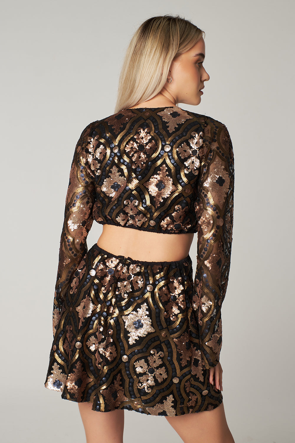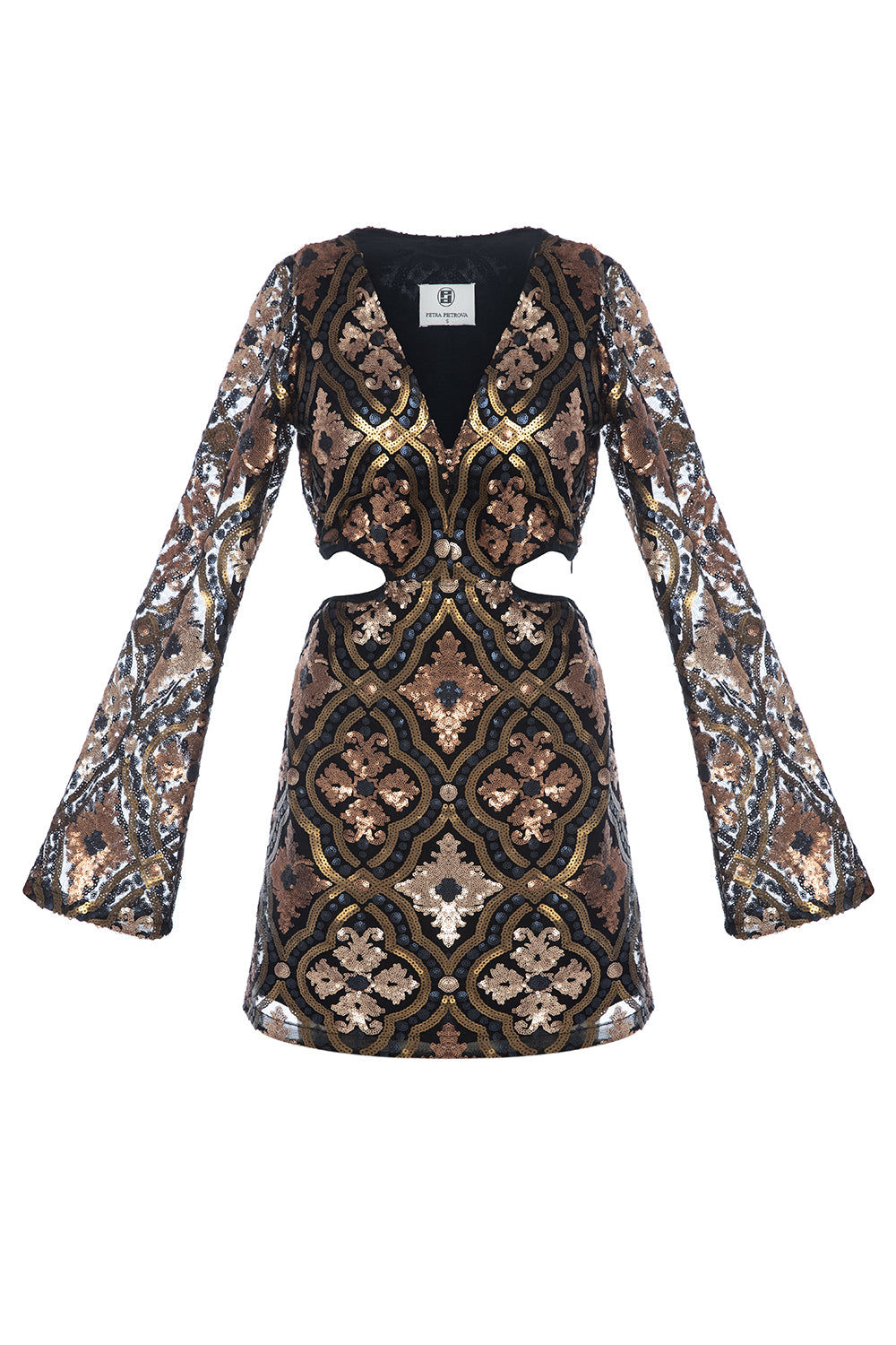 Matt Gold - Minivestido estampado de lentejuelas Dore: Aporta una silueta llamativa y muy esbelta con sus mangas largas y anchas y sus cortes en los laterales y la espalda del vestido. La falda A-Line tiene un fino elástico oculto en la cintura, lo que añade comodidad adicional al vestido. Se utiliza un forro de tela de algodón transpirable y antisudor para prevenir la irritación de la piel.
