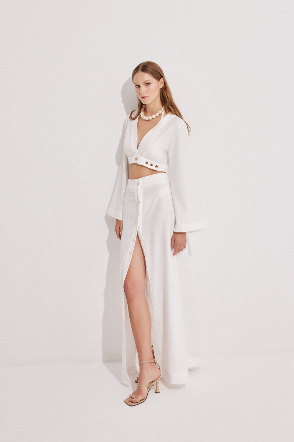Doğal keten kumaşının hafifliği ve şıklığı ile tasarlanan bu takım, yaz boyunca konfor ve stil sunar.