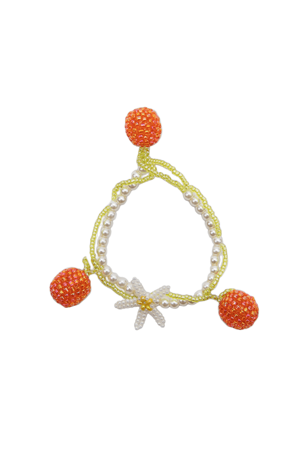 Cada fruta está trenzada con cuentas de vidrio utilizando hilo de pescar con una capacidad de resistencia a la rotura de más de 7 kg. Las perlas se colorean añadiendo un agente colorante a la pasta de vidrio durante la fase de producción. Es resistente a factores externos como el mar, el sol y los perfumes.