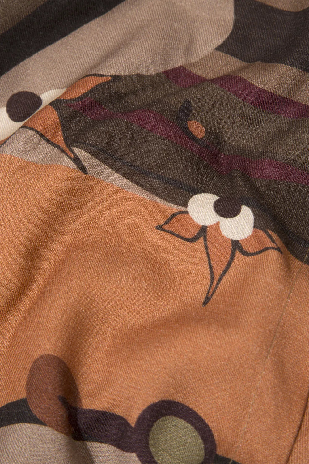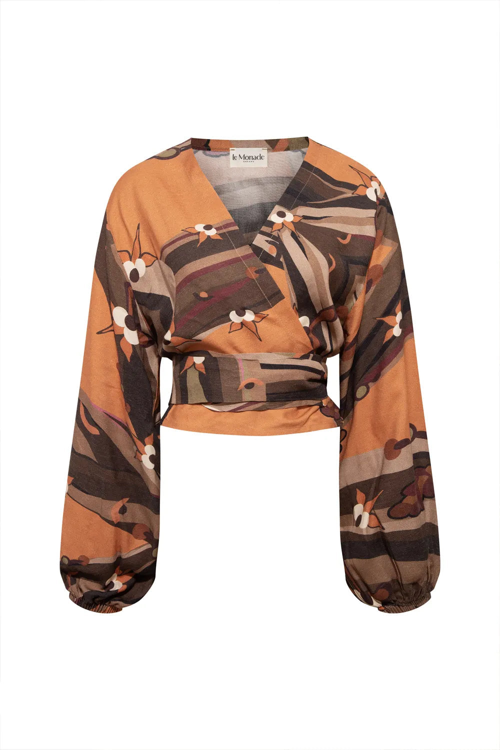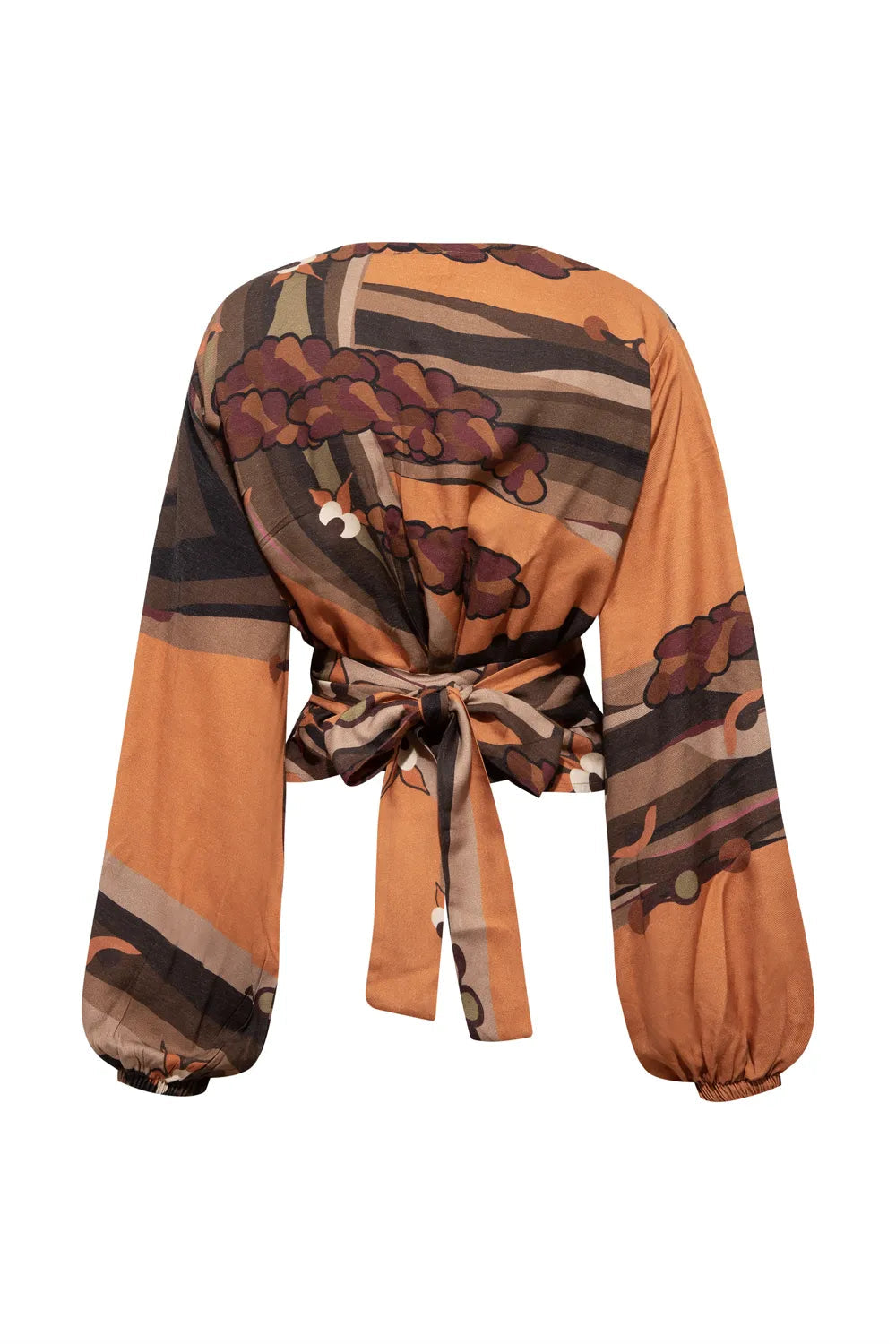 Kahve Ağaç Desenli Kruvaze Bağlamalı Bluz