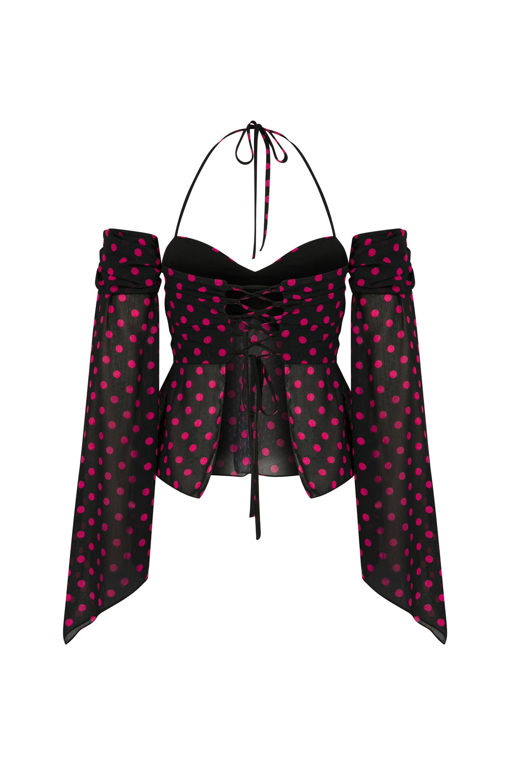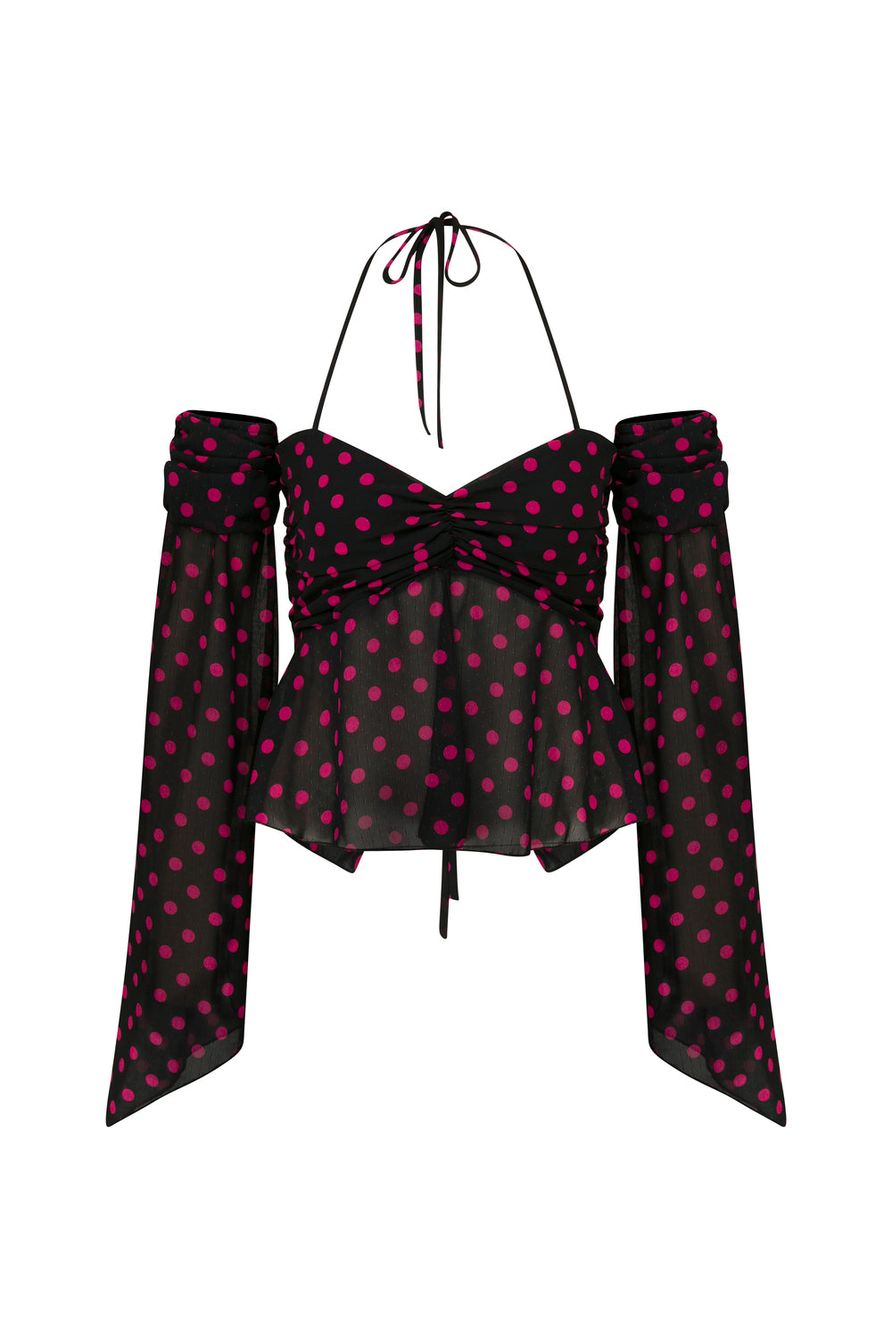 Fuşya Puantiye Desenli Şifon Crop Bluz