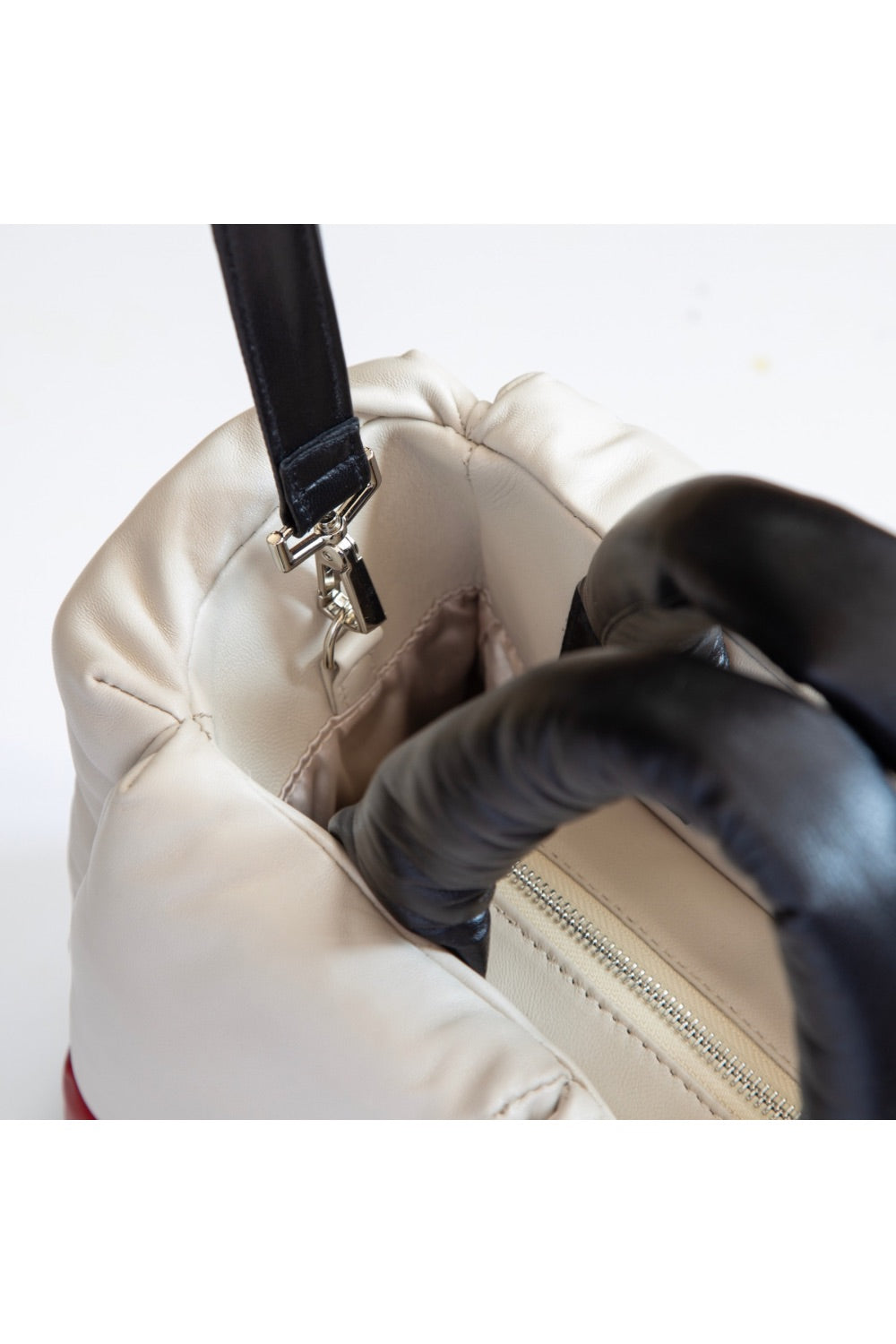 Fildişi, kırmızı, mavi ve siyah renk bloklarının asimetrik yerleşimi çantaya sofistike bir görünüm kazandırıyor. %100 doğal kuzu derisiyle el işçiliğiyle üretilen bu tasarım, yumuşak viskon astarı, gümüş fermuarlı kapanışı ve içindeki 3 cep ile hem estetik hem işlevsellik sunuyor.