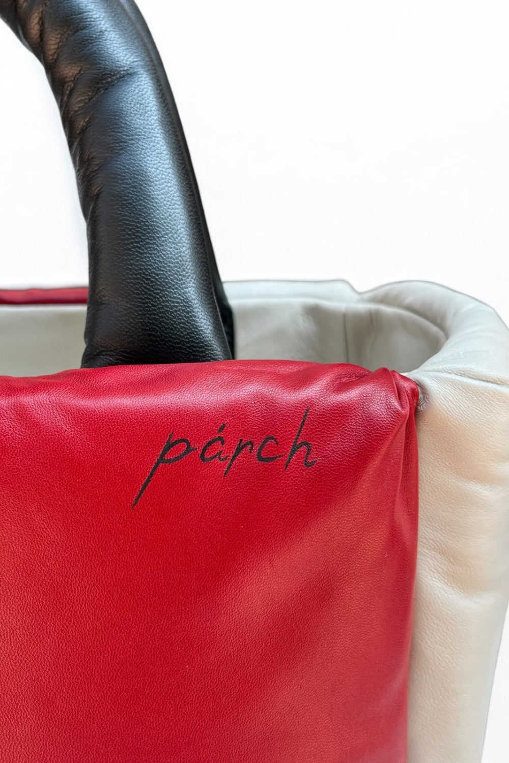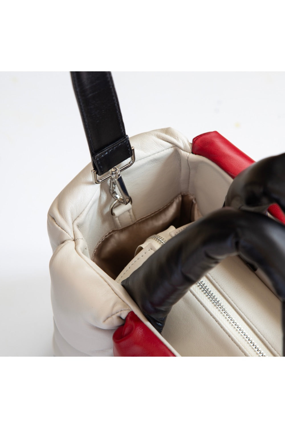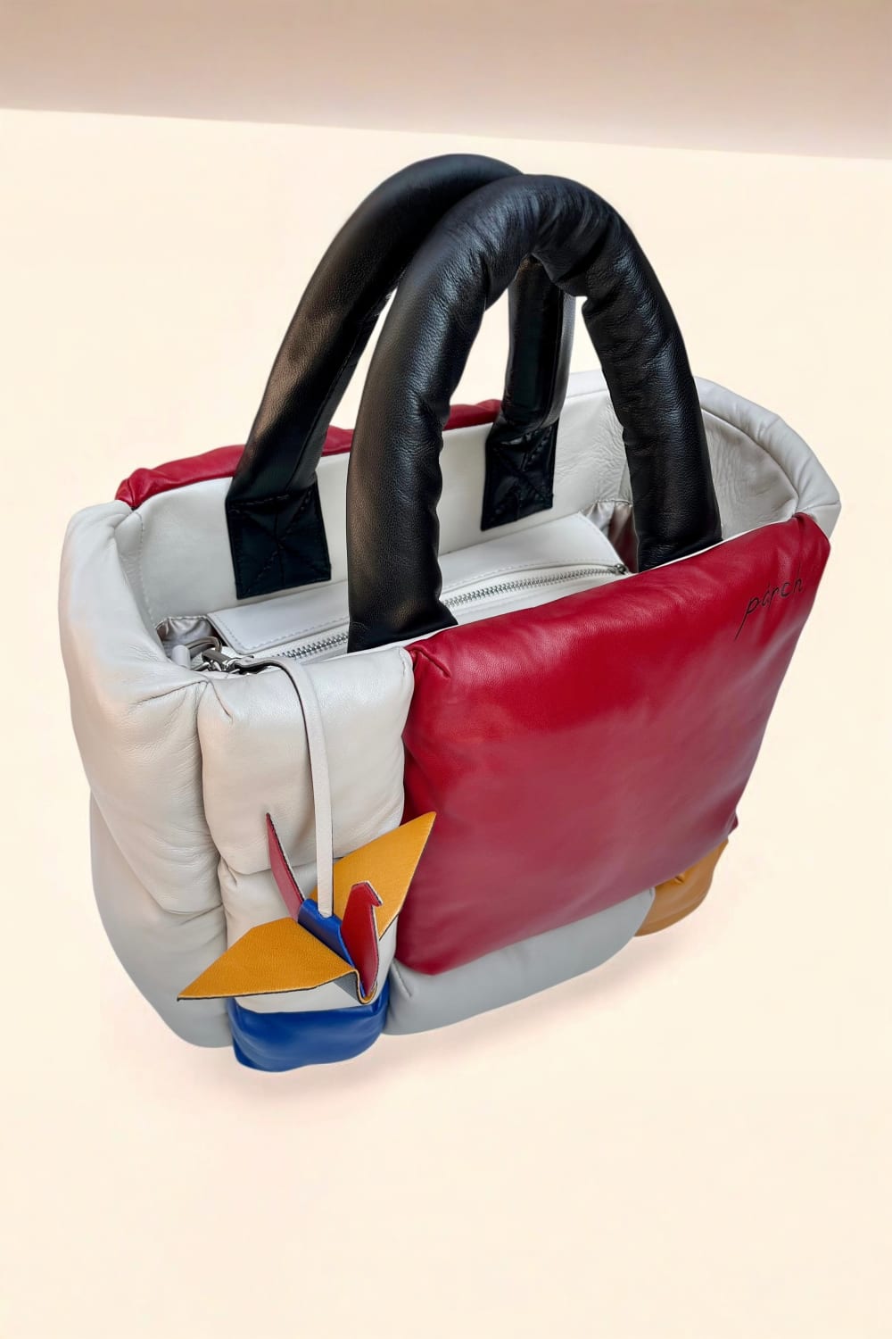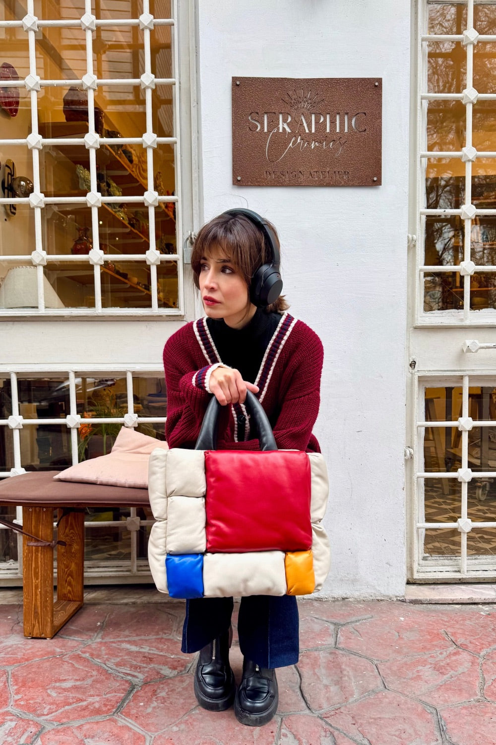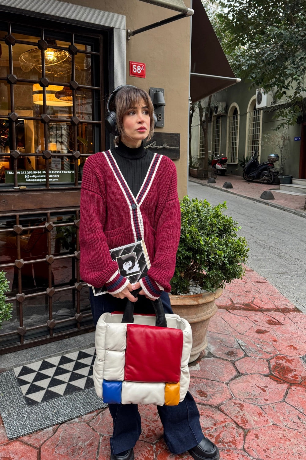 Kırmızı ana blok etrafında asimetrik şekilde yerleştirilmiş beyaz, mavi, sarı ve siyah renk blokları, çantaya hem dikkat çekici hem de zamansız bir estetik kazandırıyor. %100 doğal kuzu derisinden, el işçiliğiyle üretilen bu tasarım; yumuşak viskon astarı, gümüş renkli fermuarı ve üç iç cebiyle günlük kullanıma işlevsel bir zarafet katıyor.