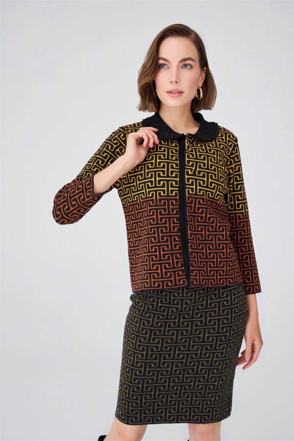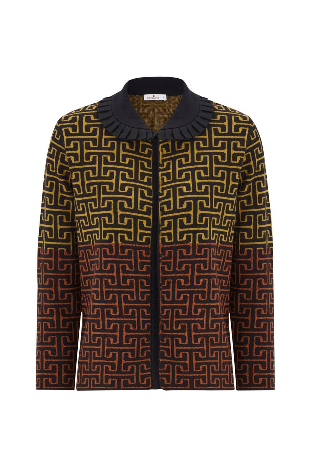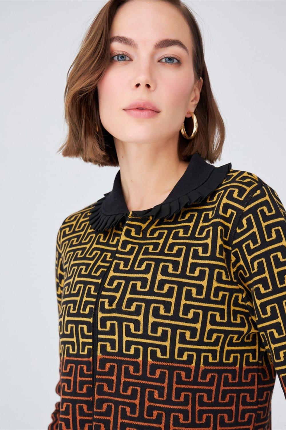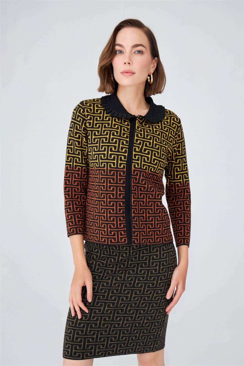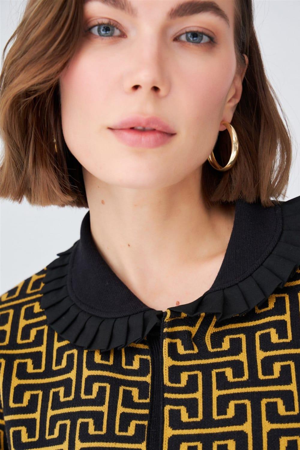 70% Algodón - 15% Lana Merino - 15% Acrílico Tela del pliegue del cuello: 100% algodón Medidas Modelo: Alto: 176 cm, Pecho: 89 cm, Cintura: 62 cm, Caderas: 89 cm El producto del modelo es talla S/36. Estampado geométrico de jacquard, mangas 3/4, detalle de pliegues, cuello de bebé, chaqueta corta Ajuste cómodo.