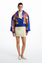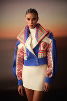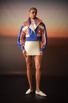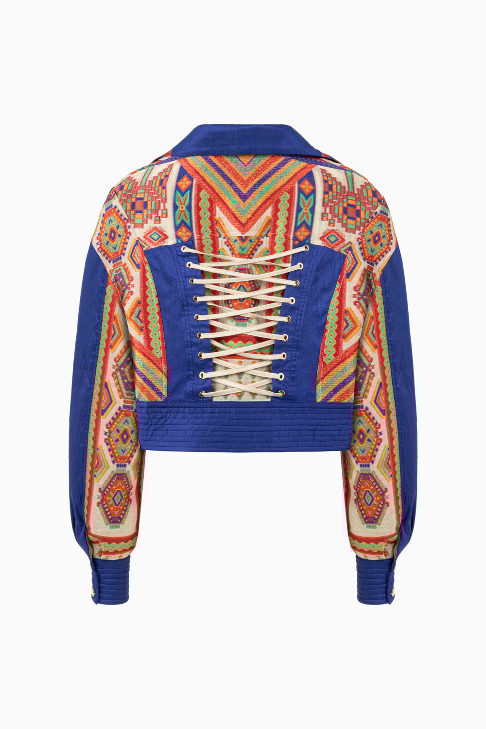 This version of Strada reimagines the set with a striking jacket featuring a large collar that can be worn up or folded down. Inspired by the layered colors of the stratosphere, the jacket includes corset lacing at the back for adjustability. With its bold design and vibrant energy, this piece feels both adventurous and grounded, embodying a sense of playfulness and freedom.