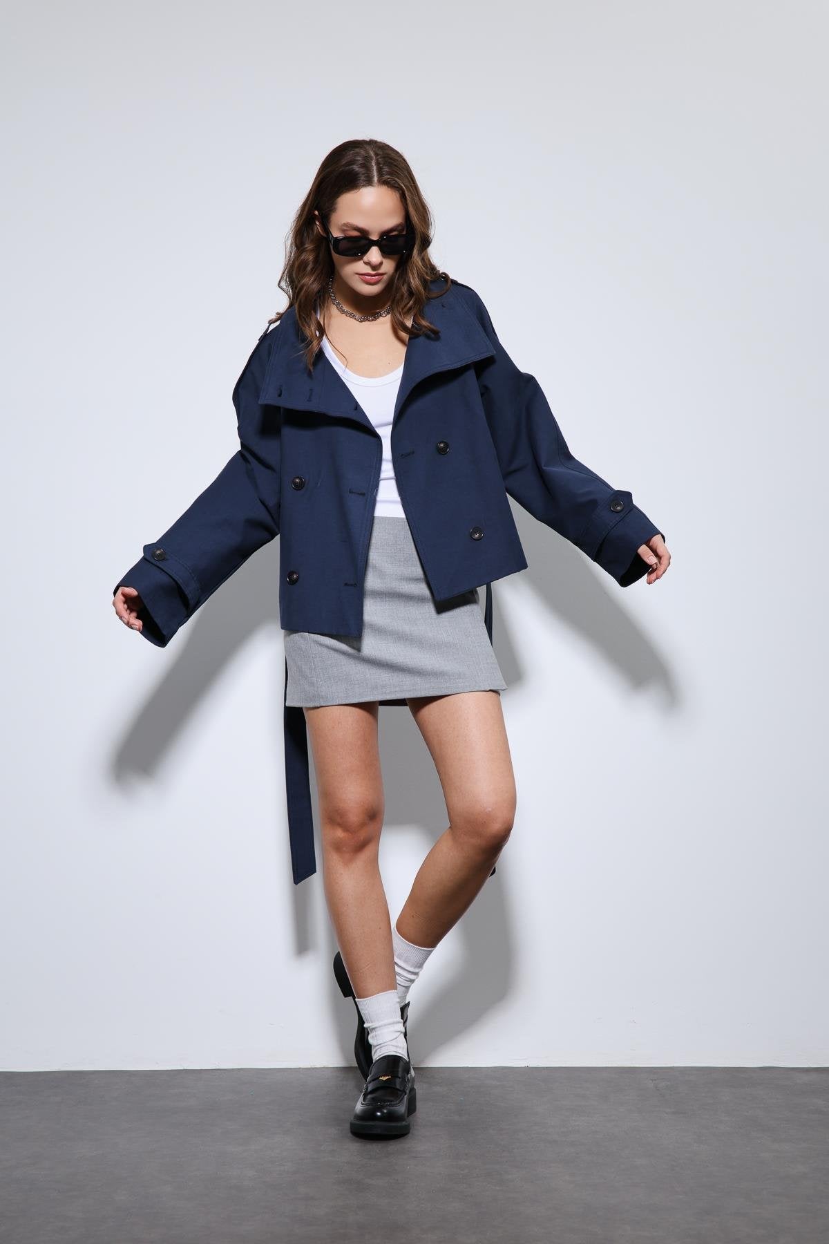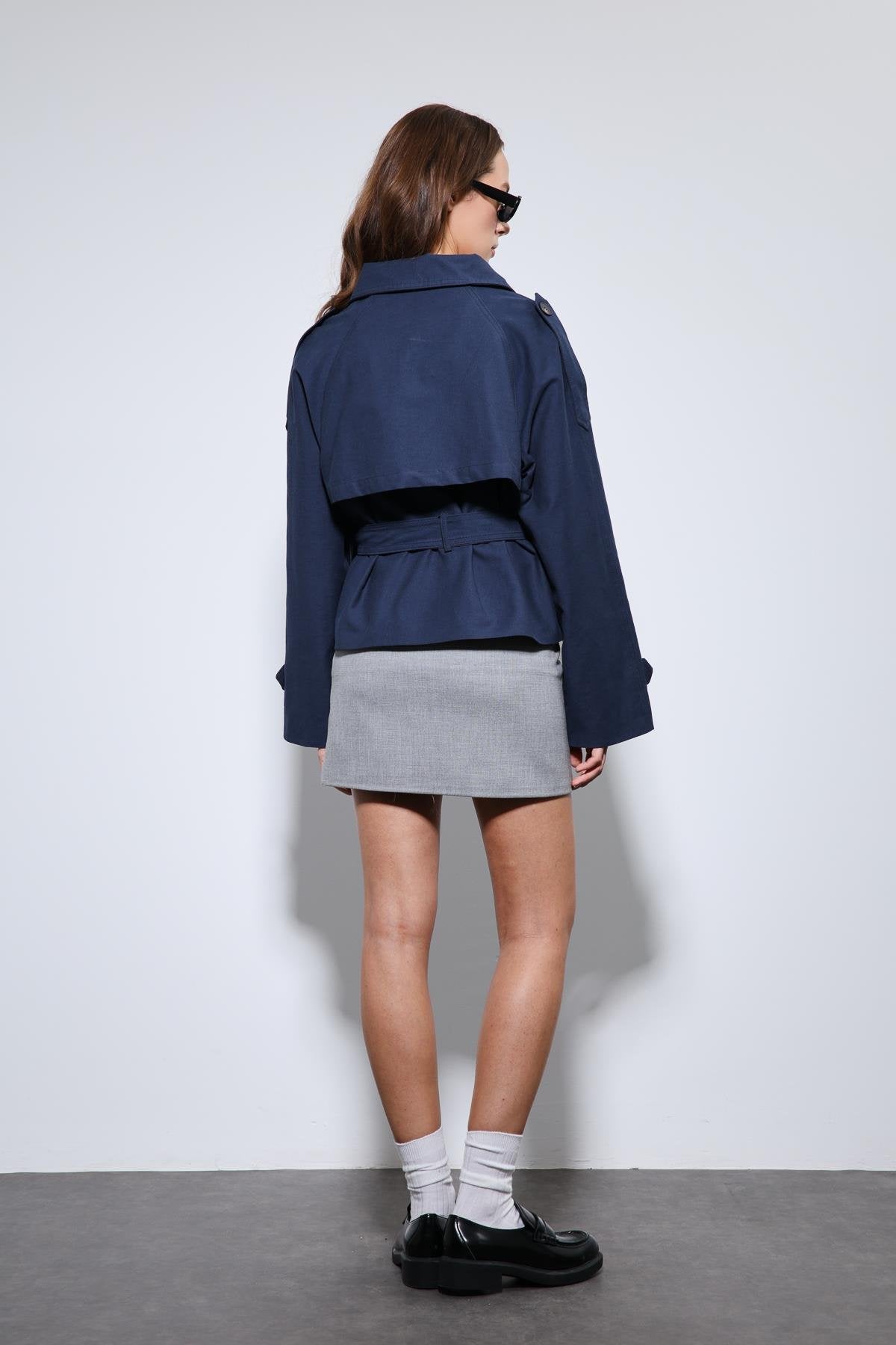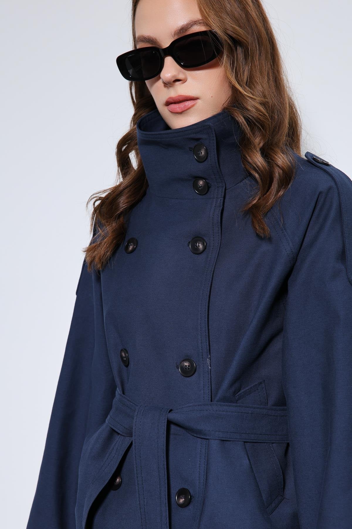 Lacivert Dik Yaka Kruvaze Trençkot