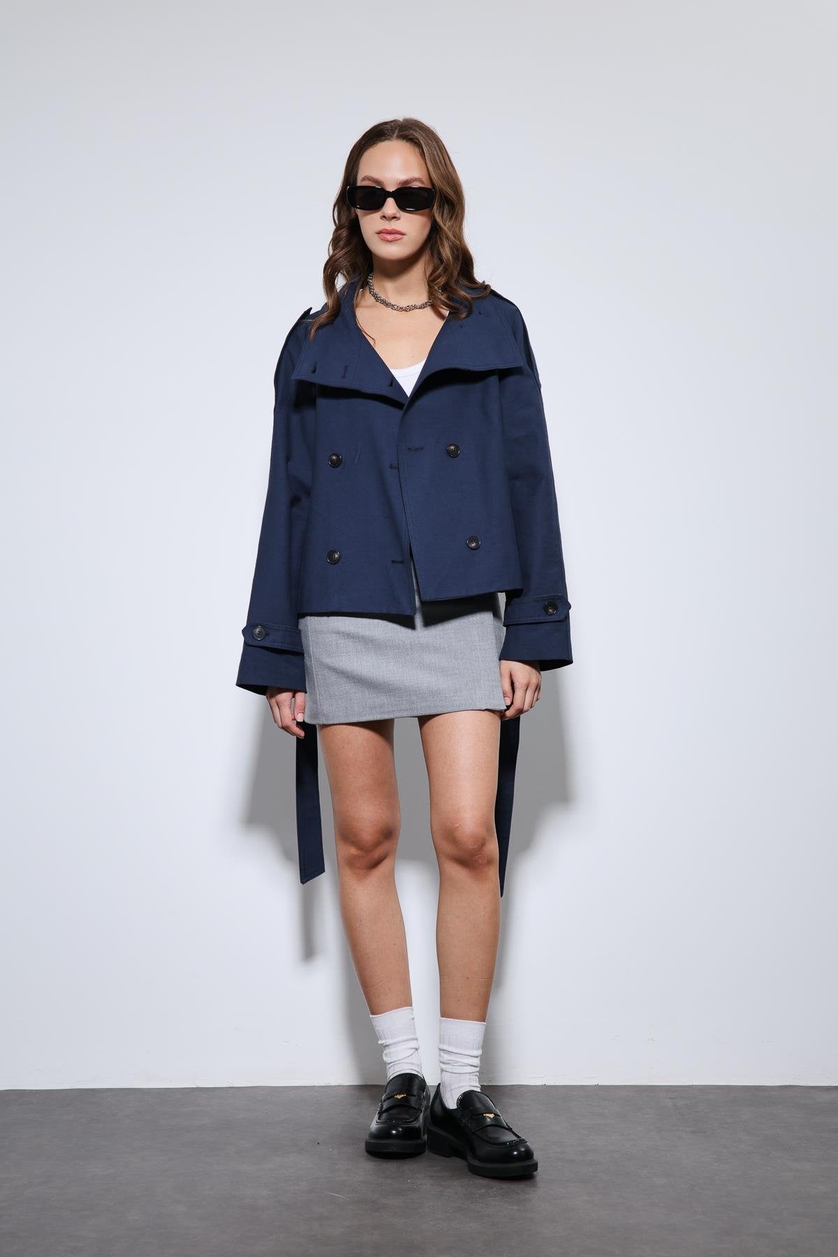 Lacivert renkte, dik yaka detayına sahip kruvaze kapamalı kadın trençkot modelidir. Minimal çizgisi ve modern kesimiyle hem günlük hem de klasik kombinlere uyum sağlar. Fleto cepleri ve kemerli tasarımıyla işlevsel ve şık bir görünüme sahiptir. Sonbahar ve kış sezonunda konforlu bir kullanım sunar. Türkiye’de üretilmiştir.
