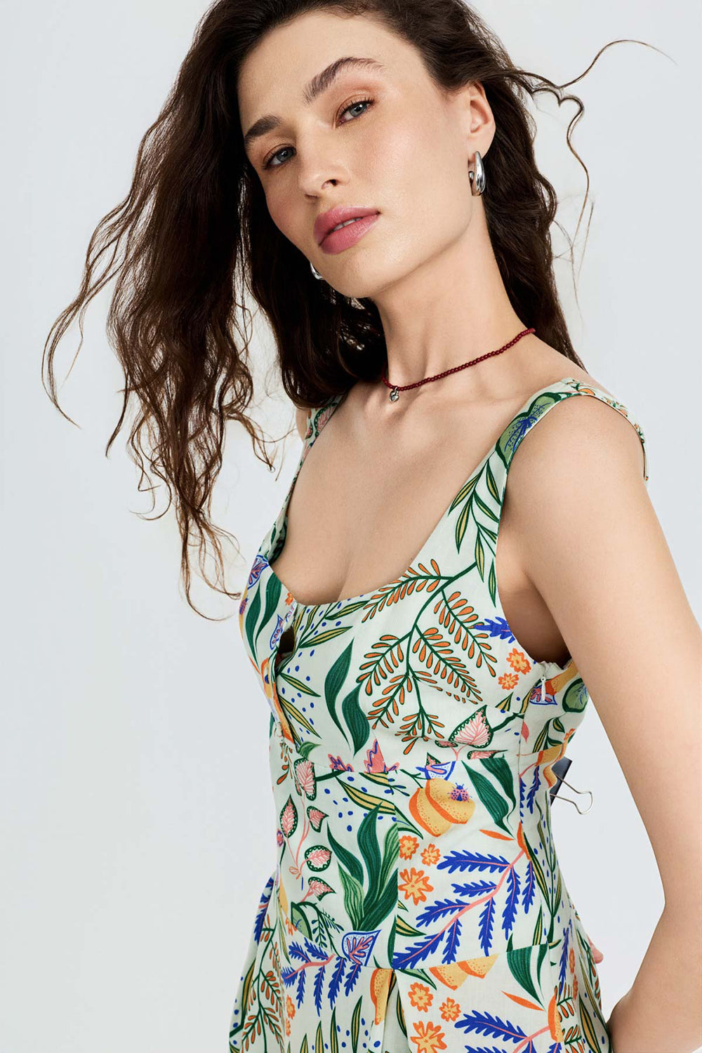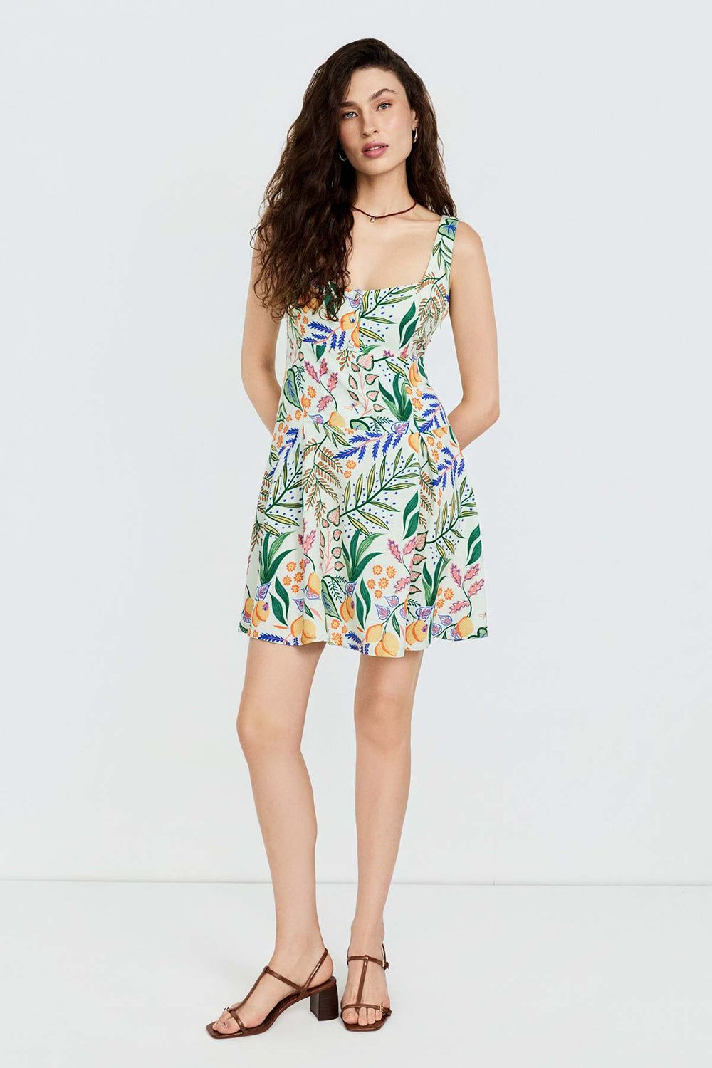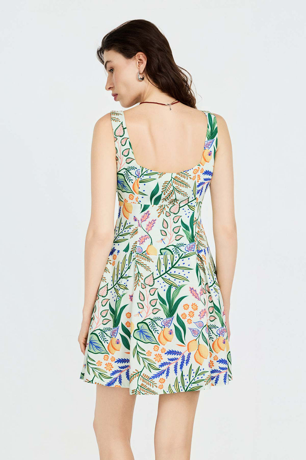 Keten karışımlı kumaşı ile rahat bir kullanım sağlayan bu askılı ve mini boy elbbise kendine özgü limon desenli baskısı ile sıcak yaz günleri için harika bir görünüm sunuyor.