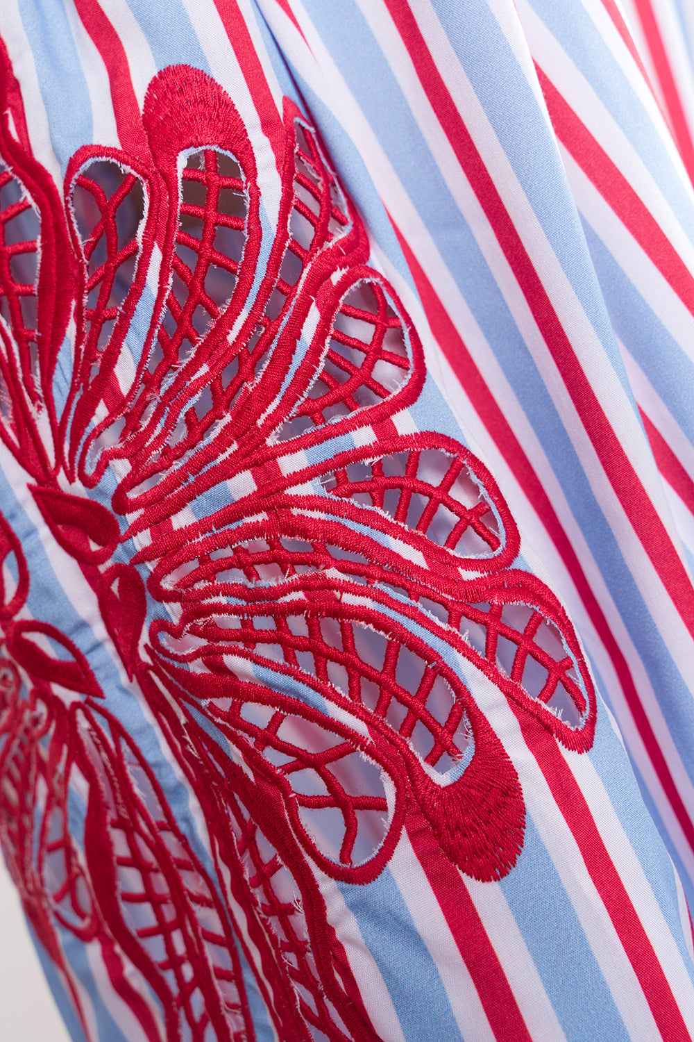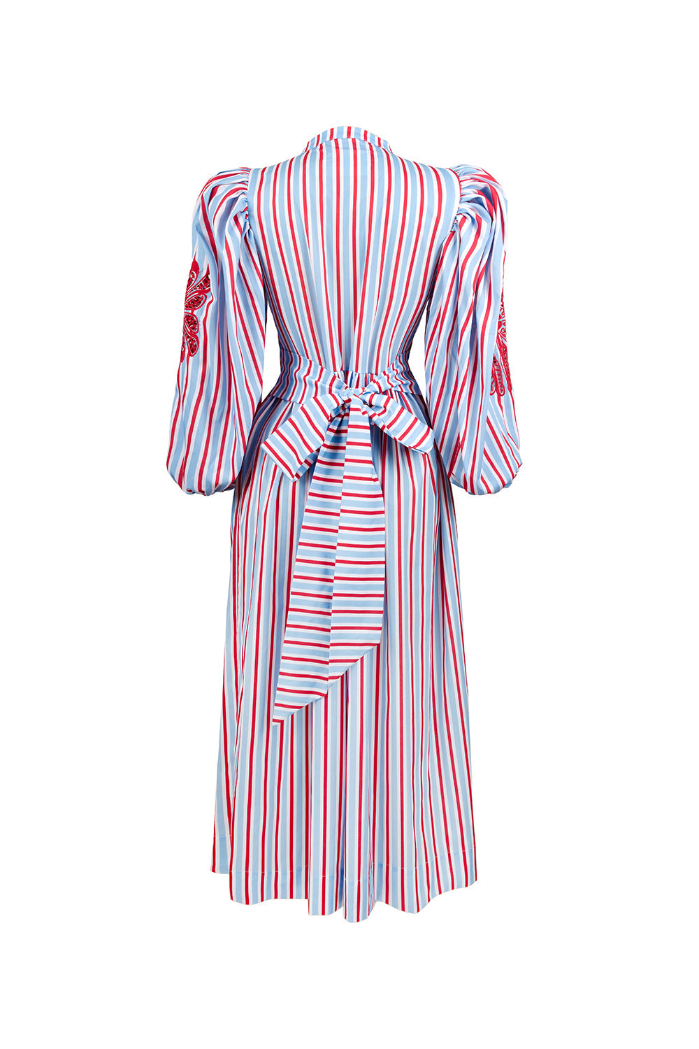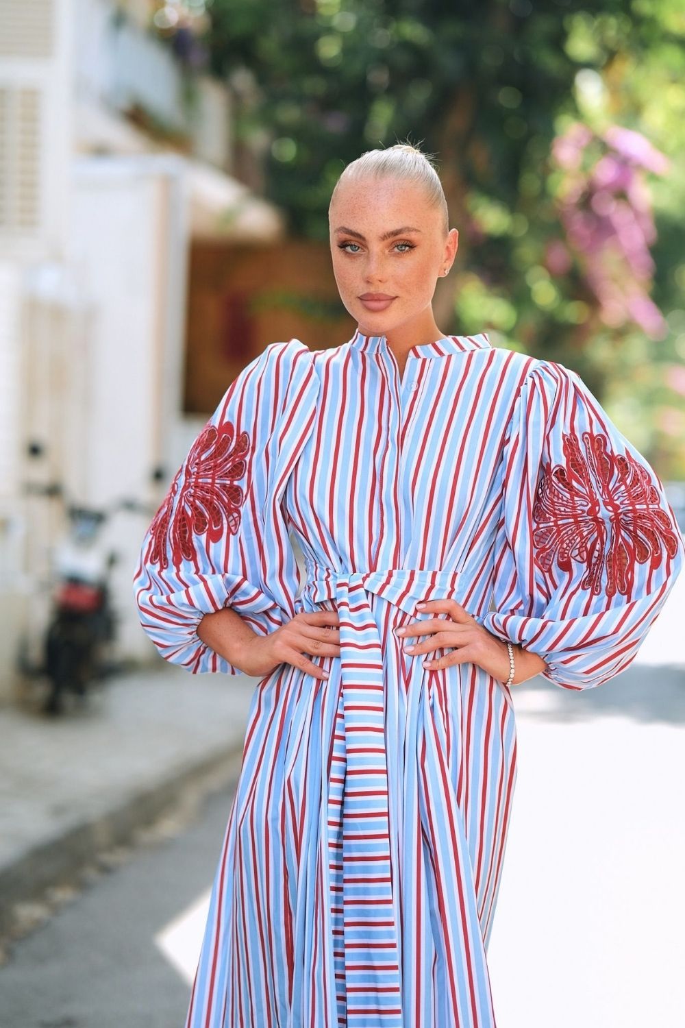 Şıklığı ve rahatlığı buluşturan Roma Maxi Elbise, hafif kumaşıyla gün boyu konfor sağlar. Dikey çizgili deseni sayesinde boyunuzu uzun ve zarif gösterirken, kollarındaki zarif nakış detayları modern bir dokunuş katıyor.