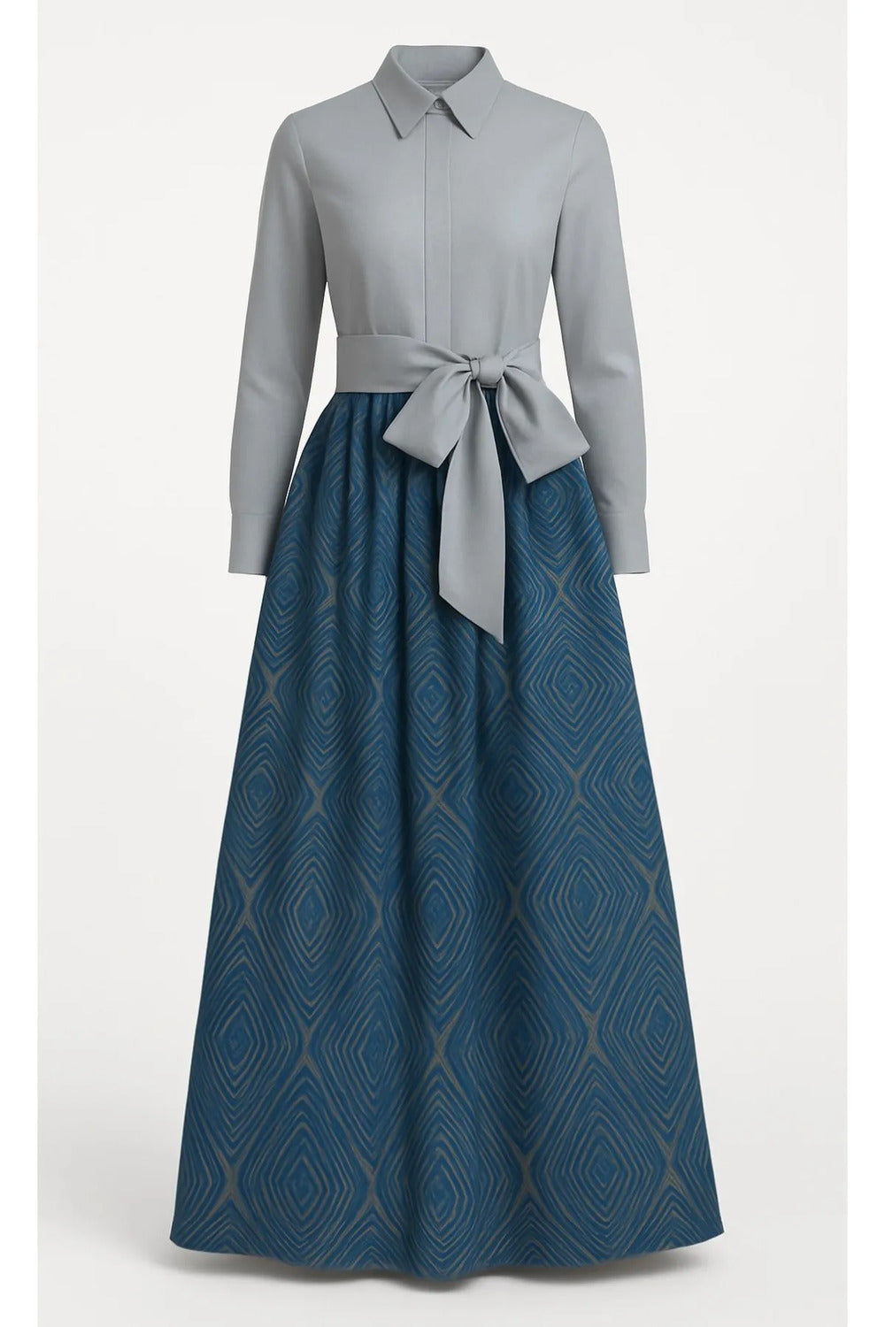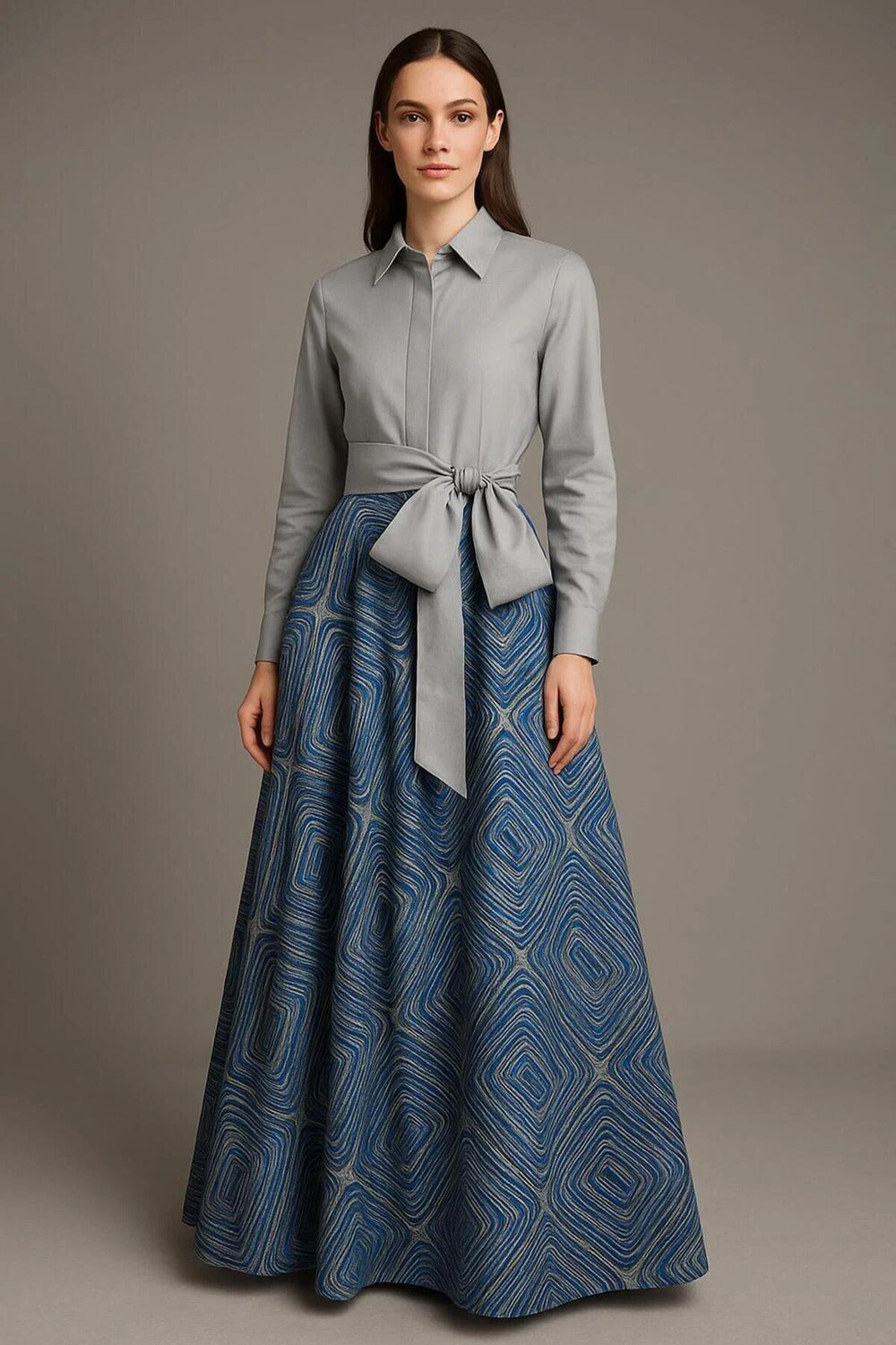 Açık Gri Tafta & İpek Brokar Kumaş Mix'li Şık Gömlek Elbise