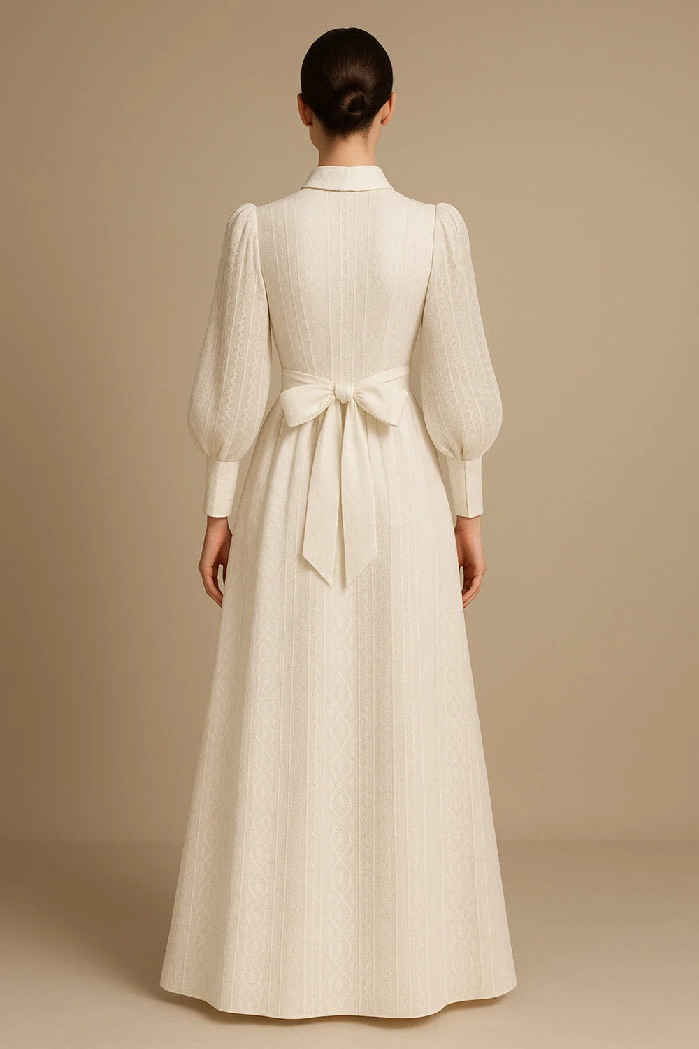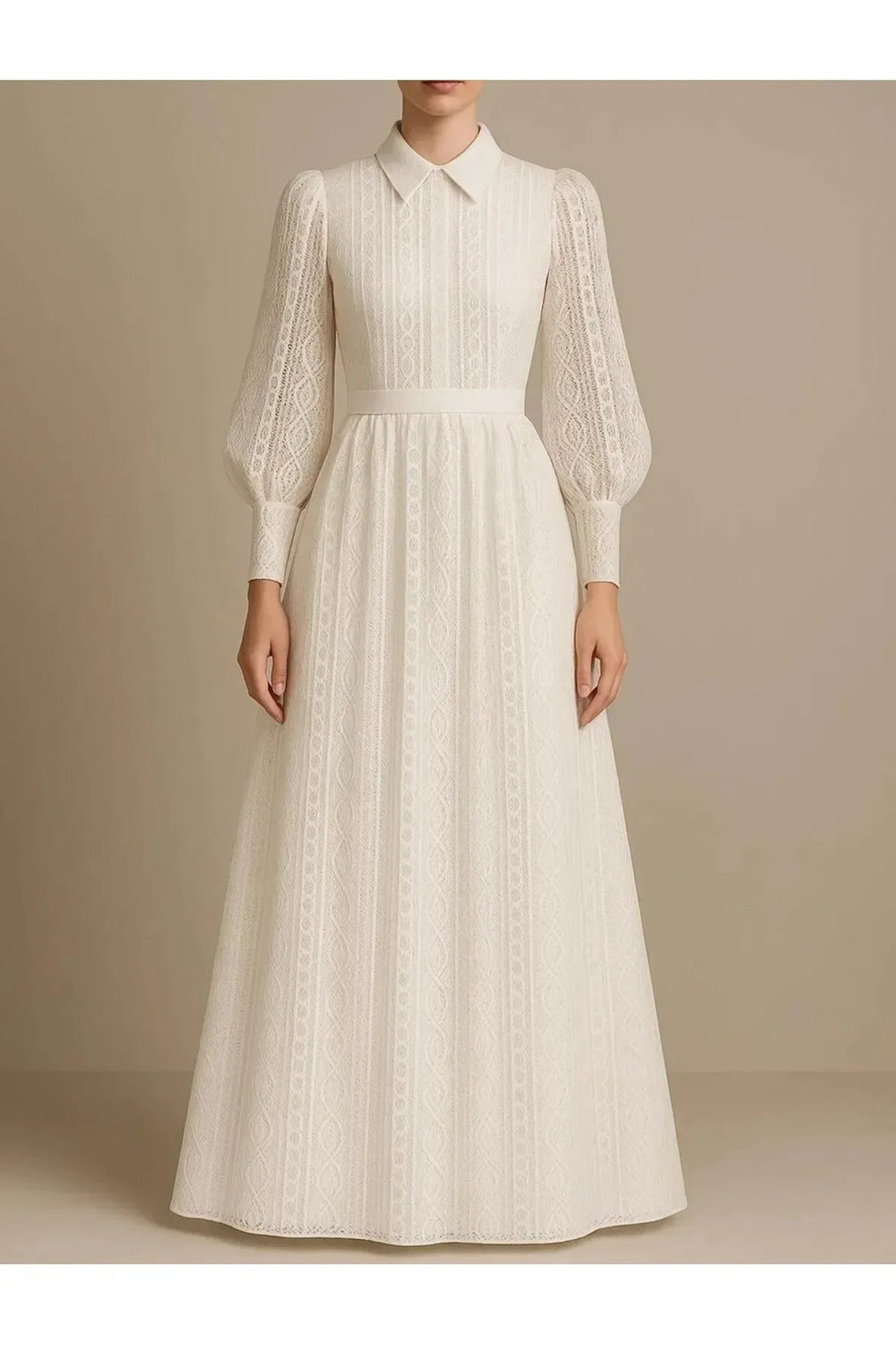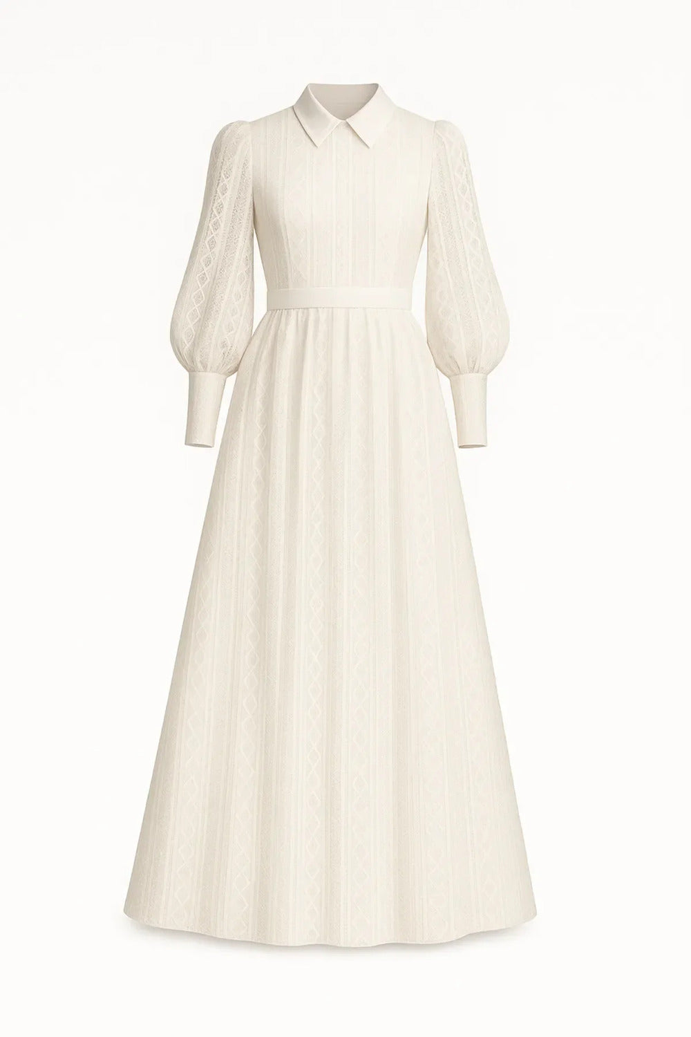 Beyaz Şeritli Dantel Kaplamalı Amerikan Saten Maxi Şık Gömlek Elbise