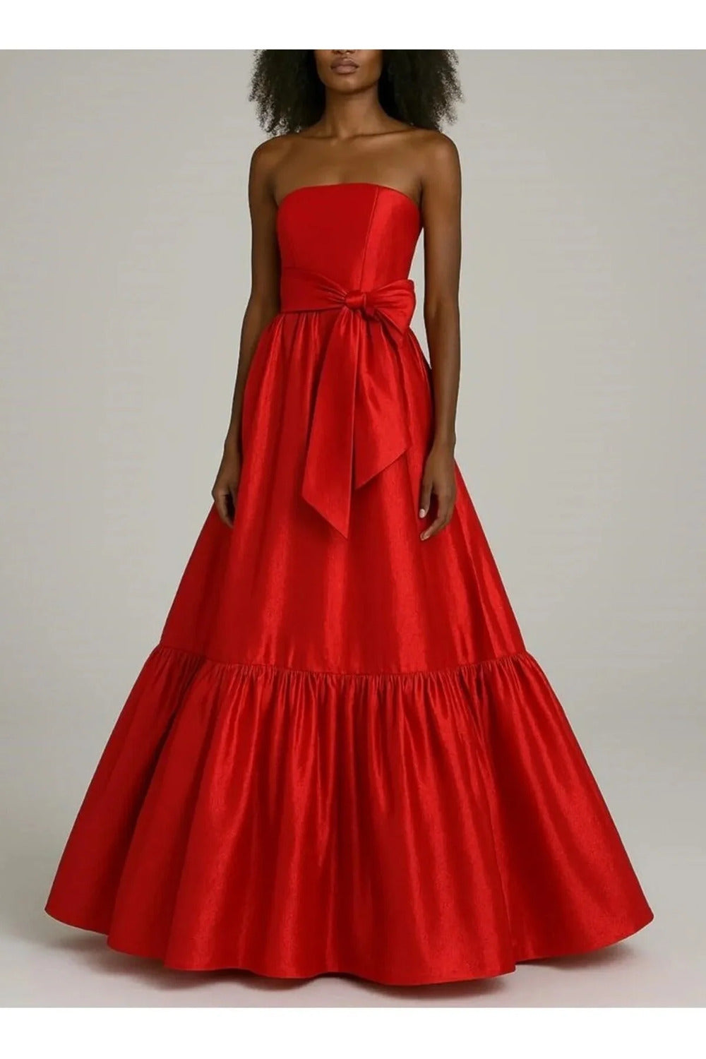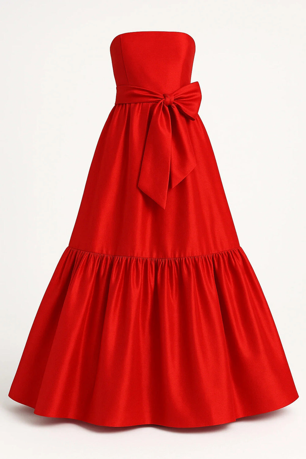 Fırfır Detaylı Kırmızı Tafta Maxi Boy Straplez Elbise