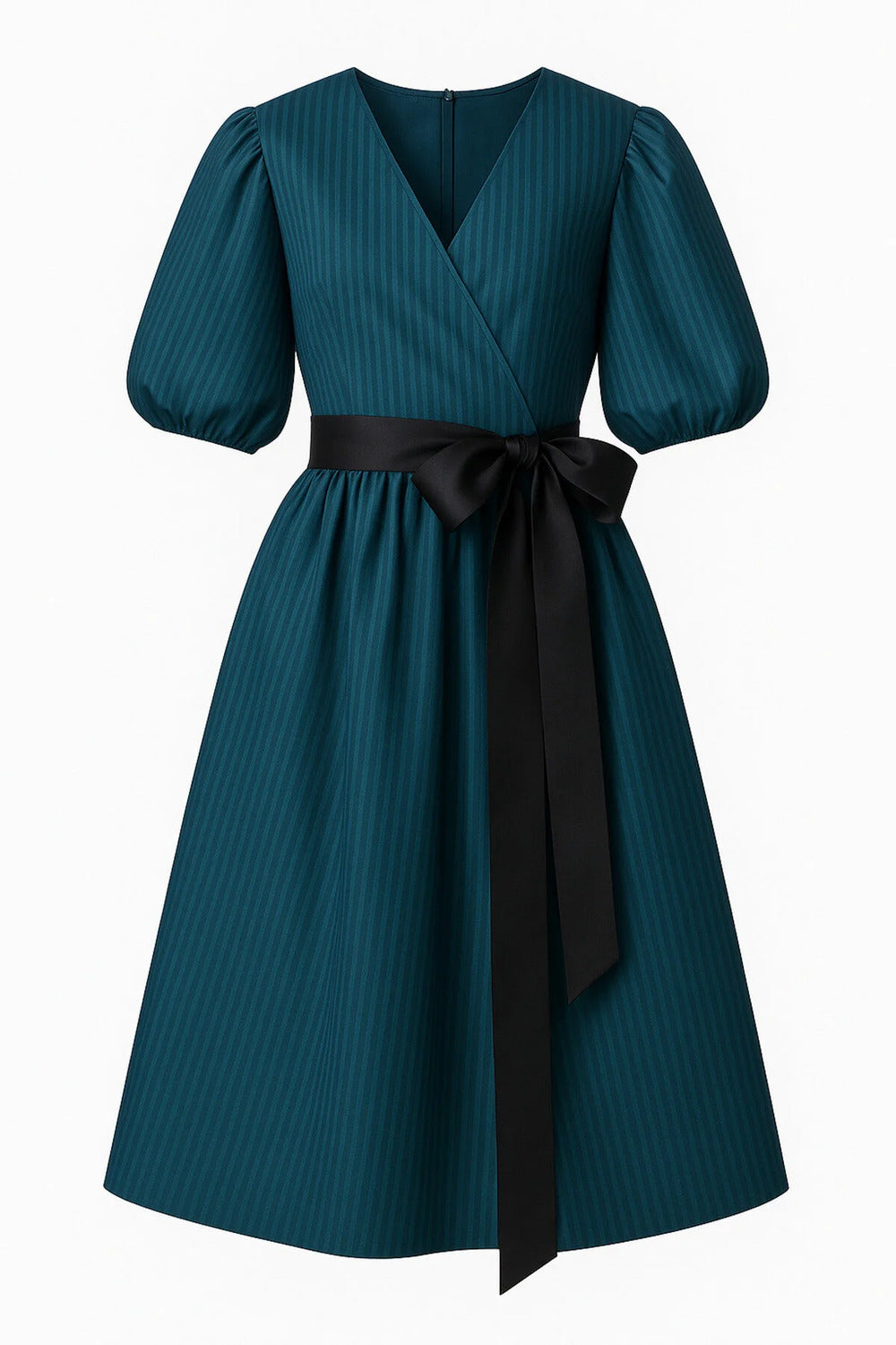 Kruvaze Kapamalı & Balon Kollu Çizgili Desenli Ipek Tafta Kısa Elbise
