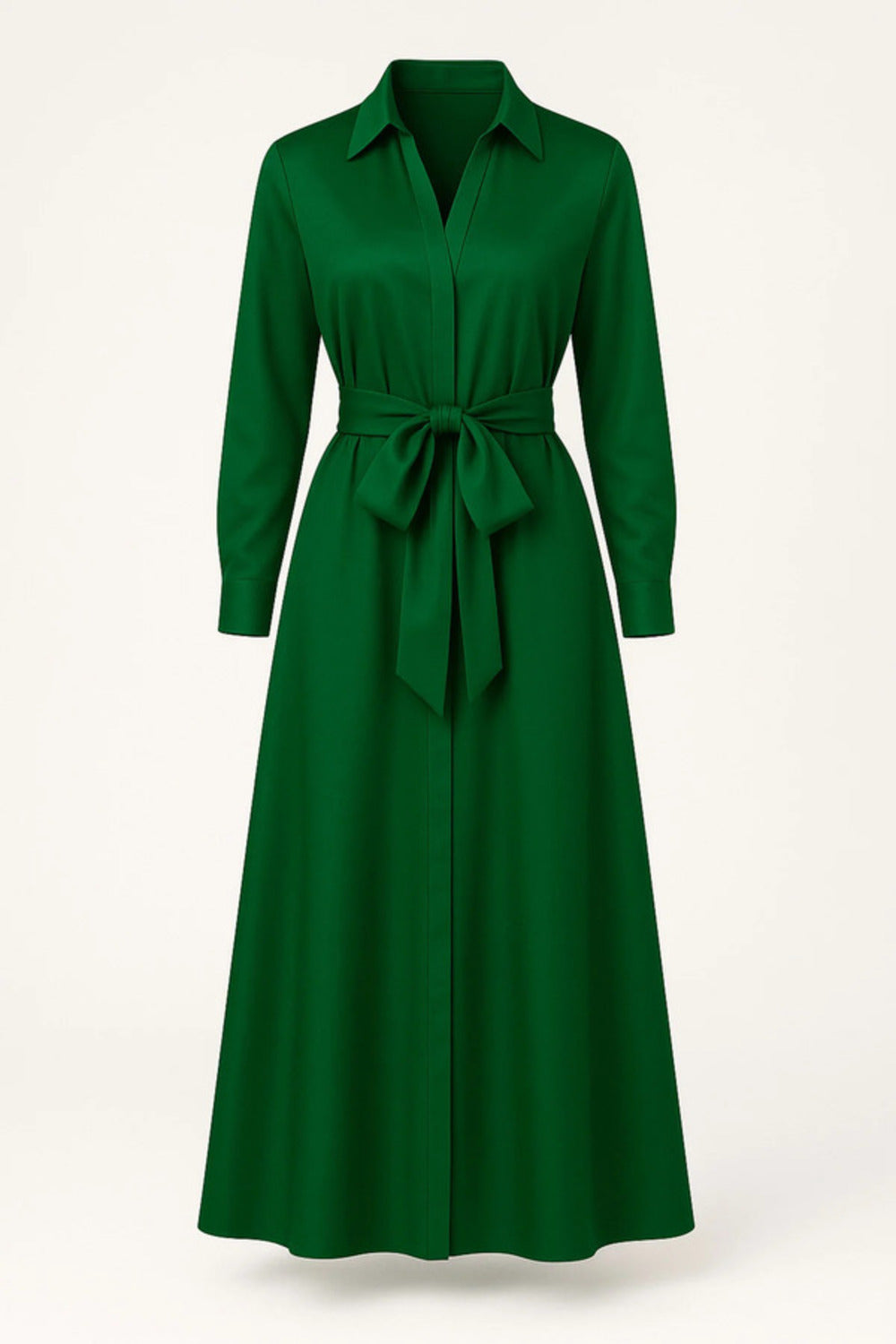 Kuşaklı Ördek Başı Yeşili Saten Gömlek Elbise