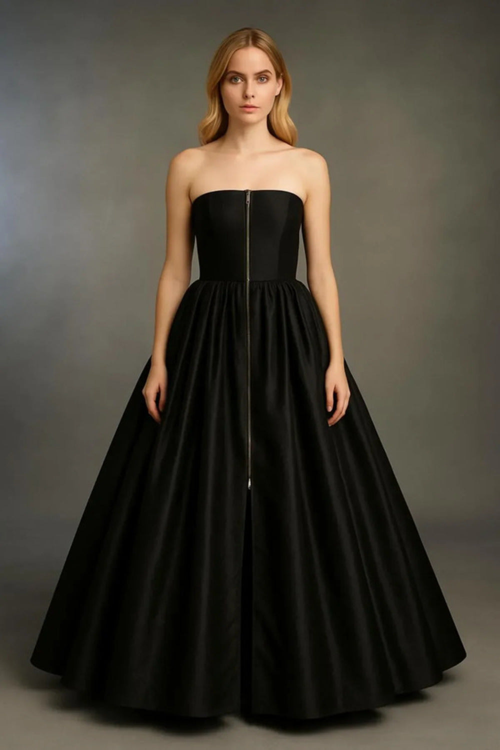 Önden Separe Fermuar Detaylı Maxi Boy Siyah Tafta Straplez Elbise