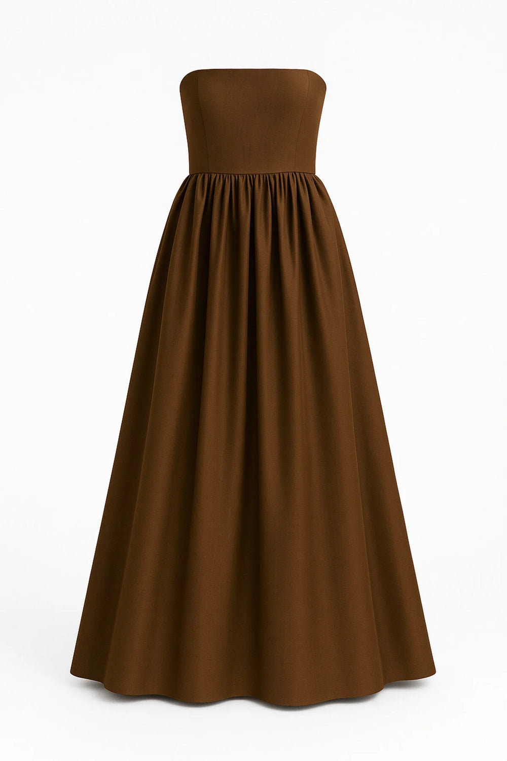Tam Daire Açılımlı & Büzgülü Kahverengi Tafta Straplez Elbise