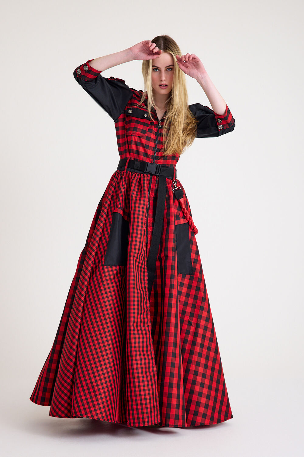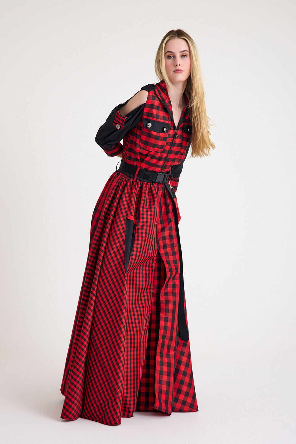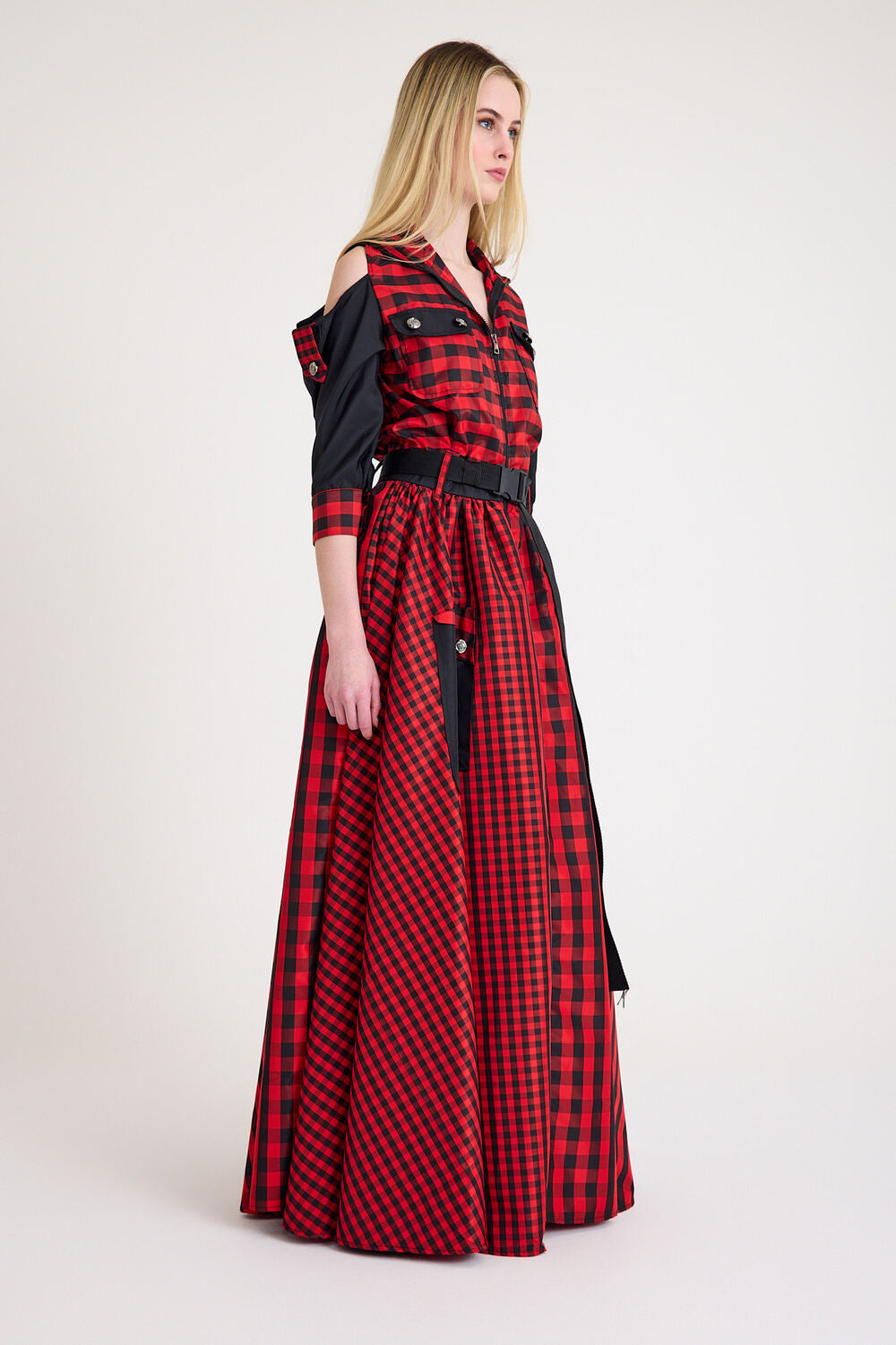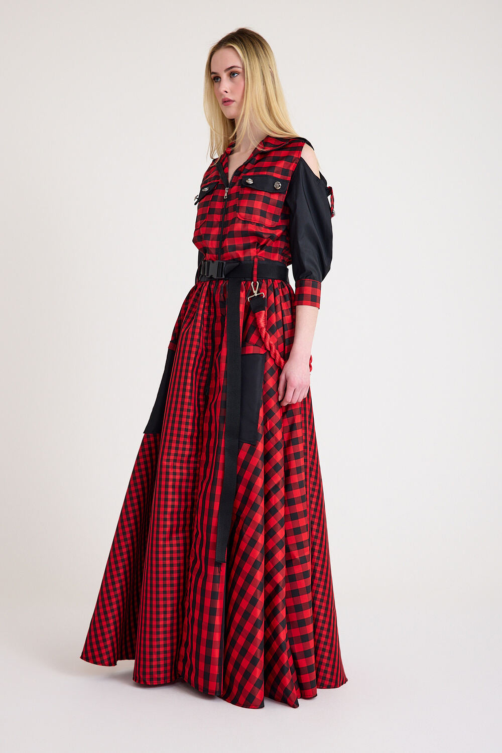 Utility Detaylı & Önden Fermuarlı Kırmızı&Siyah Kareli Tafta Maxi Elbise