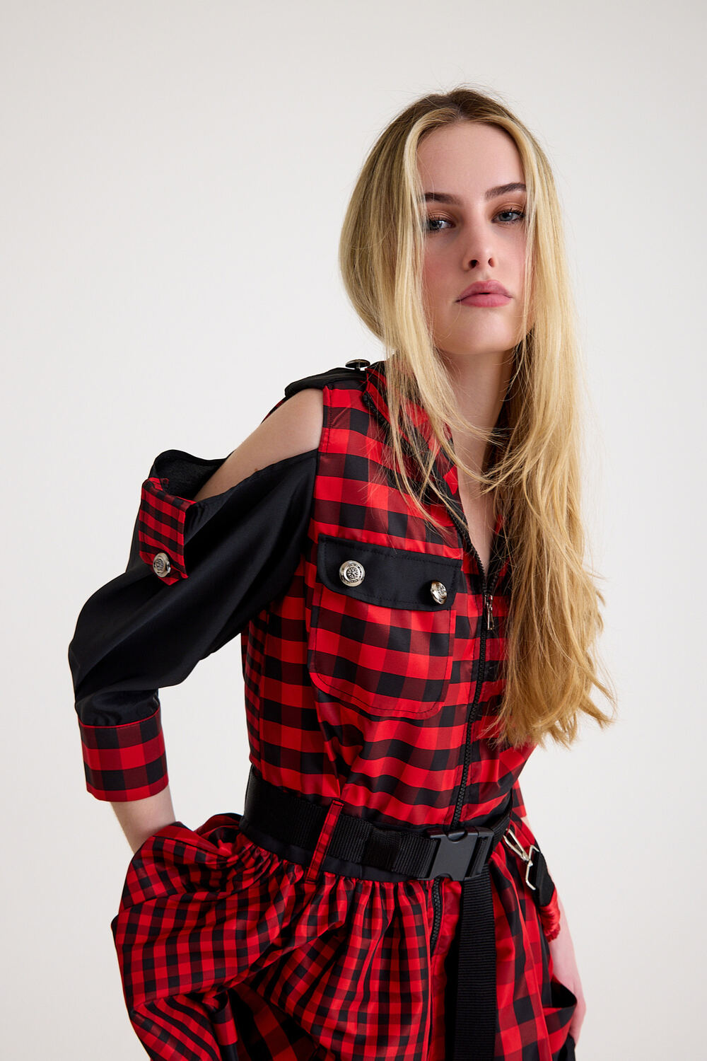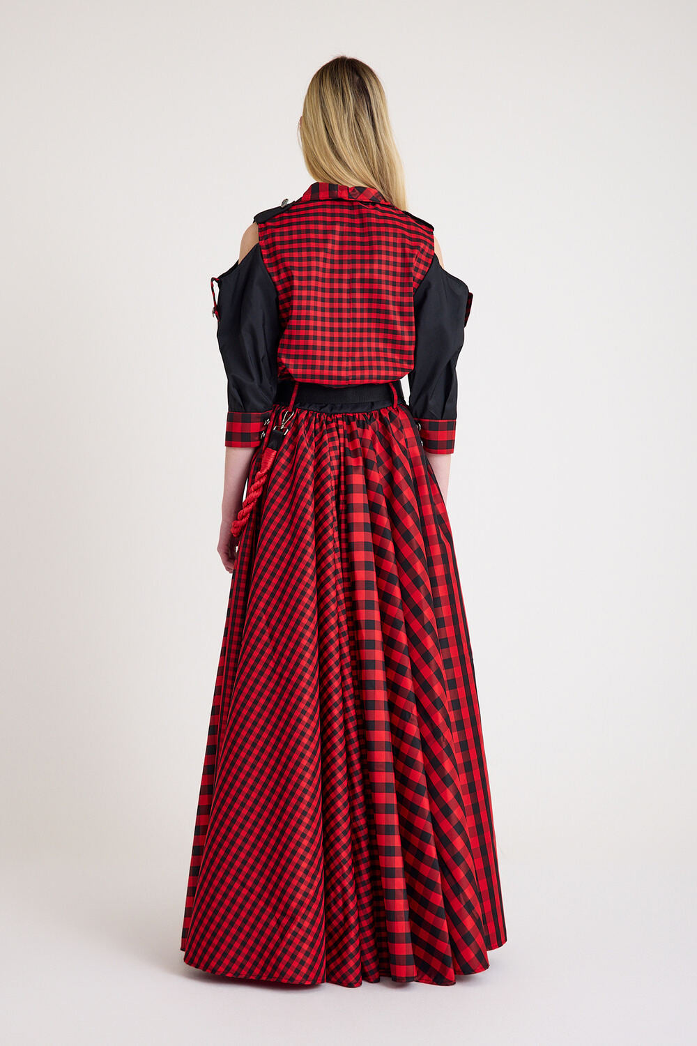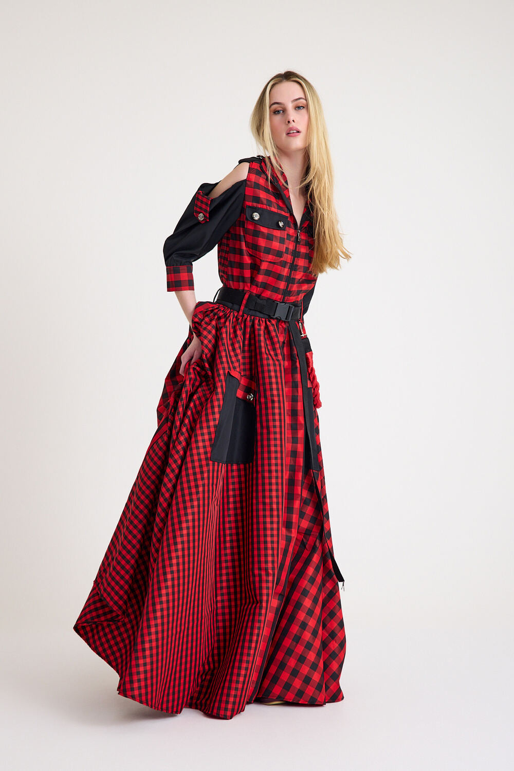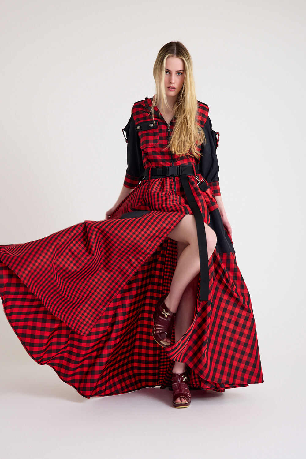 Utility Detaylı & Önden Fermuarlı Kırmızı&Siyah Kareli Tafta Maxi Elbise